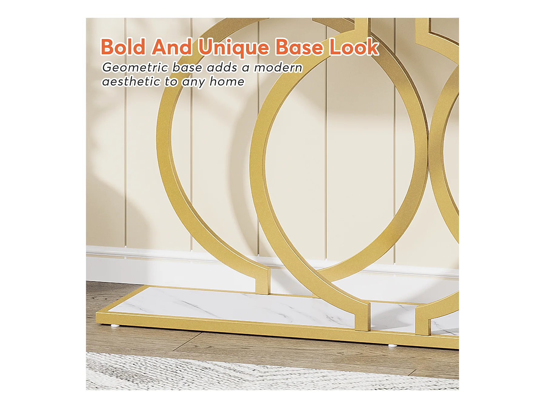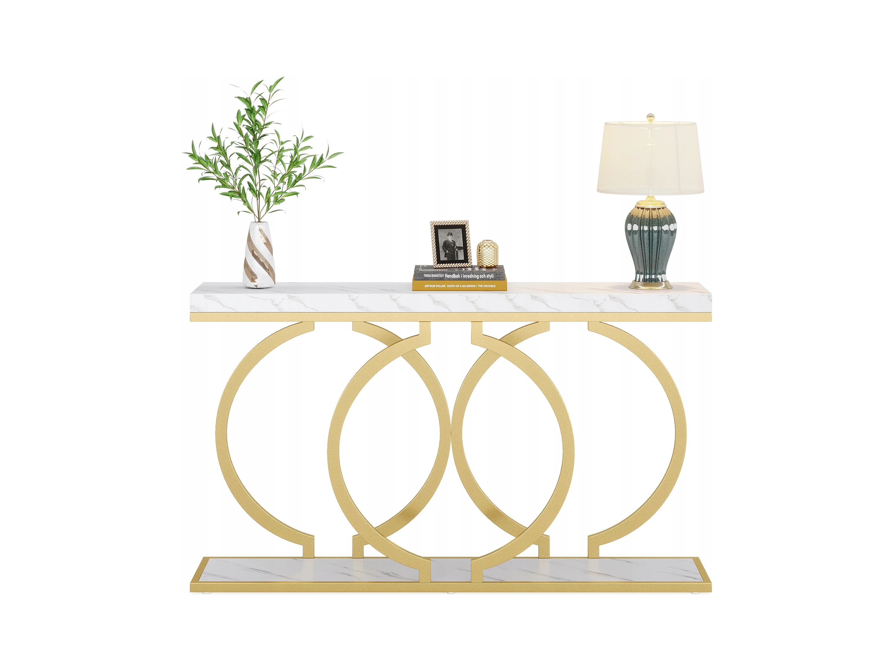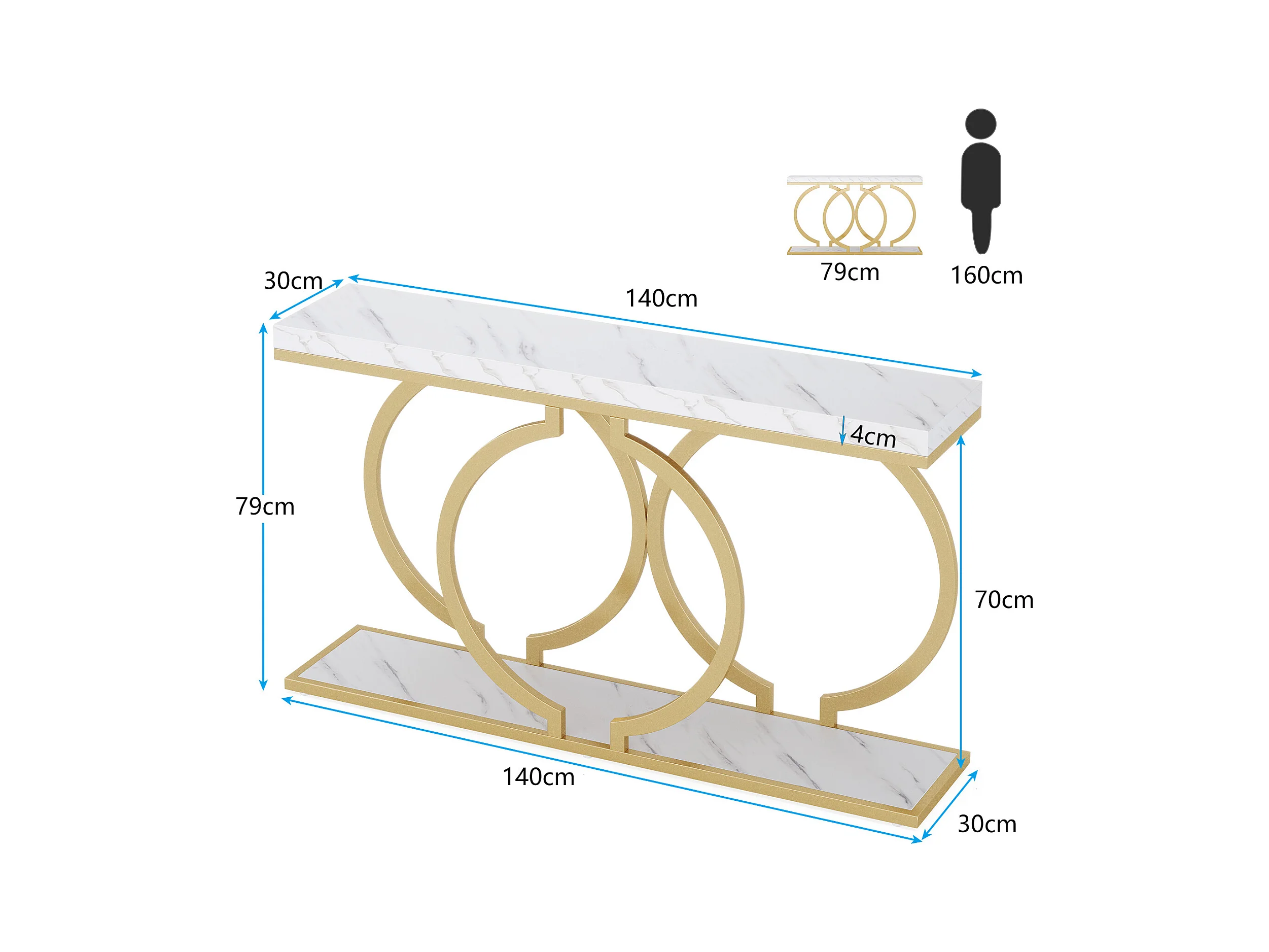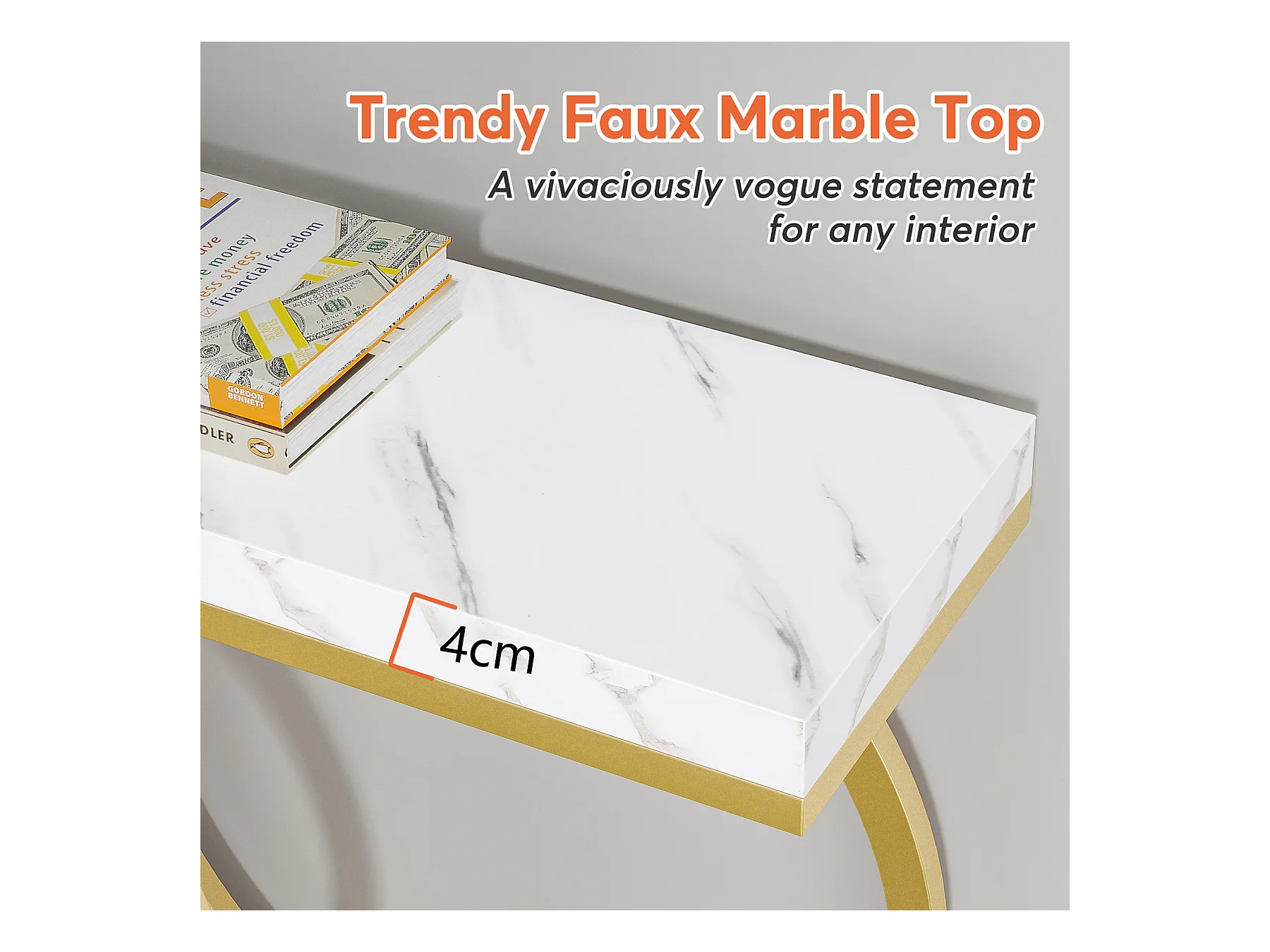 Table Console dorée de 140 cm, Table d'entrée Moderne avec Pieds en métal doré en Forme de O, Imitation marbre Blanc, Table d'entrée pour Salon