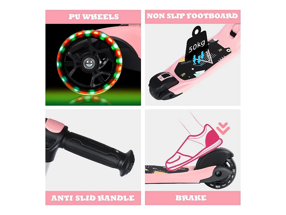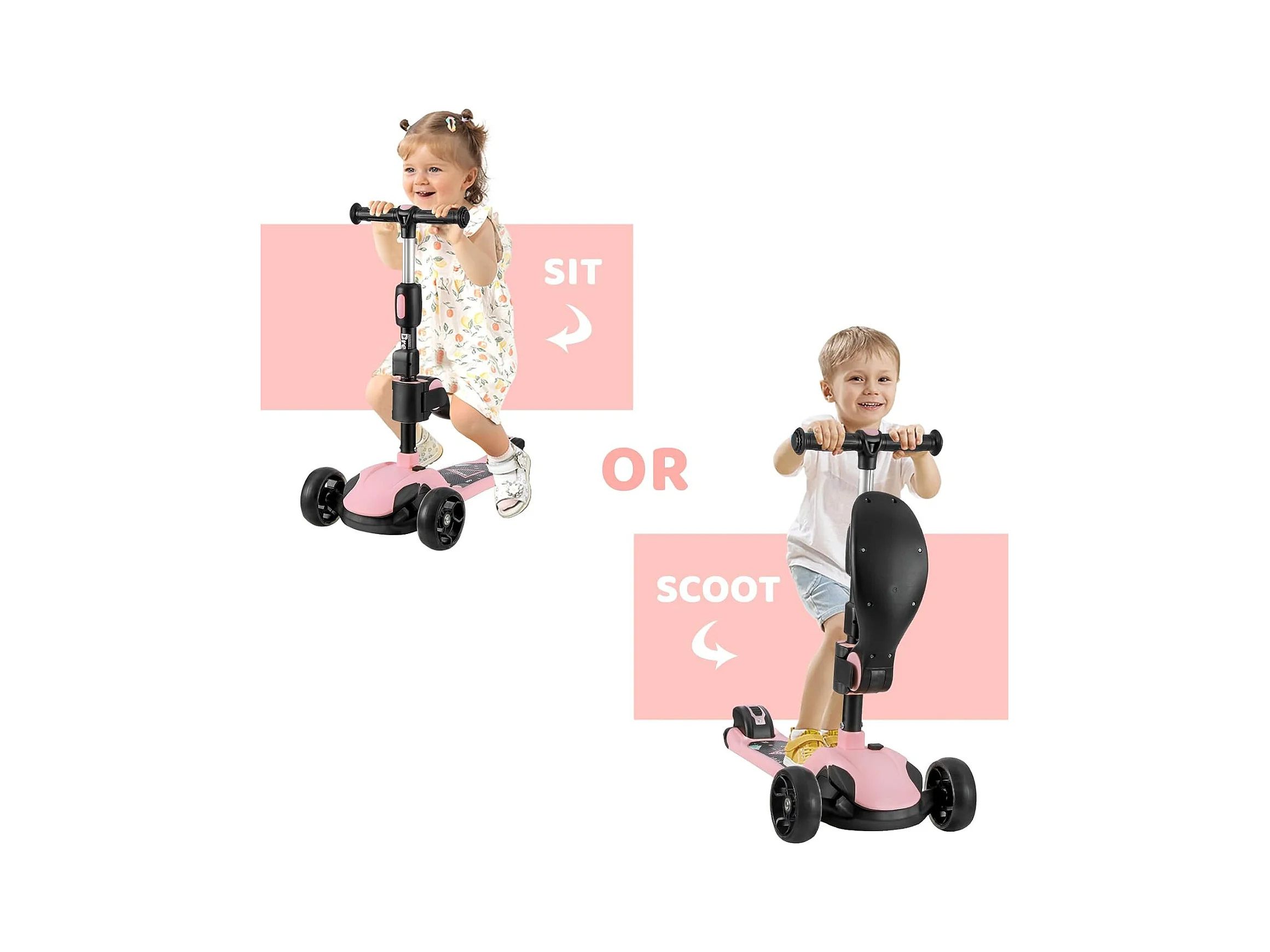 Trottinette 3-en-1 pour Enfant avec Siège Amovible, Grandes Roues LED, Réglable en Hauteur à partir de 2 Ans, rose