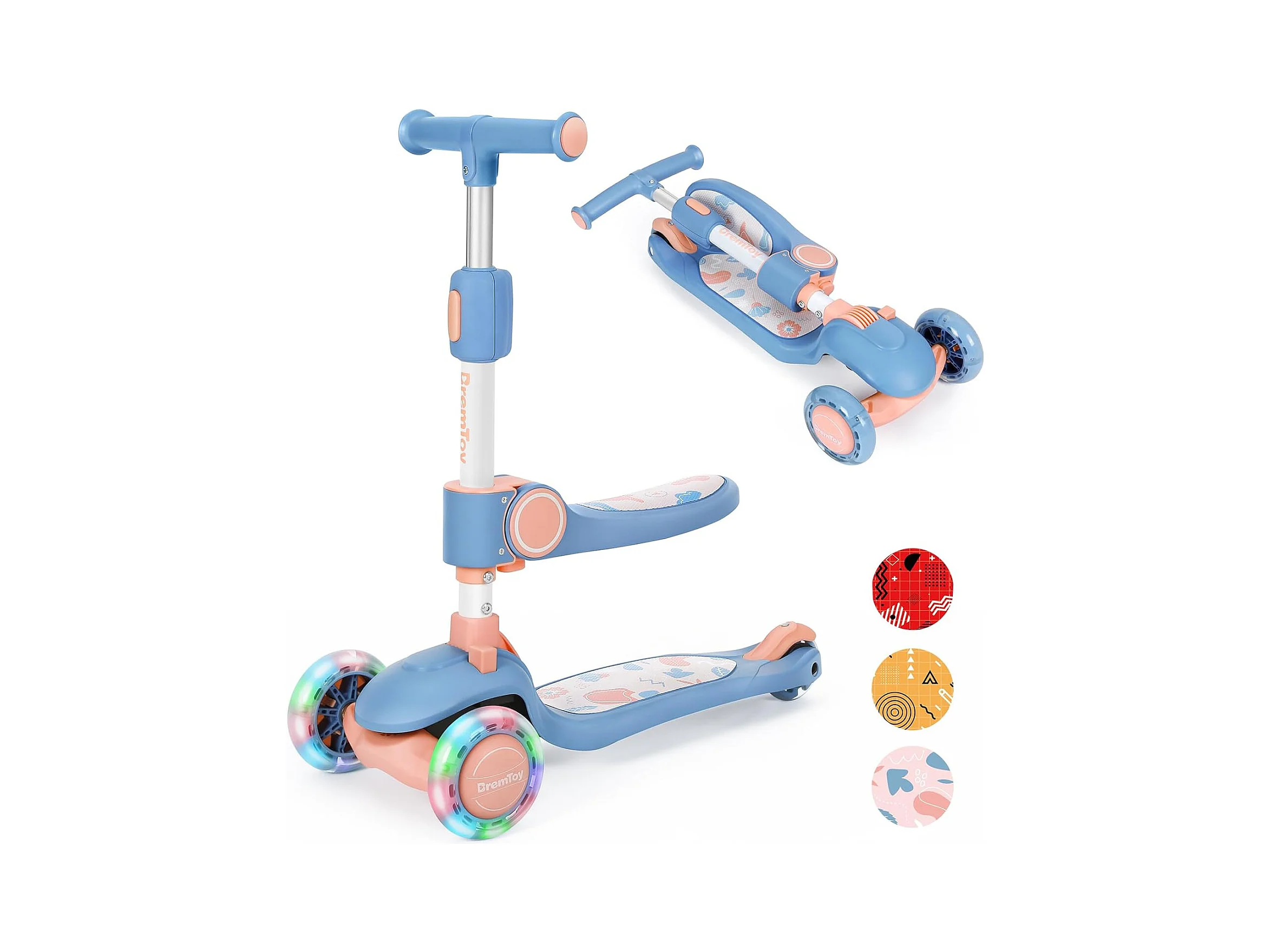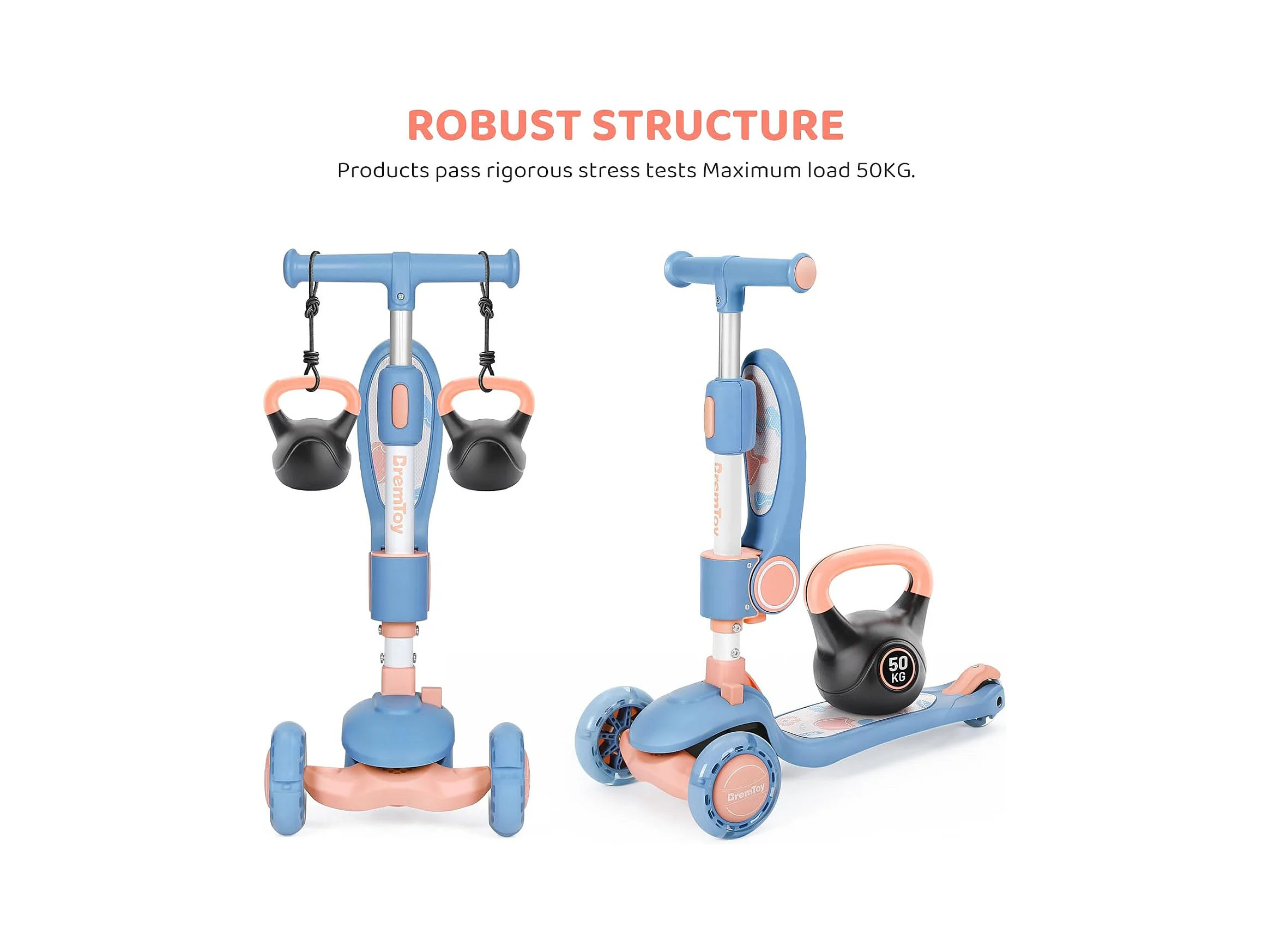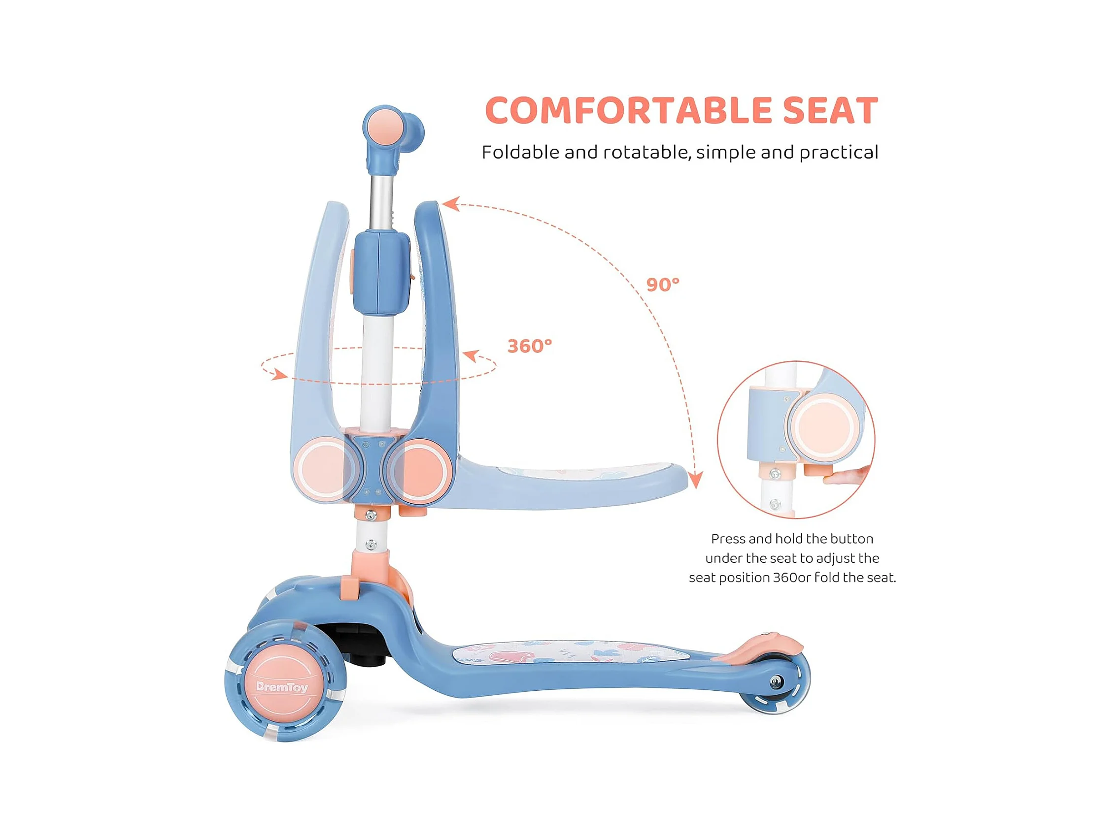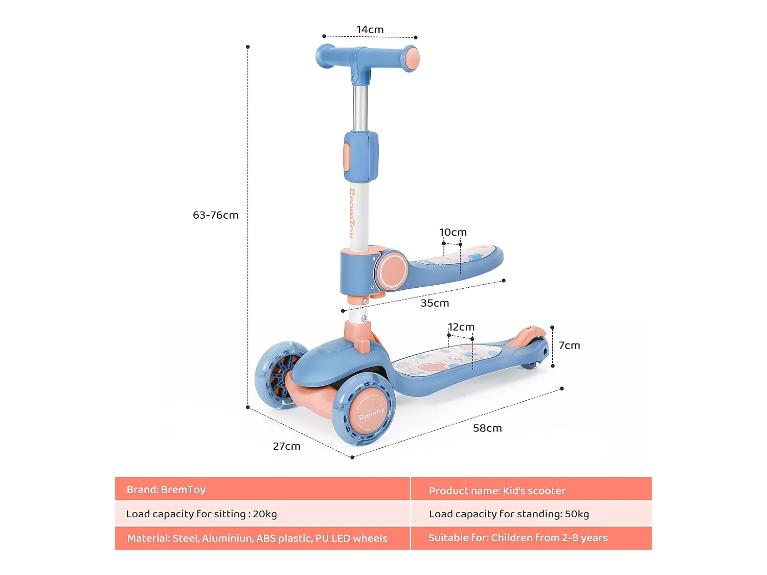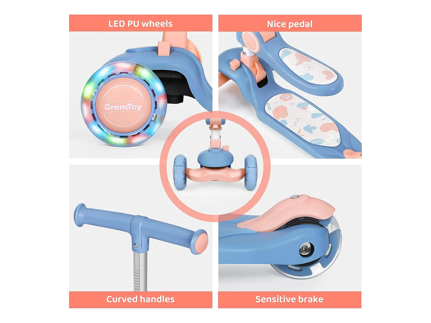 Trottinette Enfant Pliable BremToy avec Siège, Roues LED et Guidon Réglable en Hauteur pour 2-8 Ans