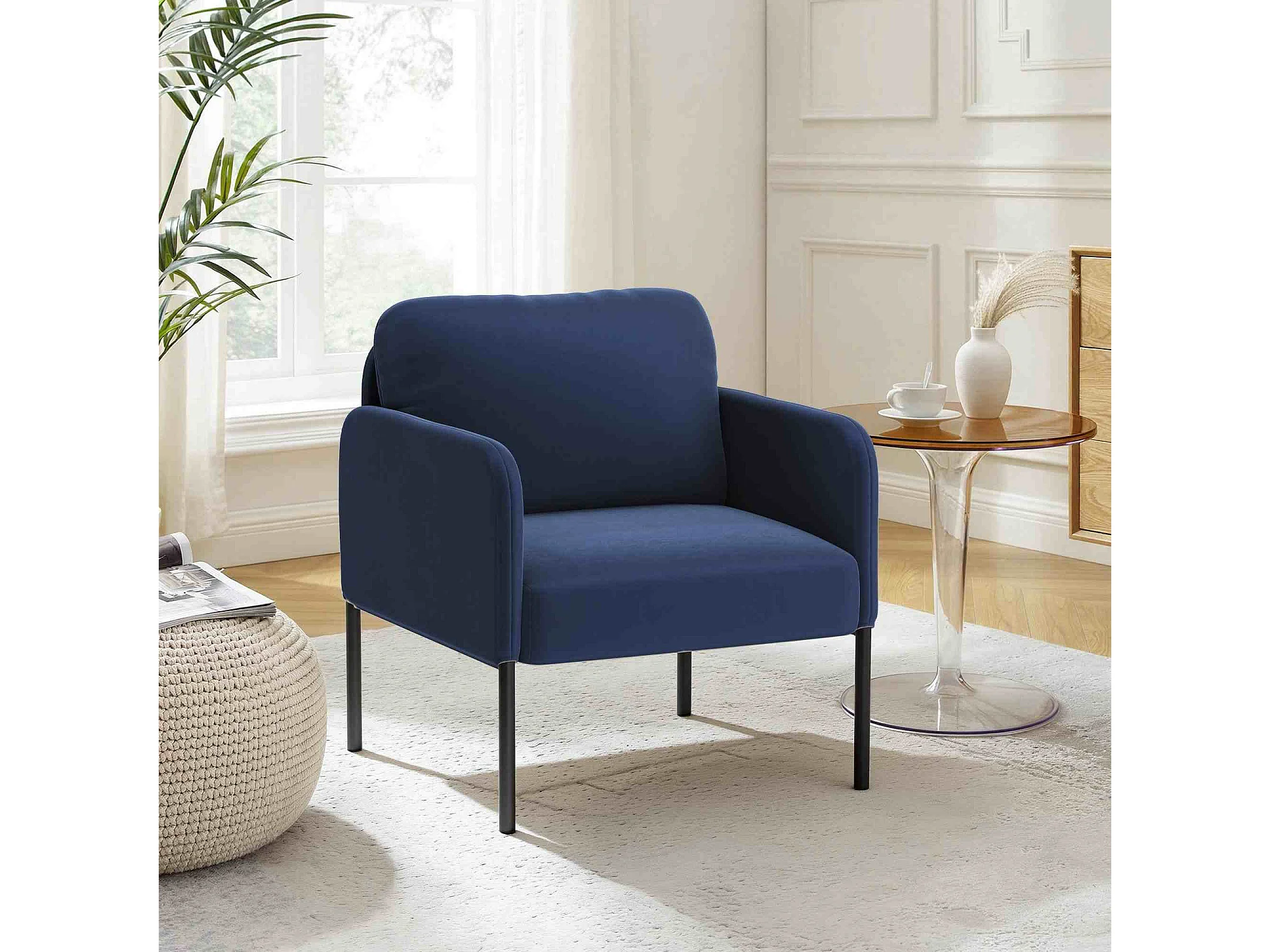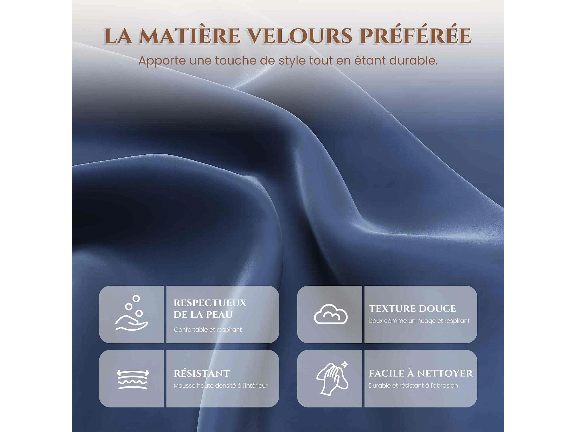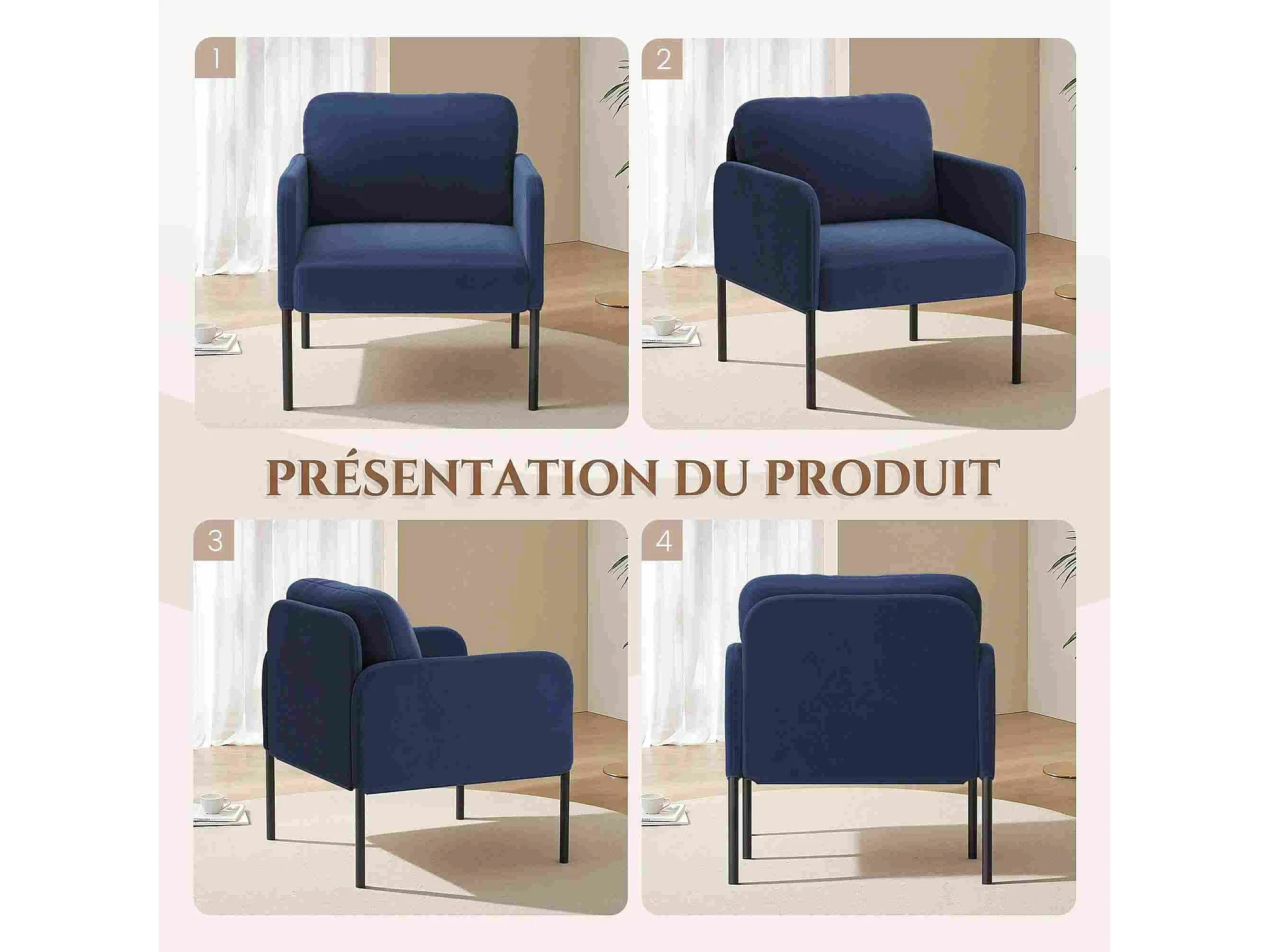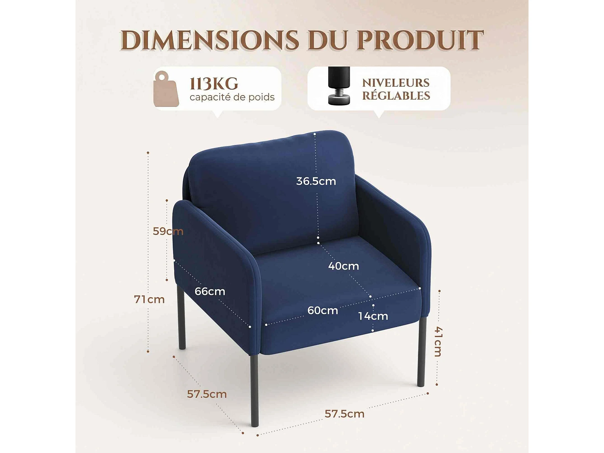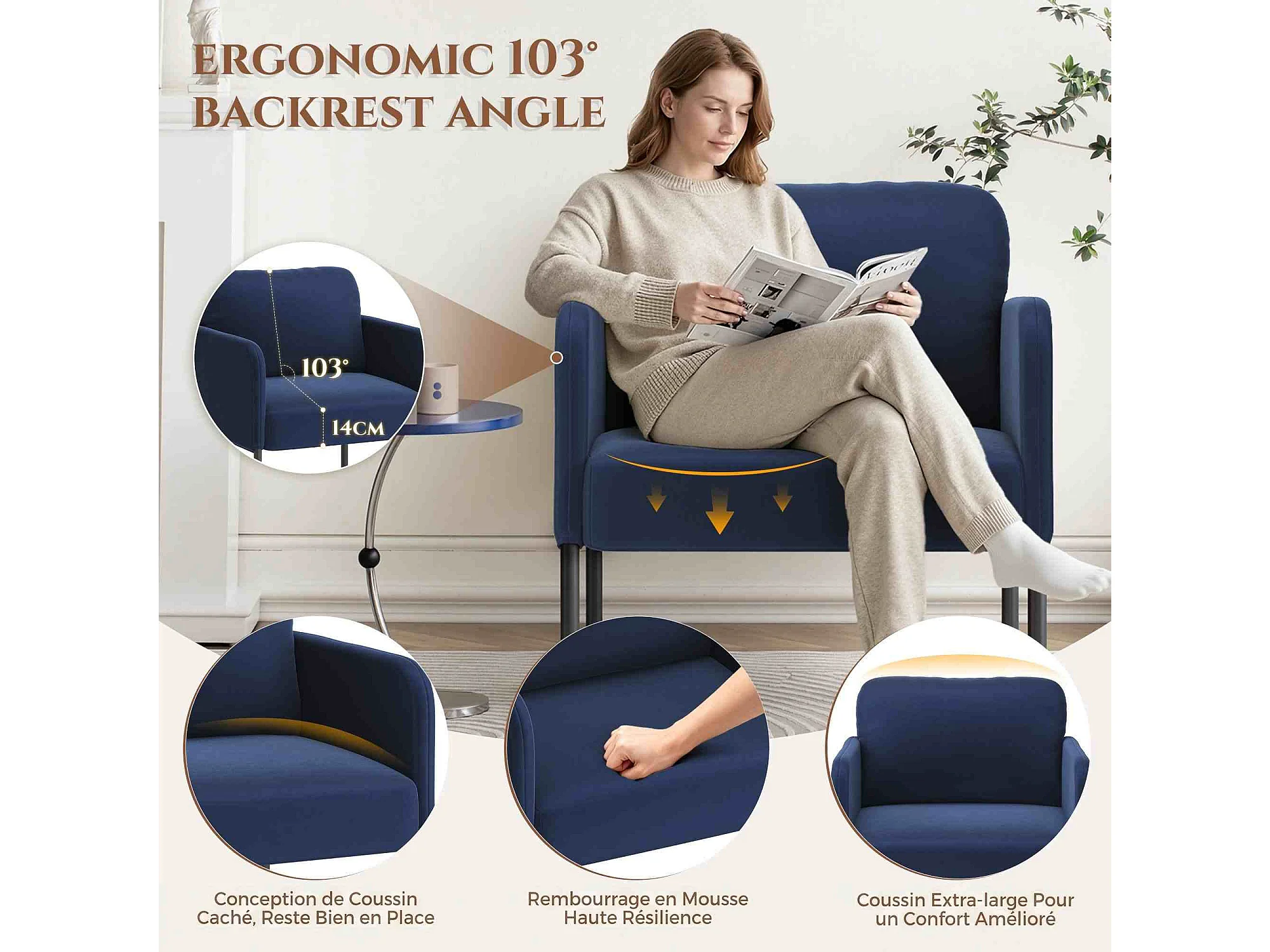 Fauteuil de salon haut dossier rembourré en velours bleu, pieds en métal, coussin extra large