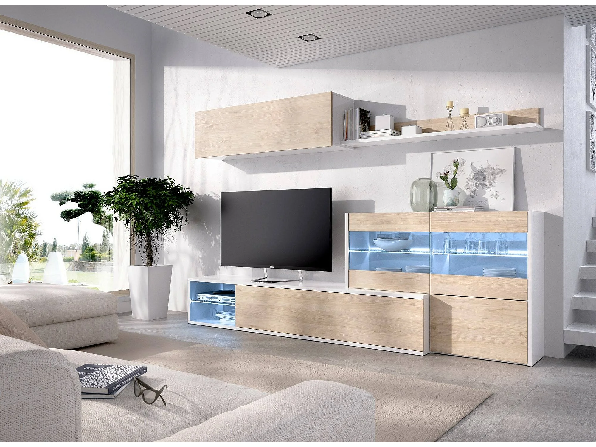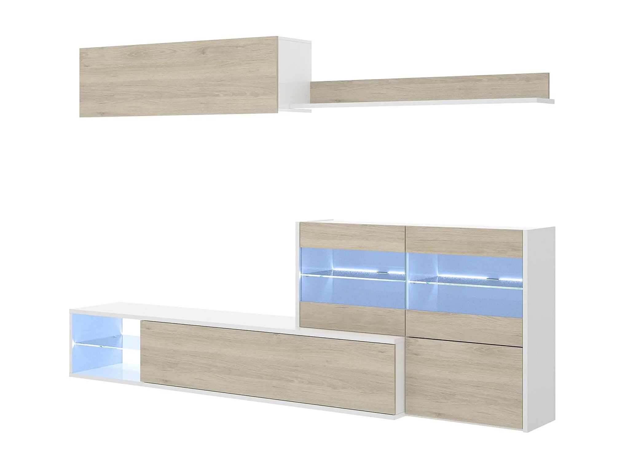Système mural Adams, Ensemble de salon d'angle modulable, Meuble de salon multi-positions avec lumière LED, 260x41h180 cm, Chêne et Blanc