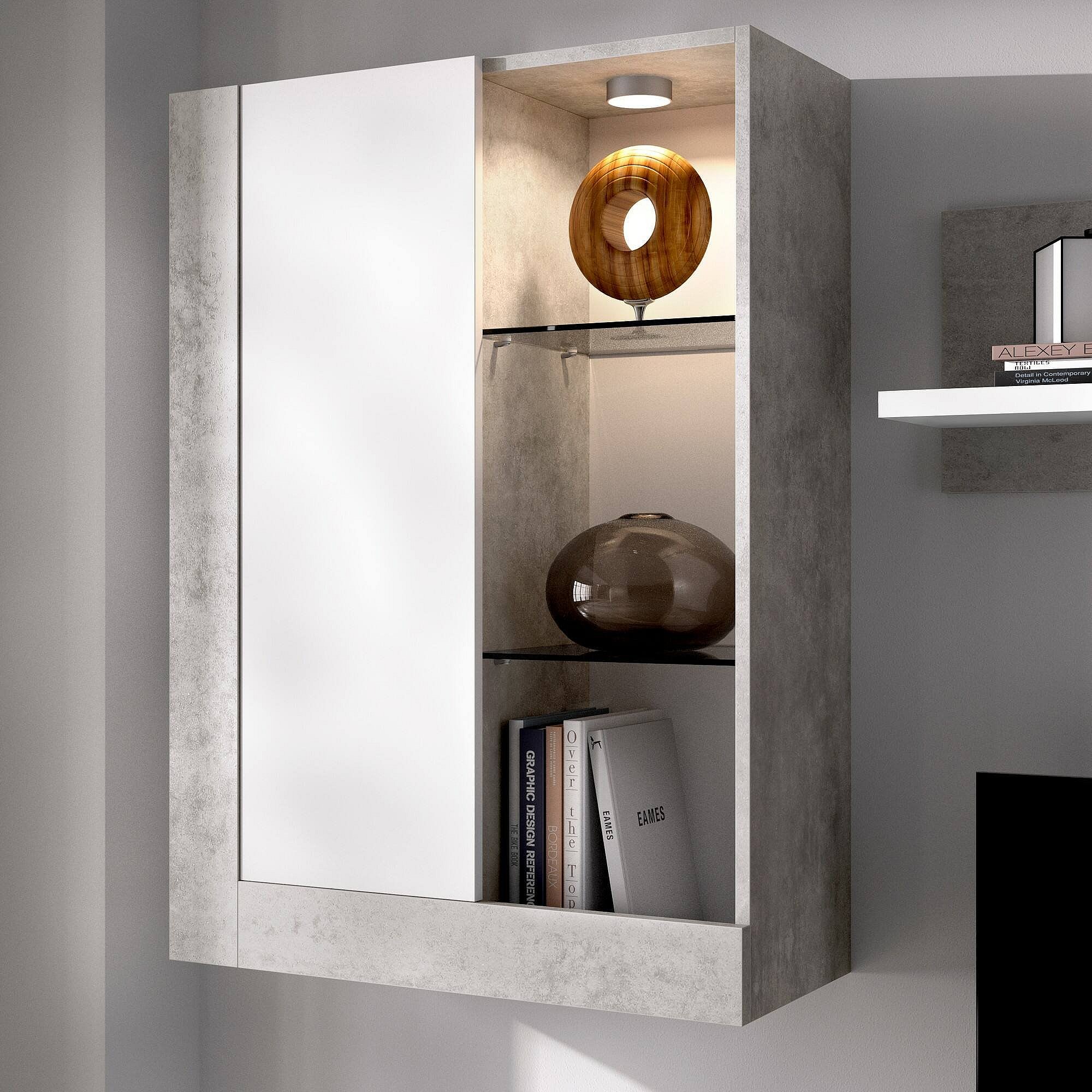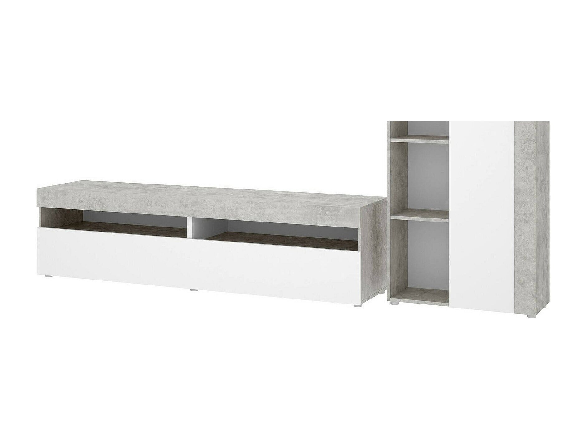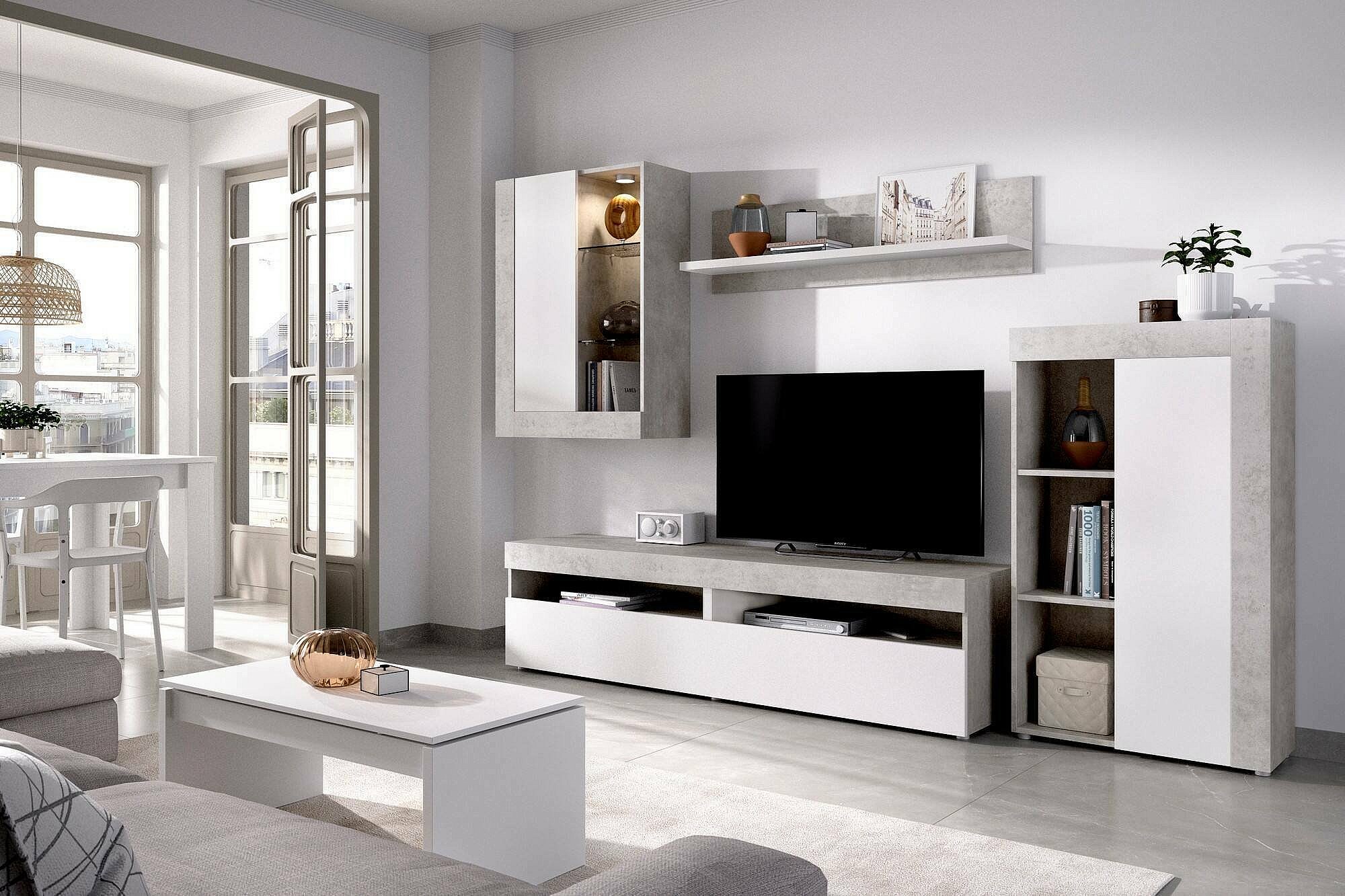 Système mural Beverin, Ensemble de salon modulable, Meubles de salon multi-positions, 265x42h180 cm, Blanc et Ciment