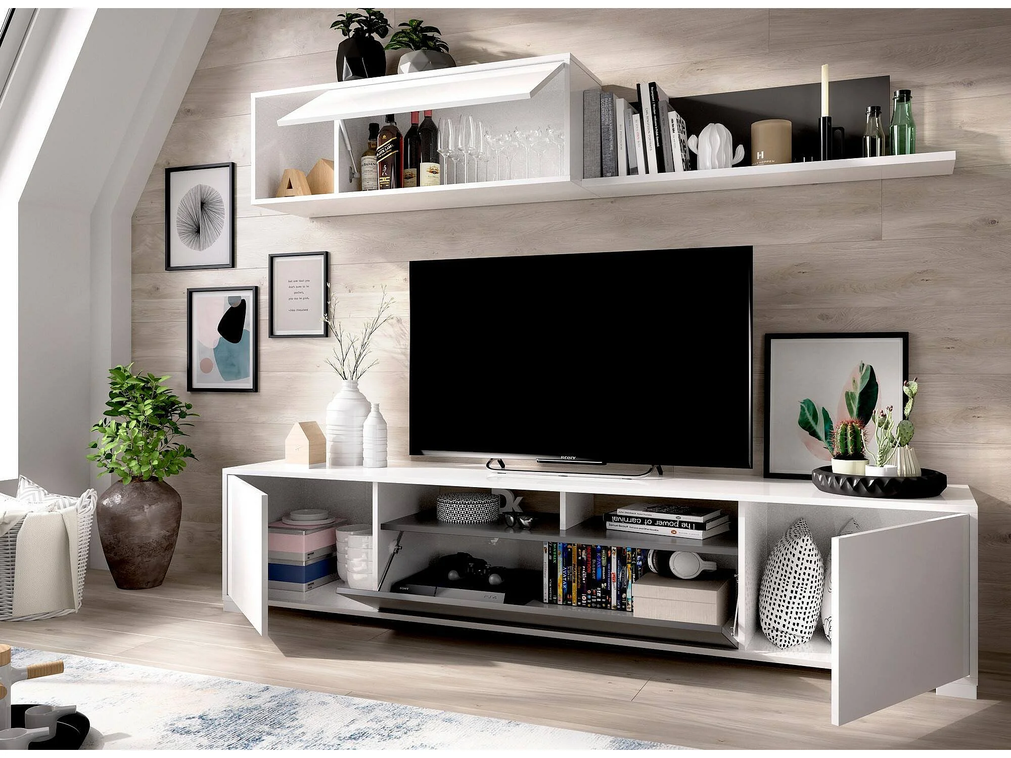 Système mural Dfalcon, meuble TV pour salon, meuble de salon polyvalent, 200x41h180 cm, blanc et anthracite
