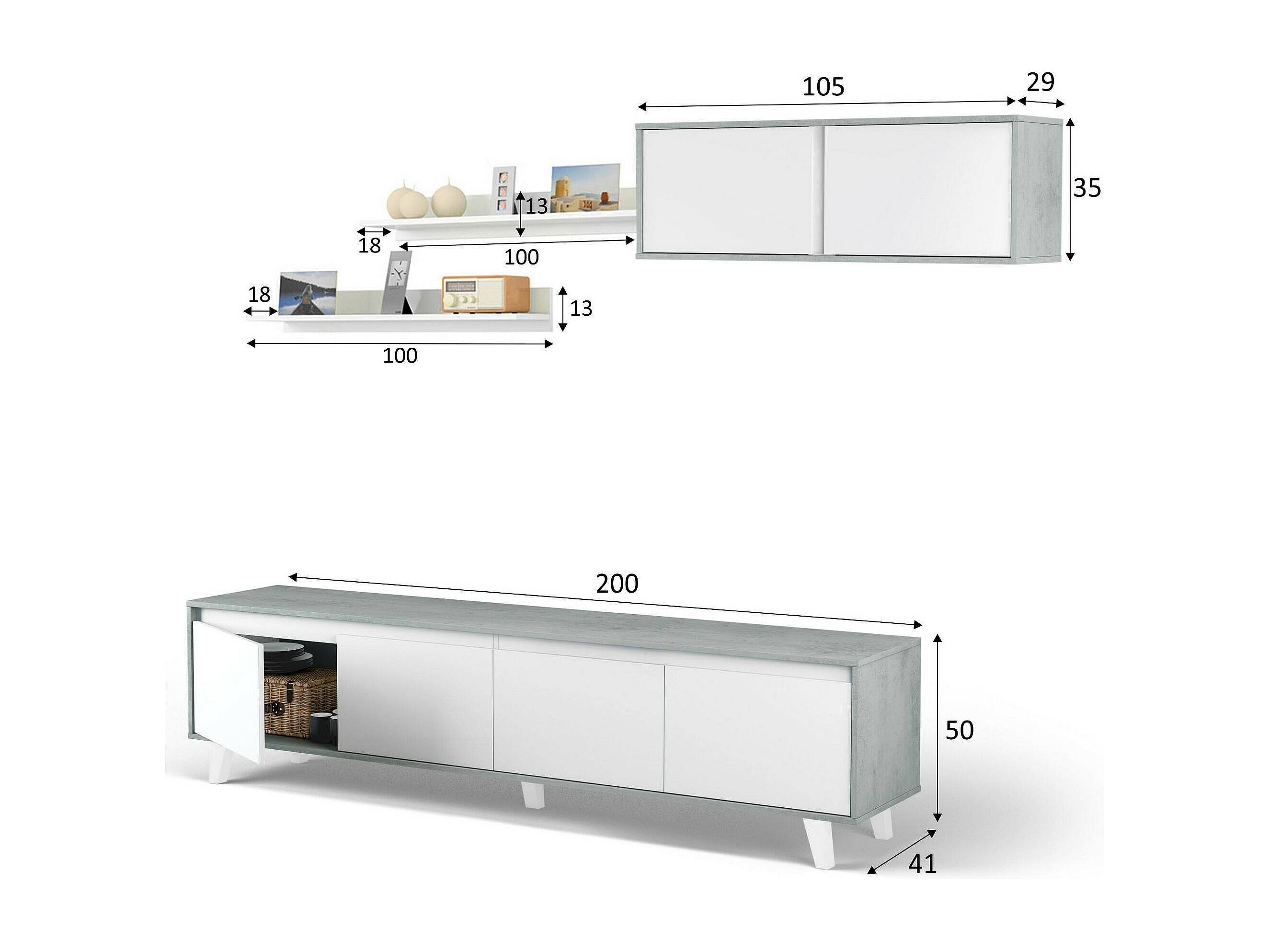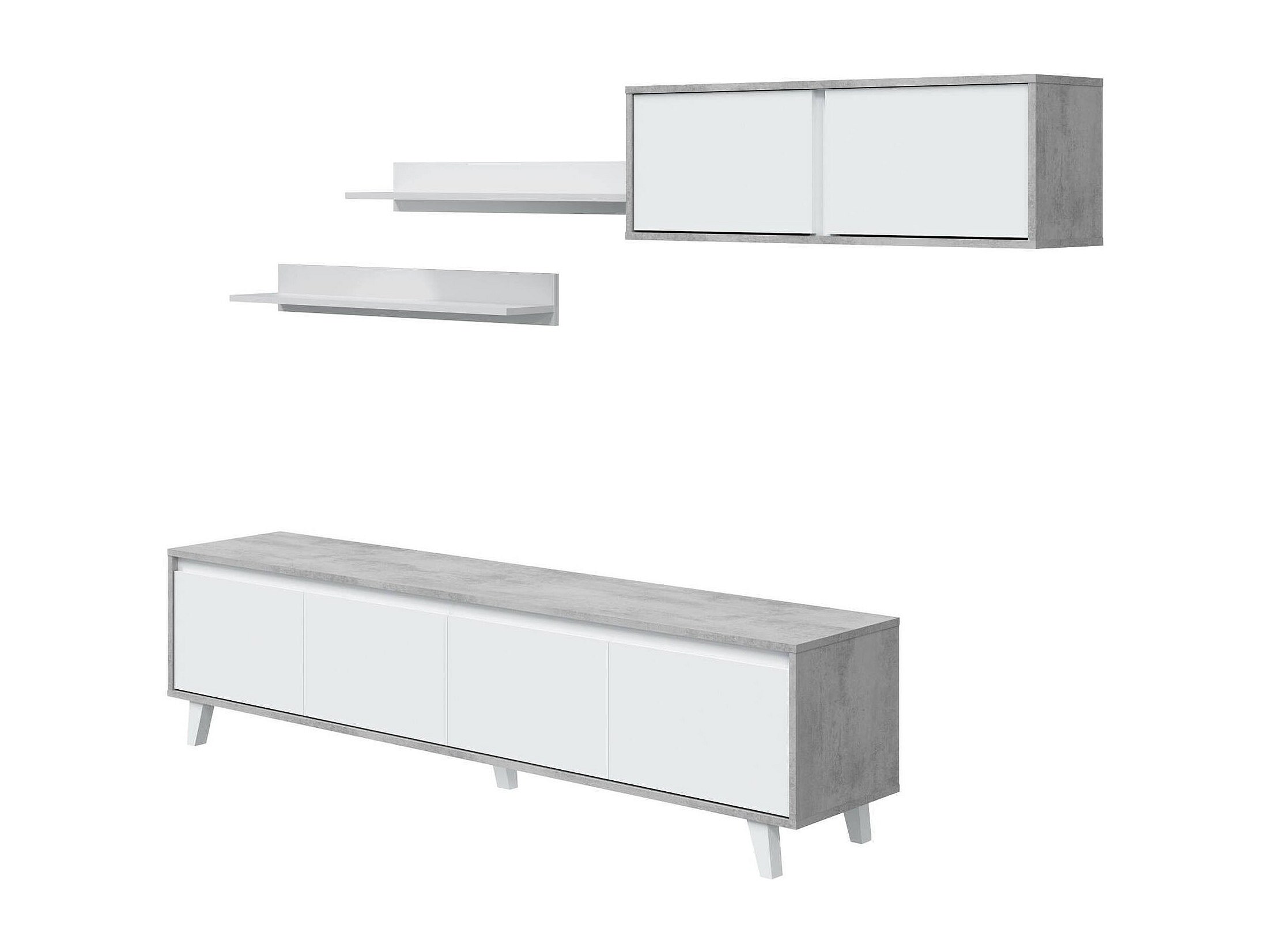 Mur de rangement Dmuldu, Ensemble de salon, Meubles de salon polyvalents, Mur de rangement moderne, 200x41h50 cm, Ciment et Blanc Brillant