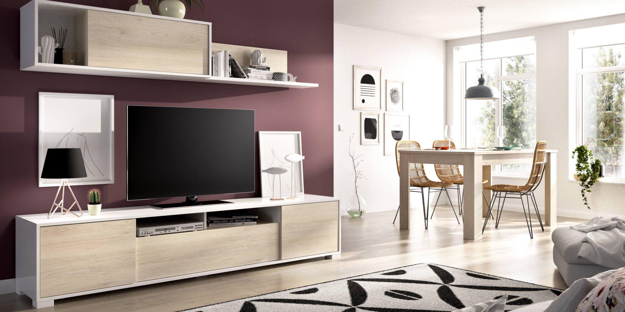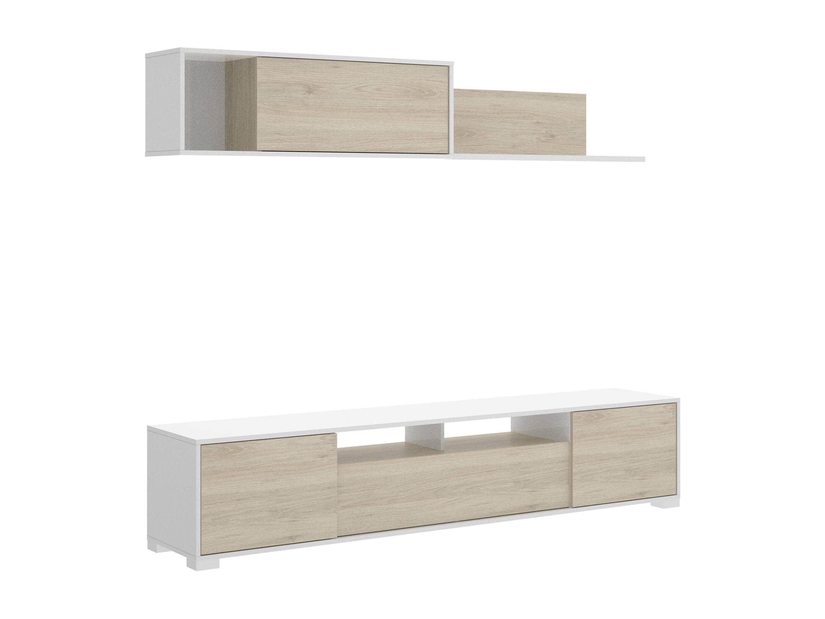 UNITÉ MURALE - Ensemble de salon meuble TV, Meuble de salon polyvalent, 200x41h180 cm, Chêne et Blanc.
