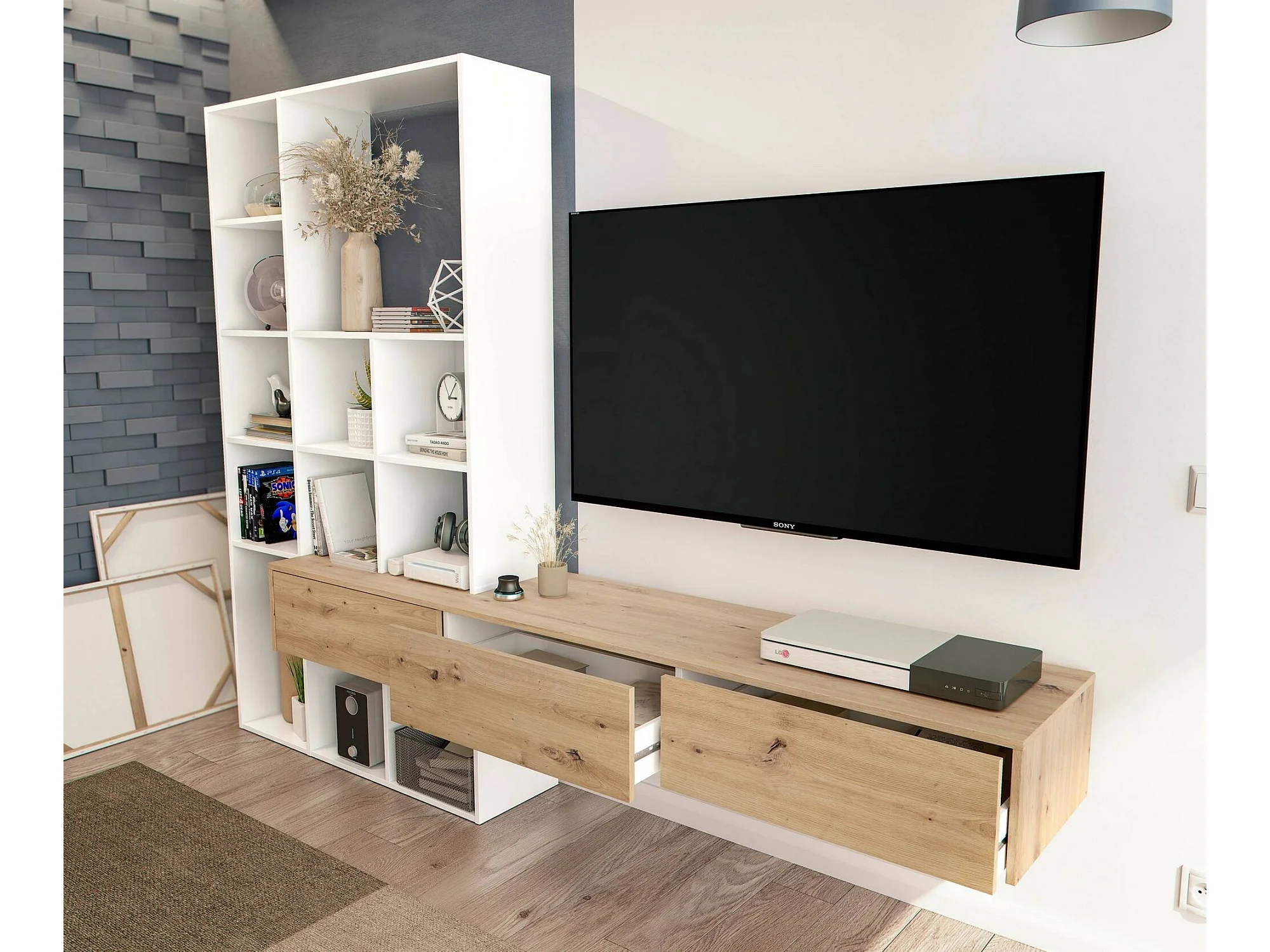 Élément mural Wausau, Ensemble de salon avec 3 tiroirs, Bibliothèque de salon polyvalente, 226x28h173 cm, Blanc et Chêne Noeud
