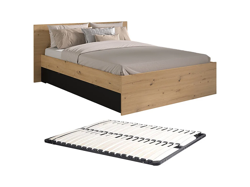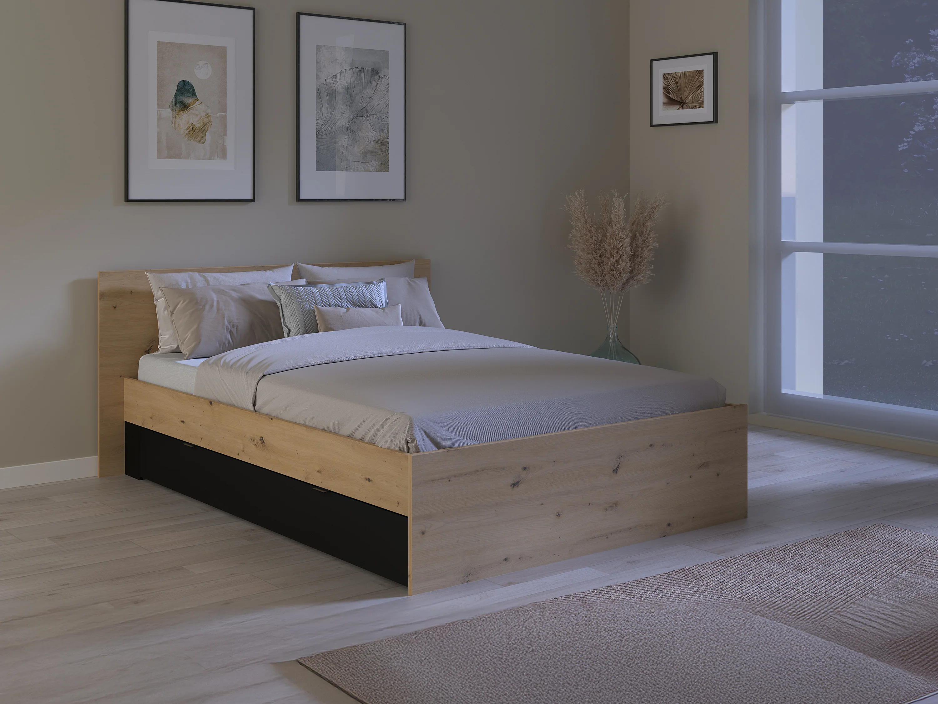 Lit avec 2 tiroirs 160 x 200 cm - Coloris : Naturel et noir + Sommier - VARLY