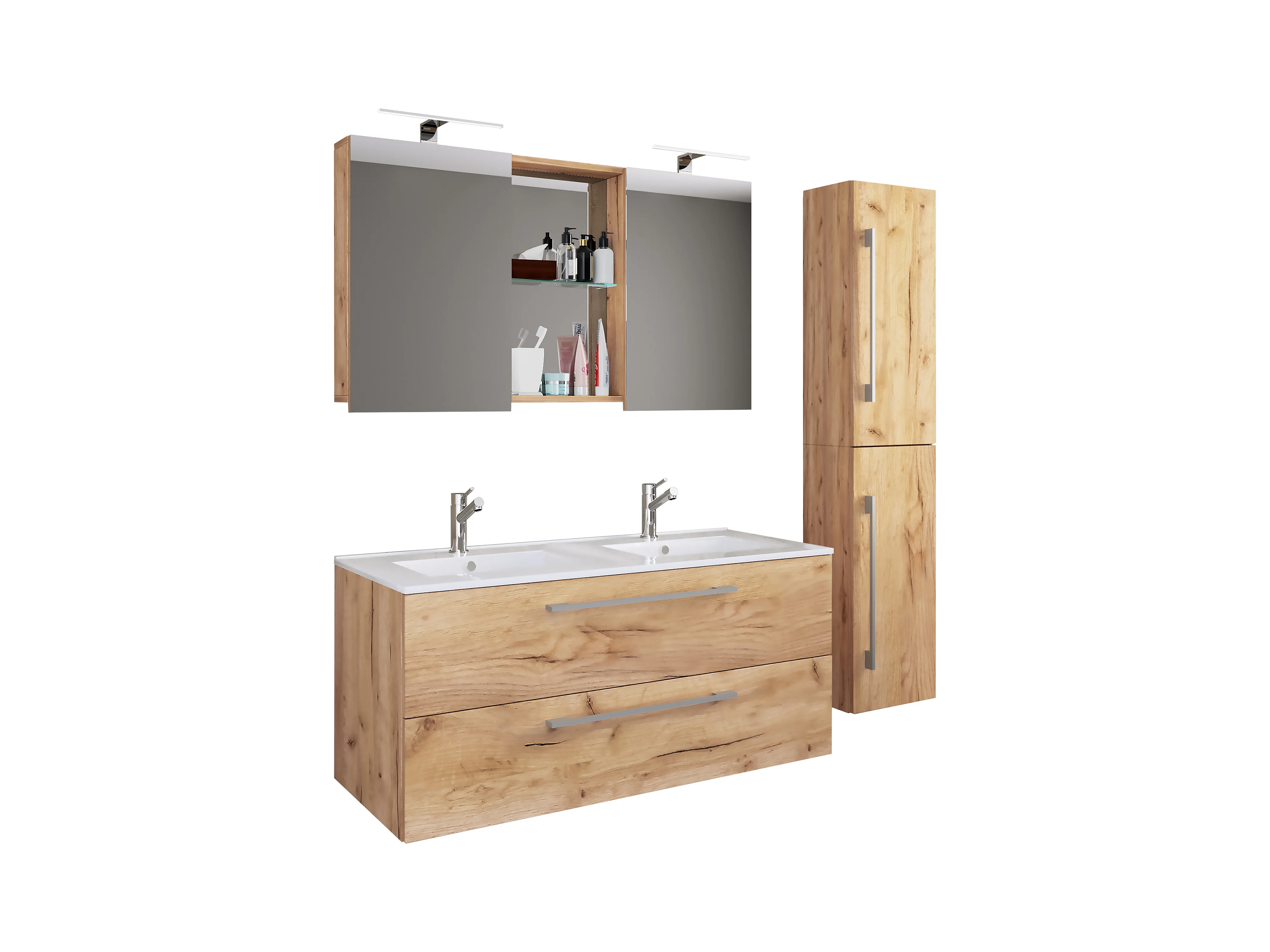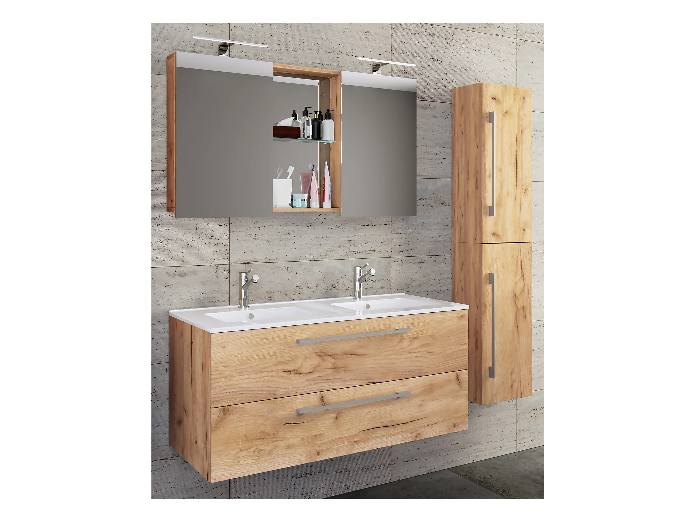 Ensemble de salle de bain 140 cm Armoire avec plan de travail Étagère Lavabo Colonne Chêne Wotan Wood