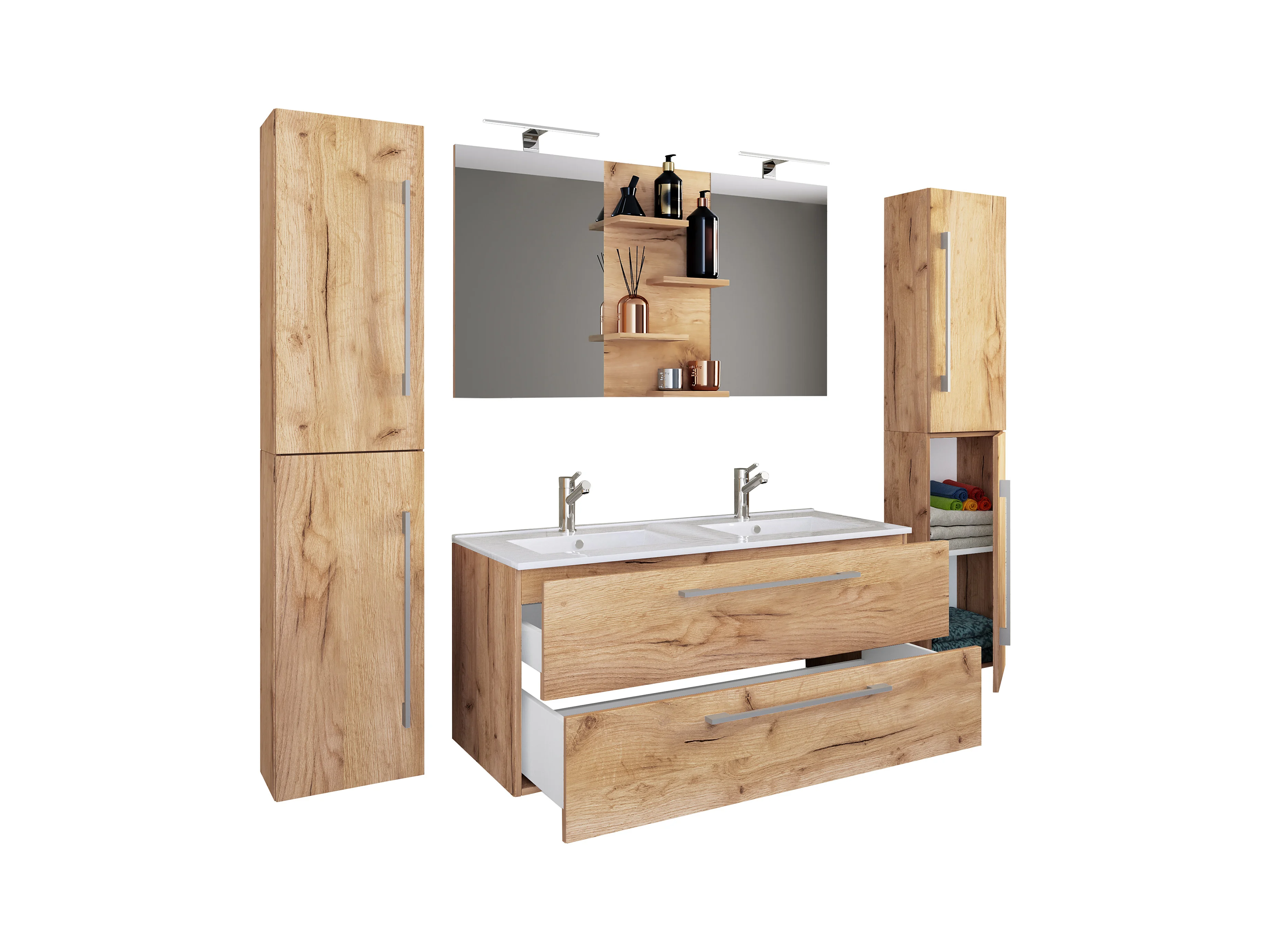 Ensemble de salle de bain 140 cm Armoire avec plan de travail Étagère Lavabo Colonne Chêne Wotan Wood