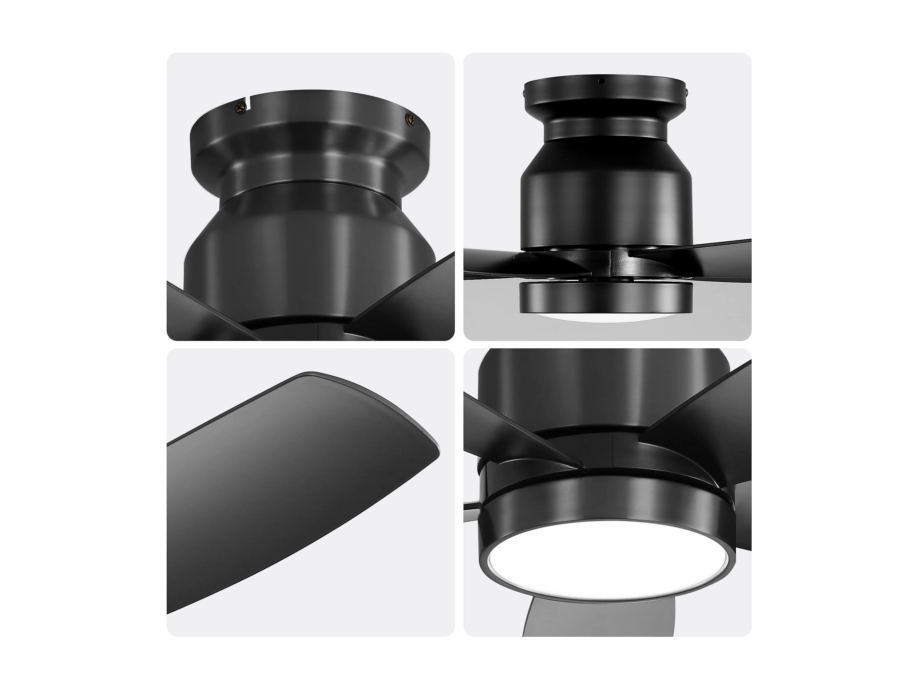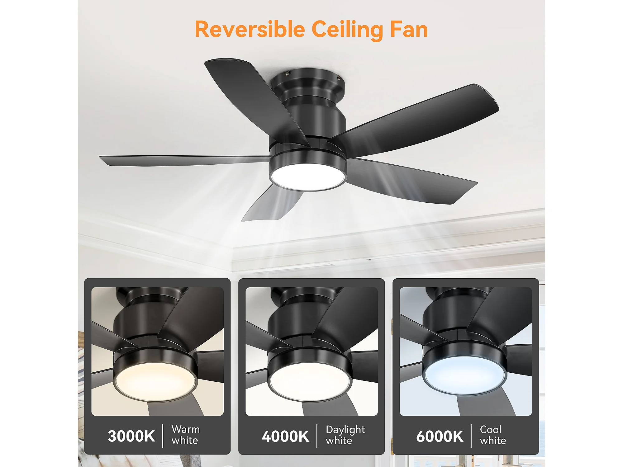 Ventilateur de plafond 52 pouces avec télécommande, 3 pales ABS, LED 18W dimmable, 3 couleurs, fonction réversible, noir (132x132x22.86 cm)