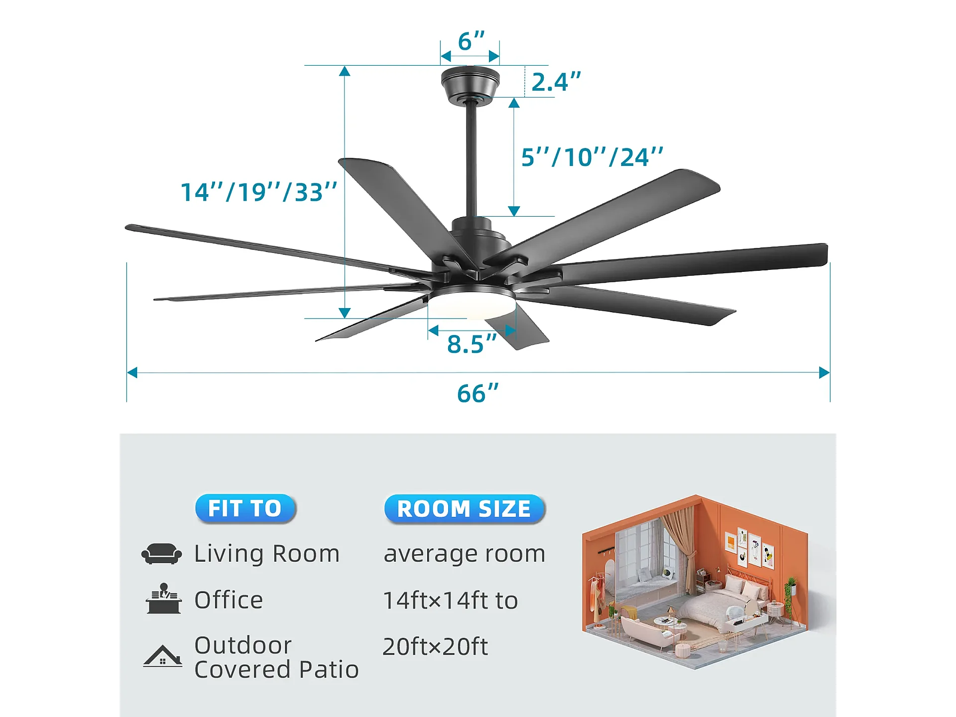 Ventilateur de plafond intelligent 66 pouces avec lumière LED dimmable, moteur EC réversible, commande par application et minuterie, ABS, noir