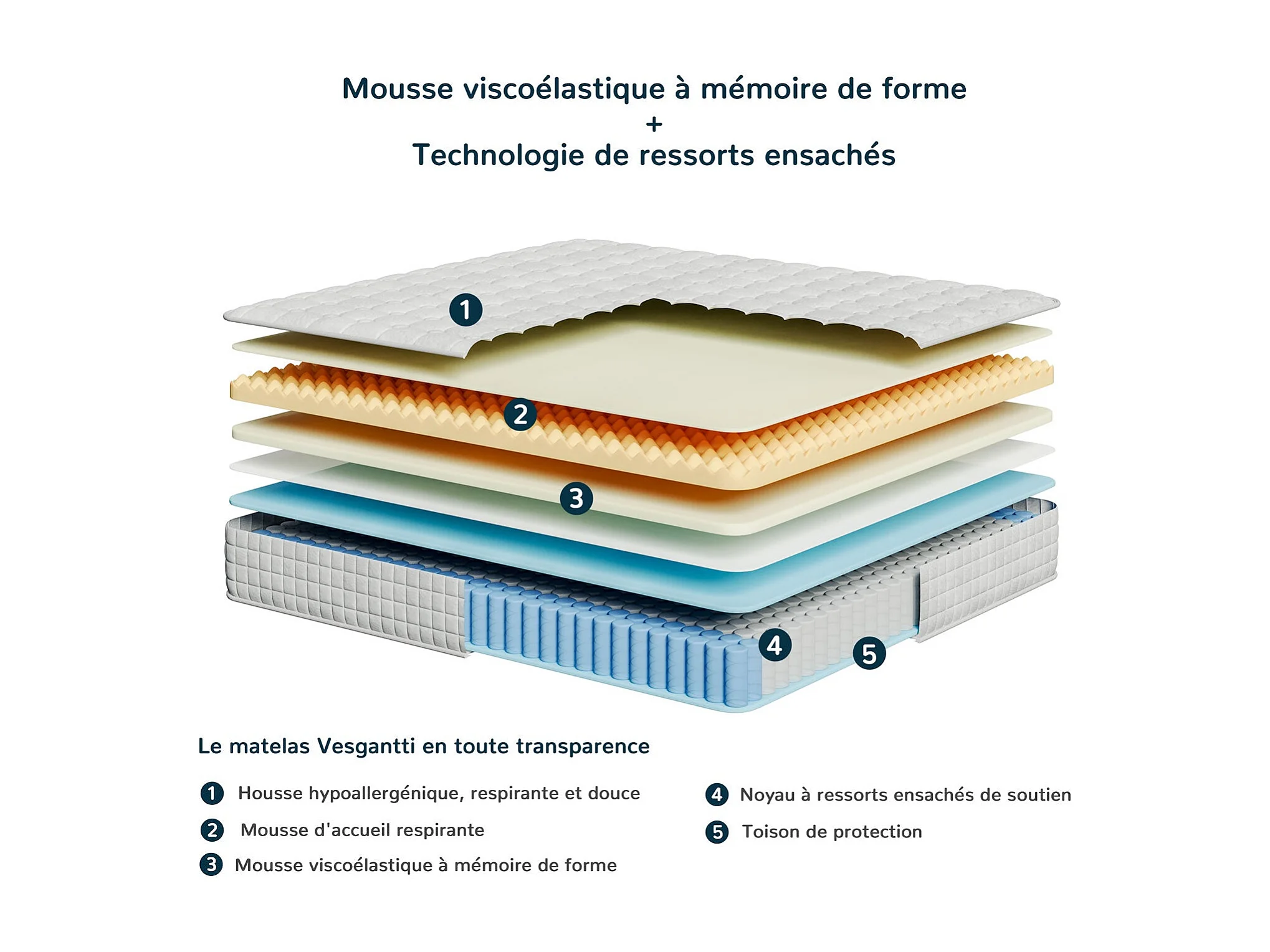Vesgantti Matelas 80x200cm, 24cm Épais, Hybrid Ressorts Ensachés & Mousse Mémoire, 7 Zones Confort, Multicouches, Certifié Oeko-Tex