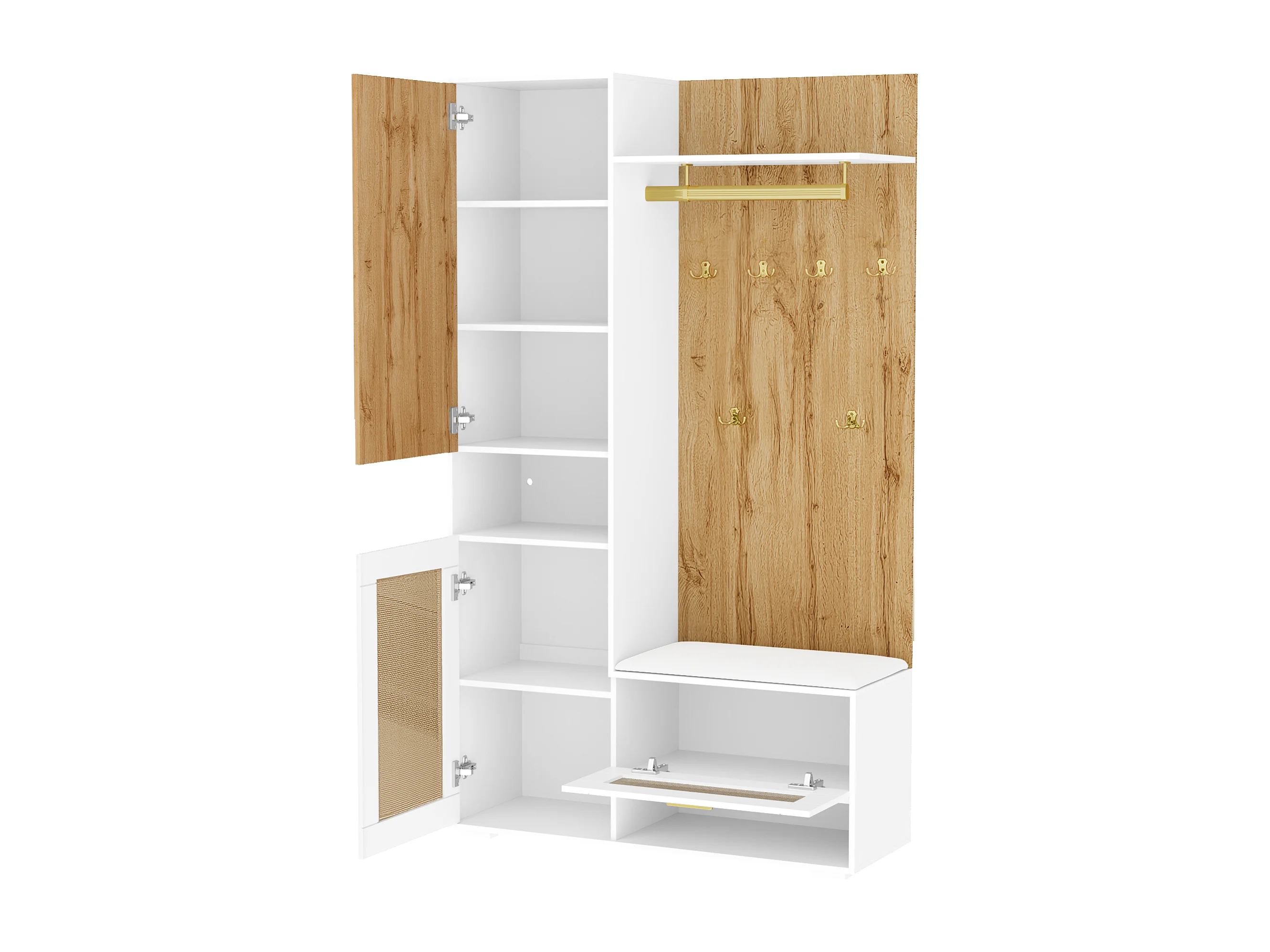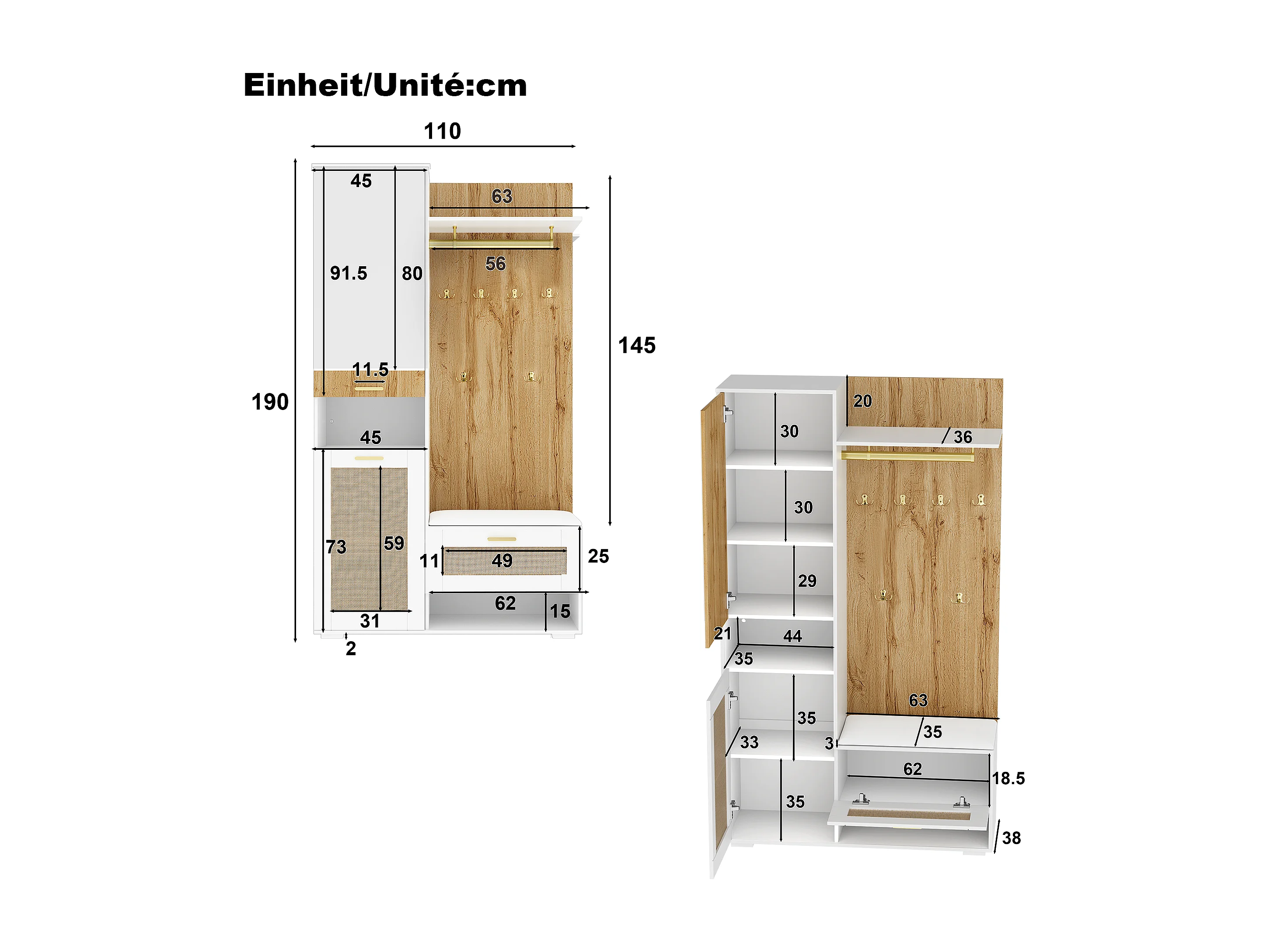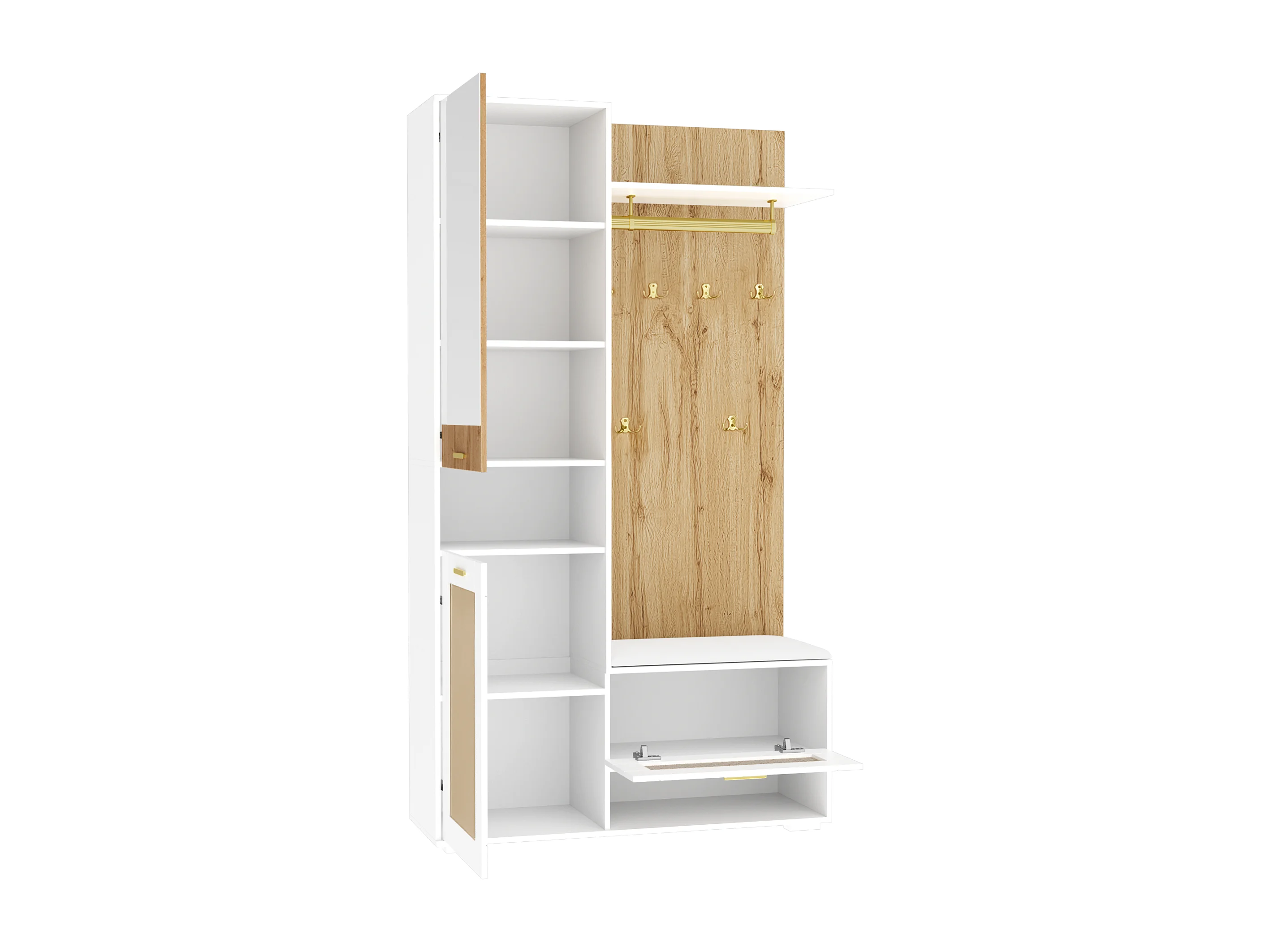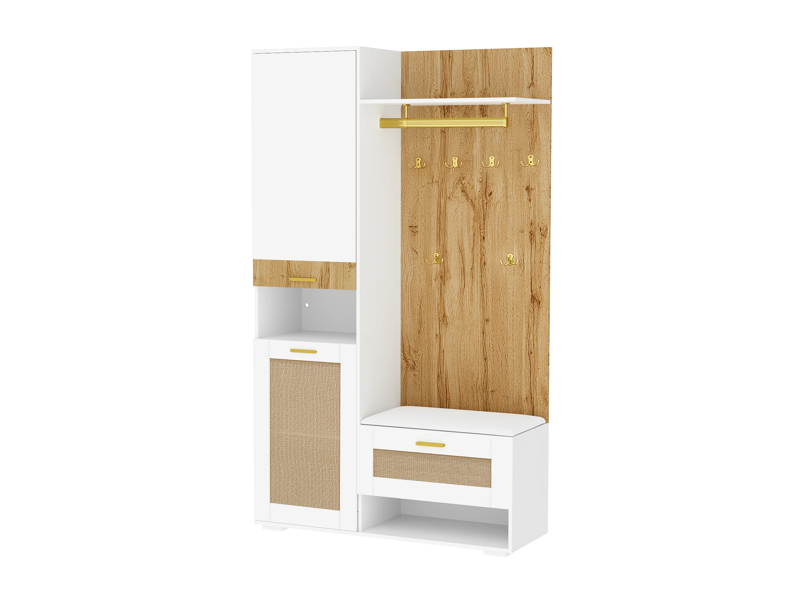 Vestiaire 110x38x190 cm avec LED - avec miroir + 5 patères + banc à chaussures - Naturel & Blanc