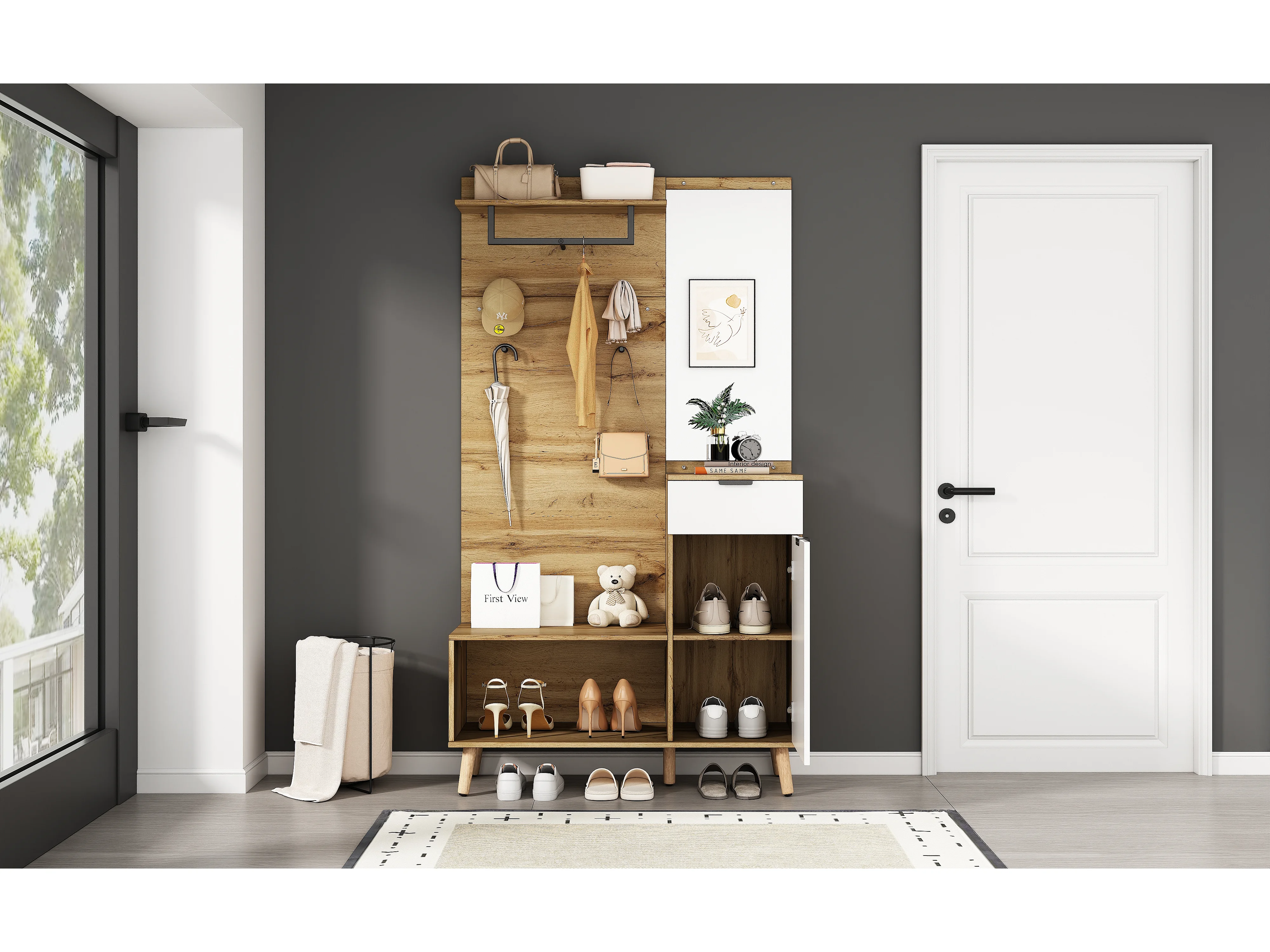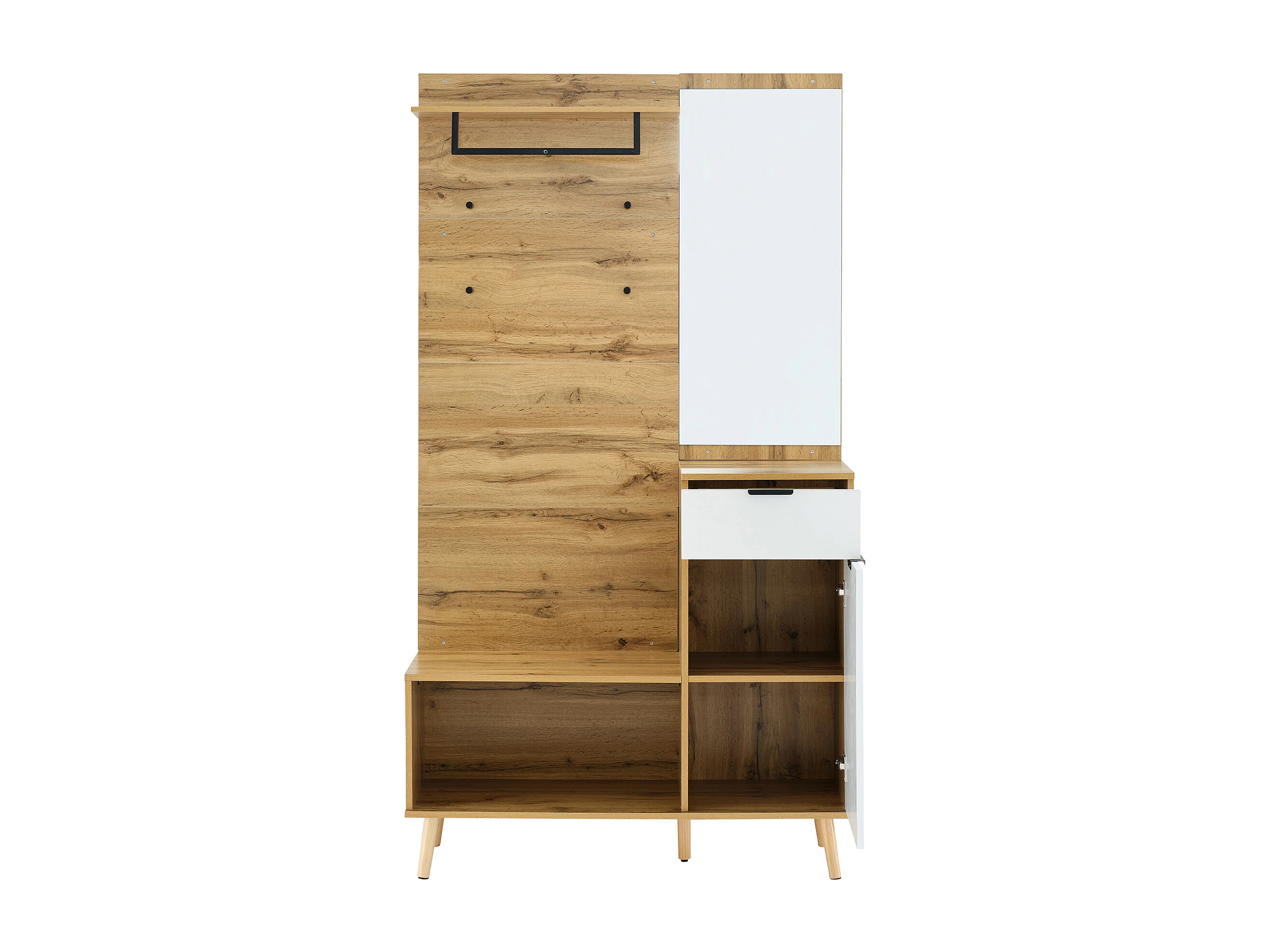 Vestiaire avec miroir, banc, tiroir et porte - Couleur bois et blanc 104x39x190cm