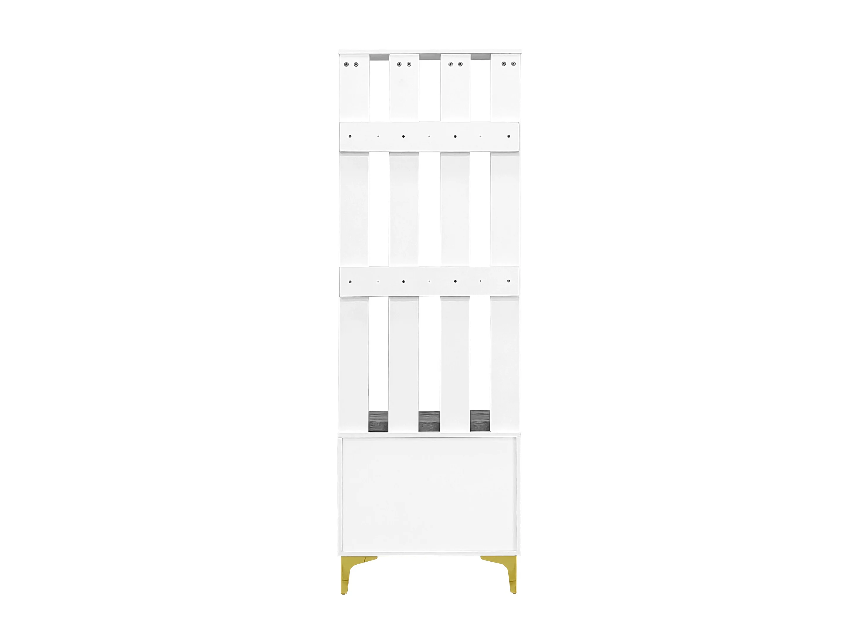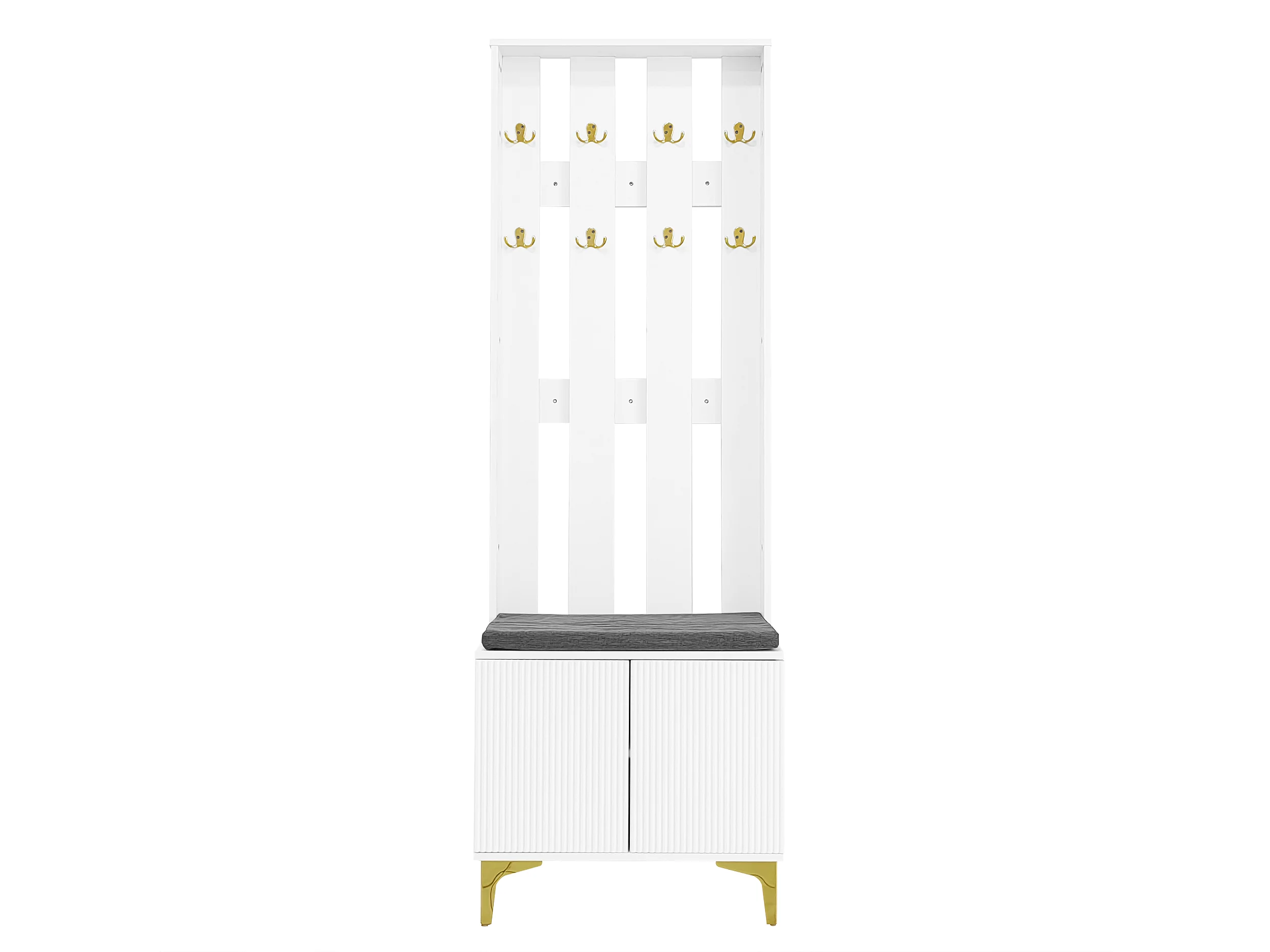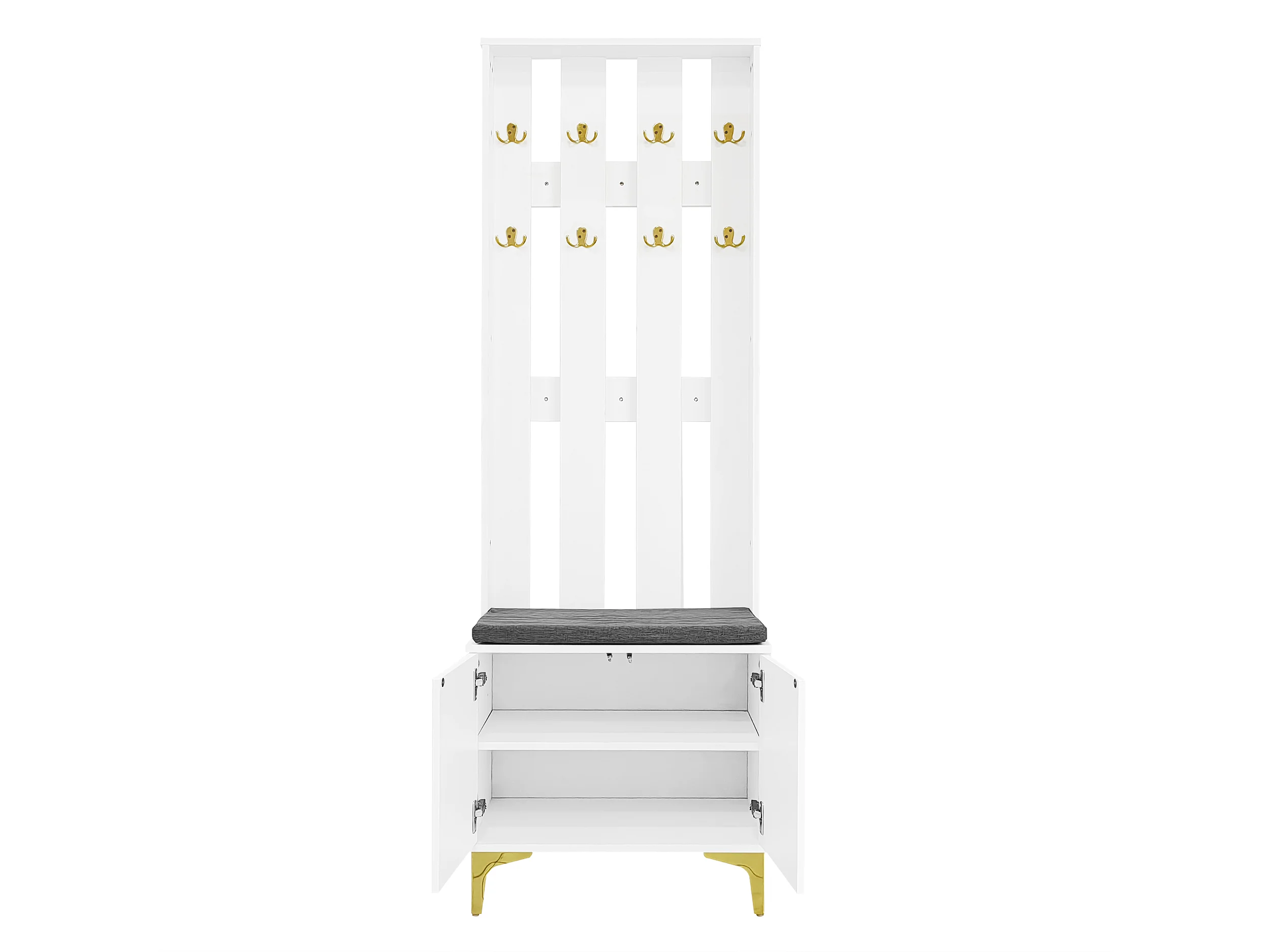 Vestiaire blanc avec 2 portes, banc à chaussures et coussin, patères, pieds dorés 60,5x35,2x180,5cm