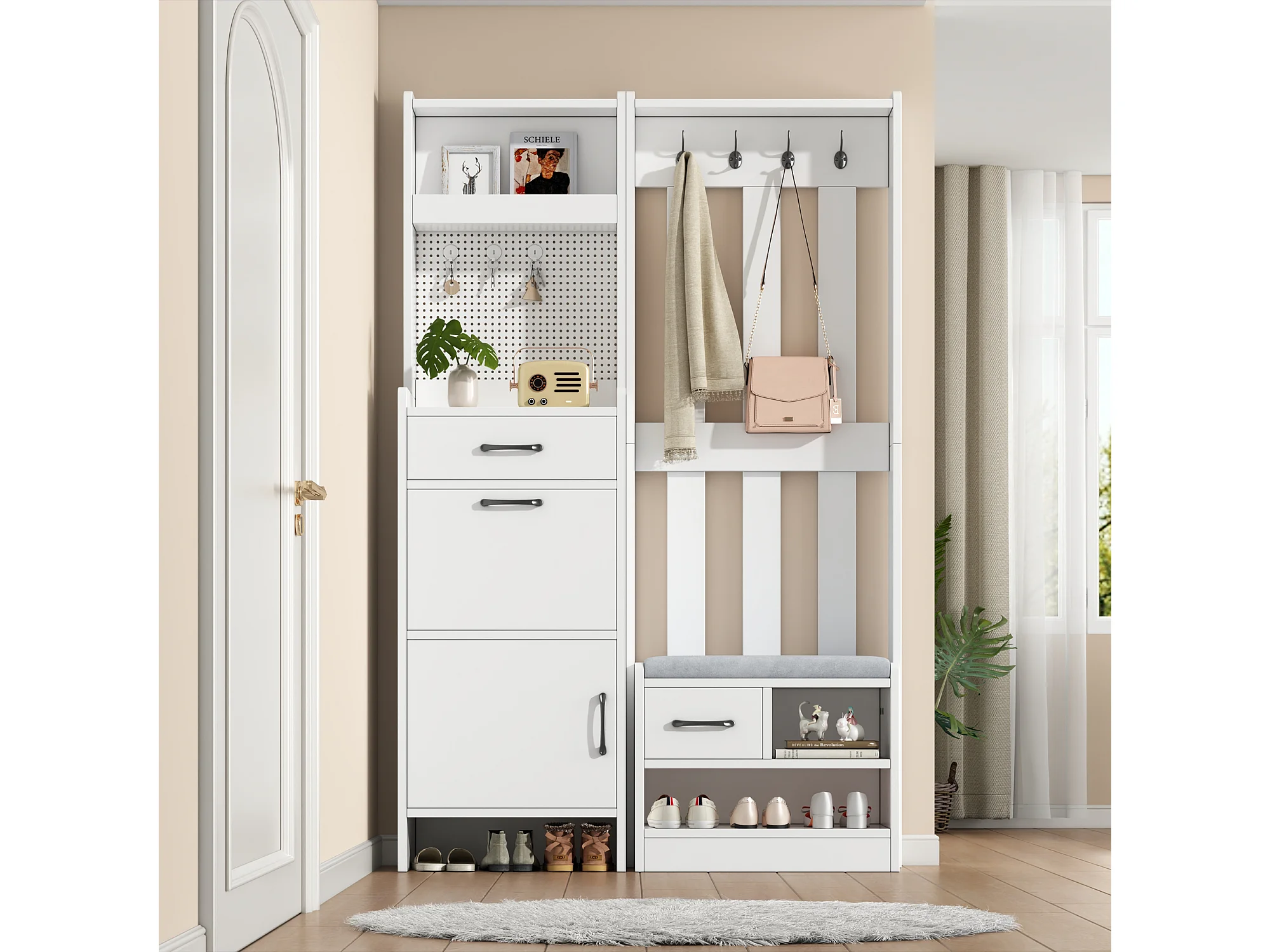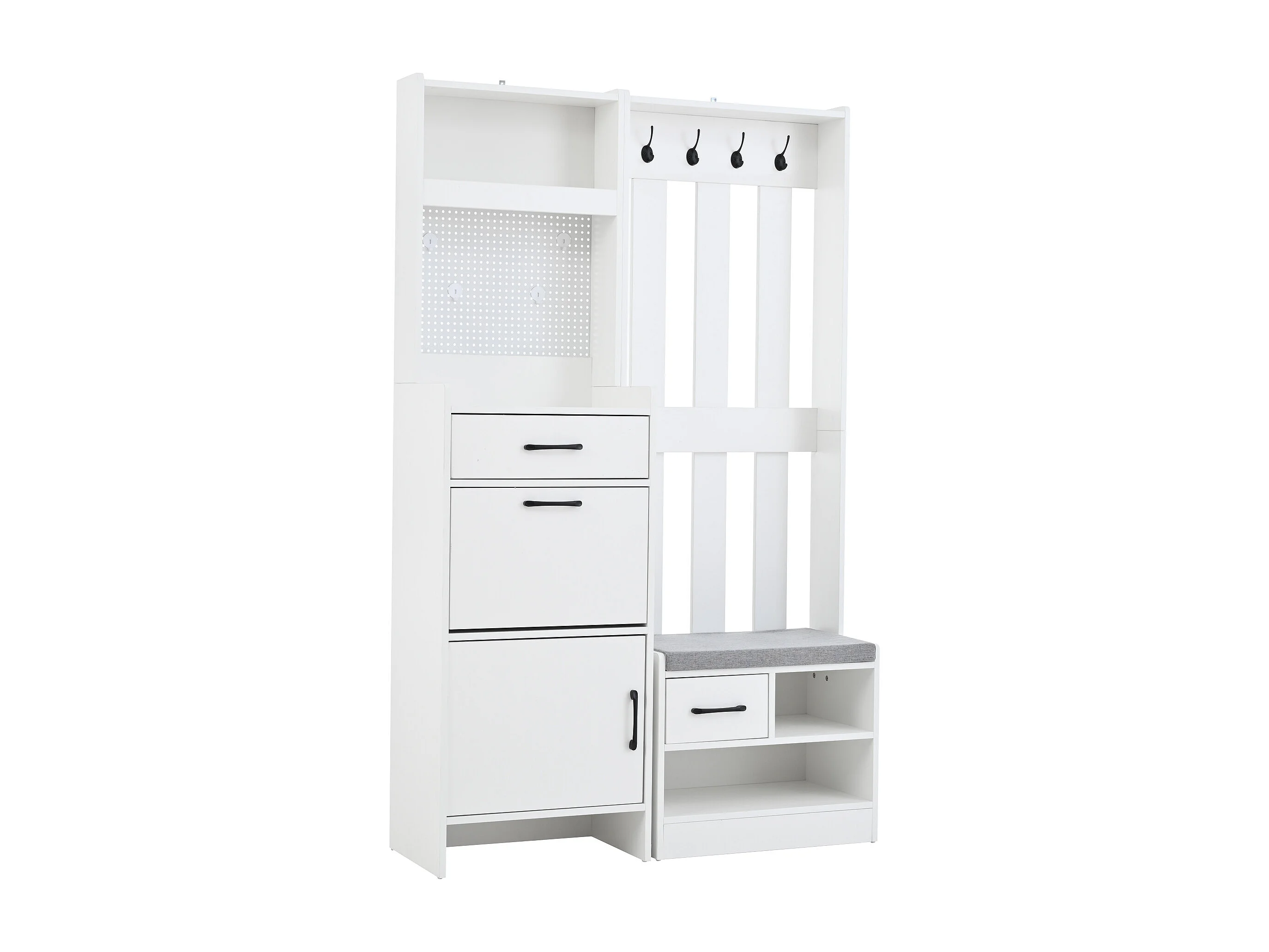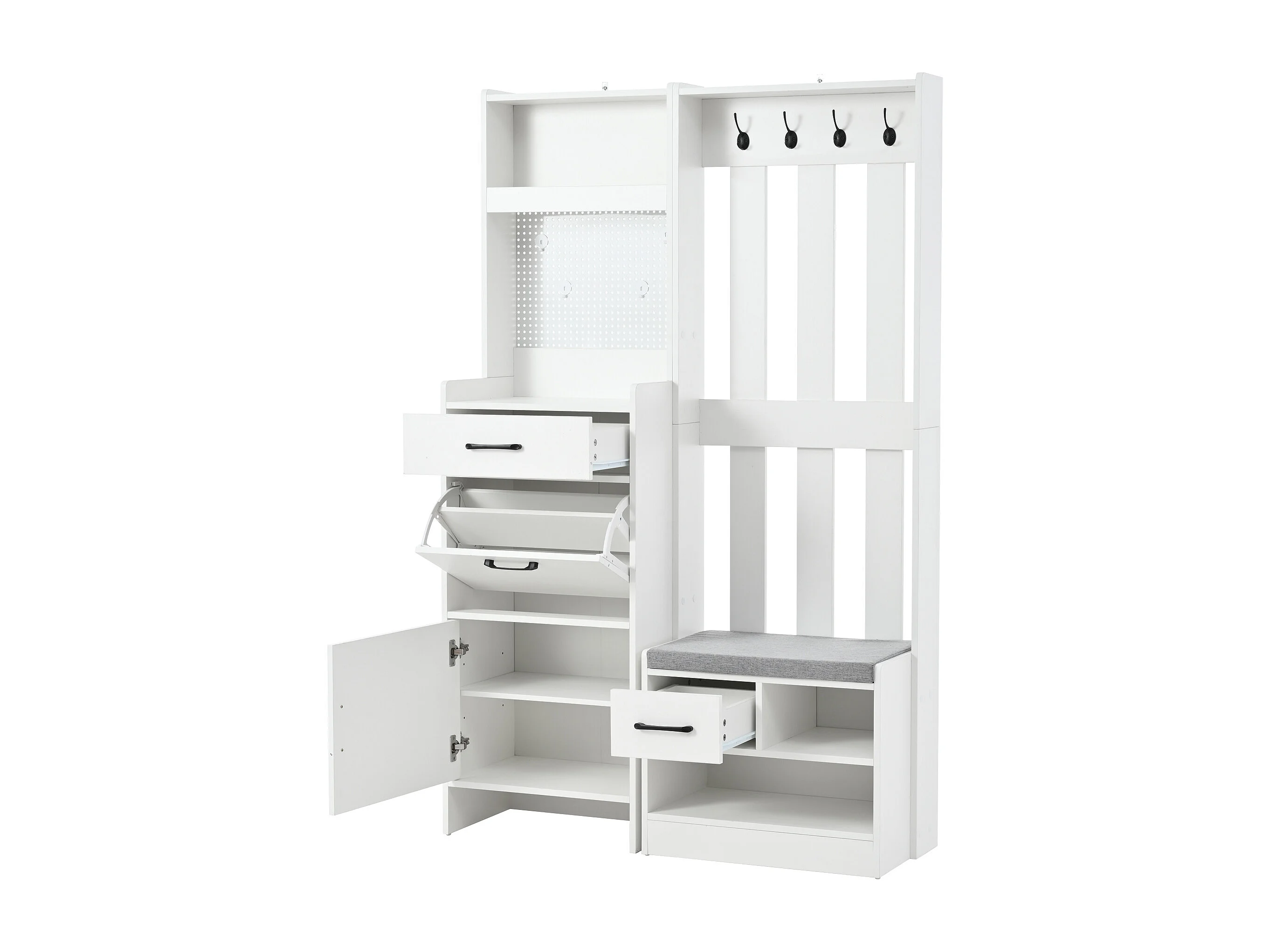 Vestiaire blanc avec 2 tiroirs, 2 portes, banc et crochets, panneau perforé 110x35x175,5cm