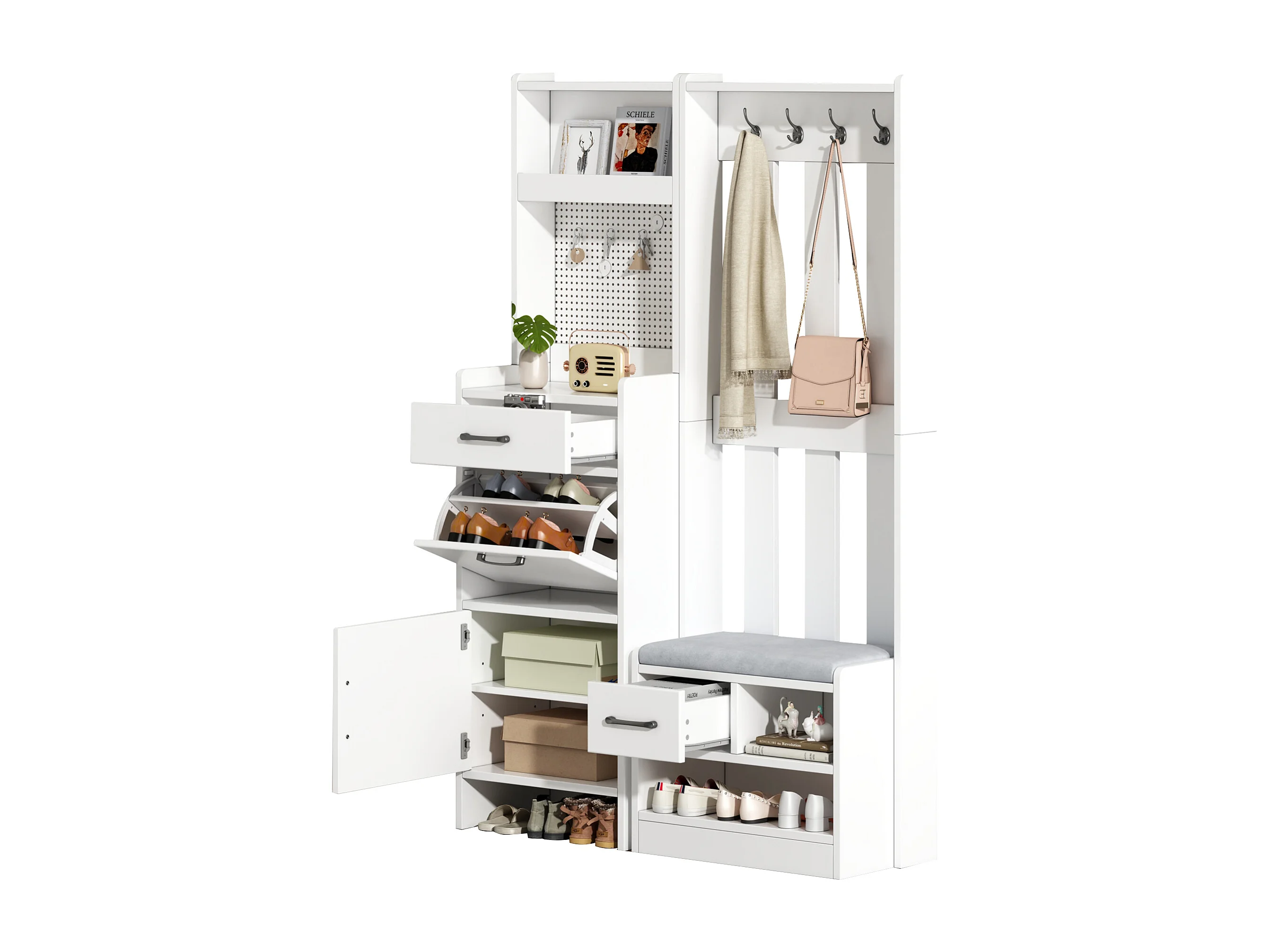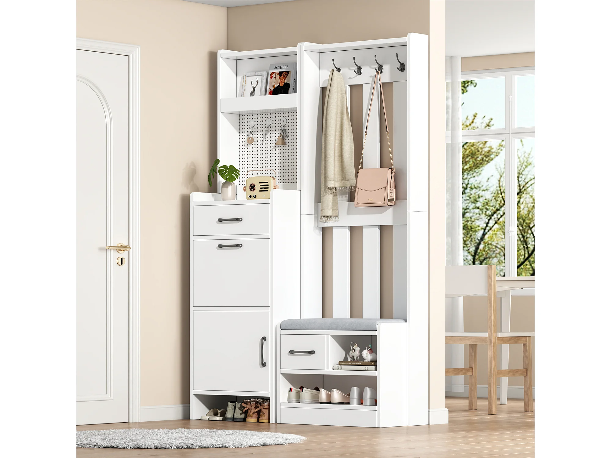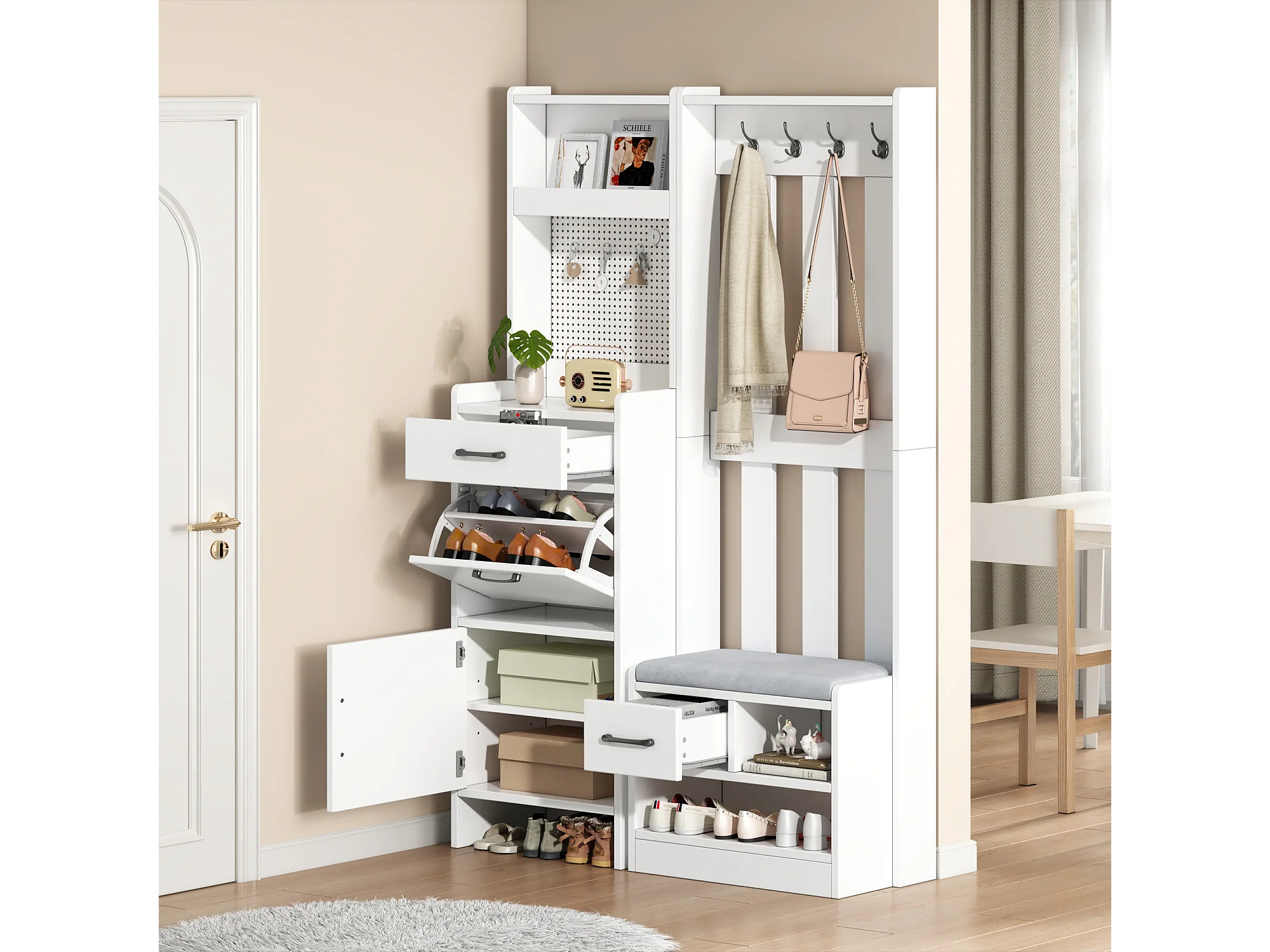 Vestiaire blanc avec 2 tiroirs, 2 portes, banc et crochets, panneau perforé 110x35x175,5cm