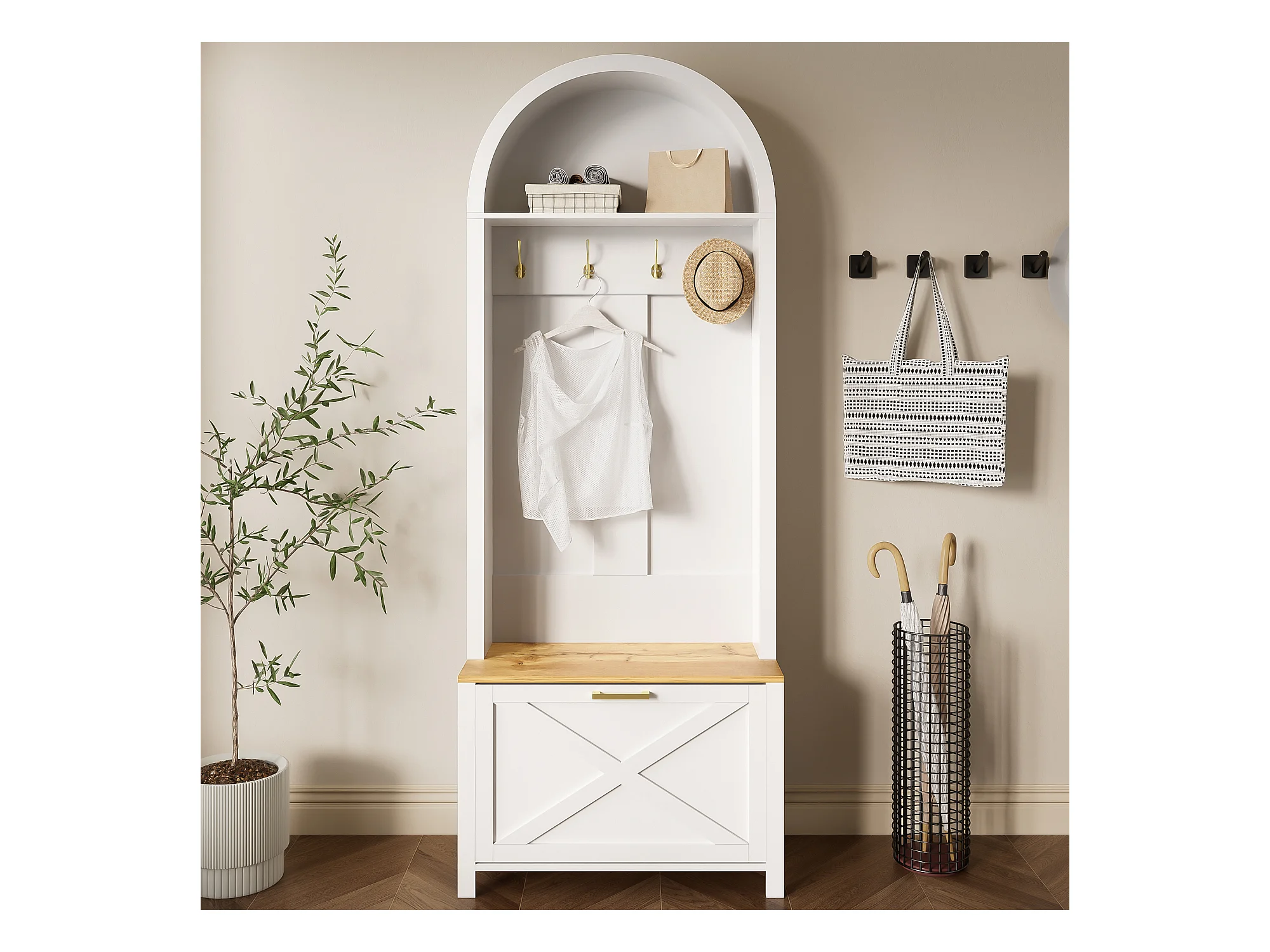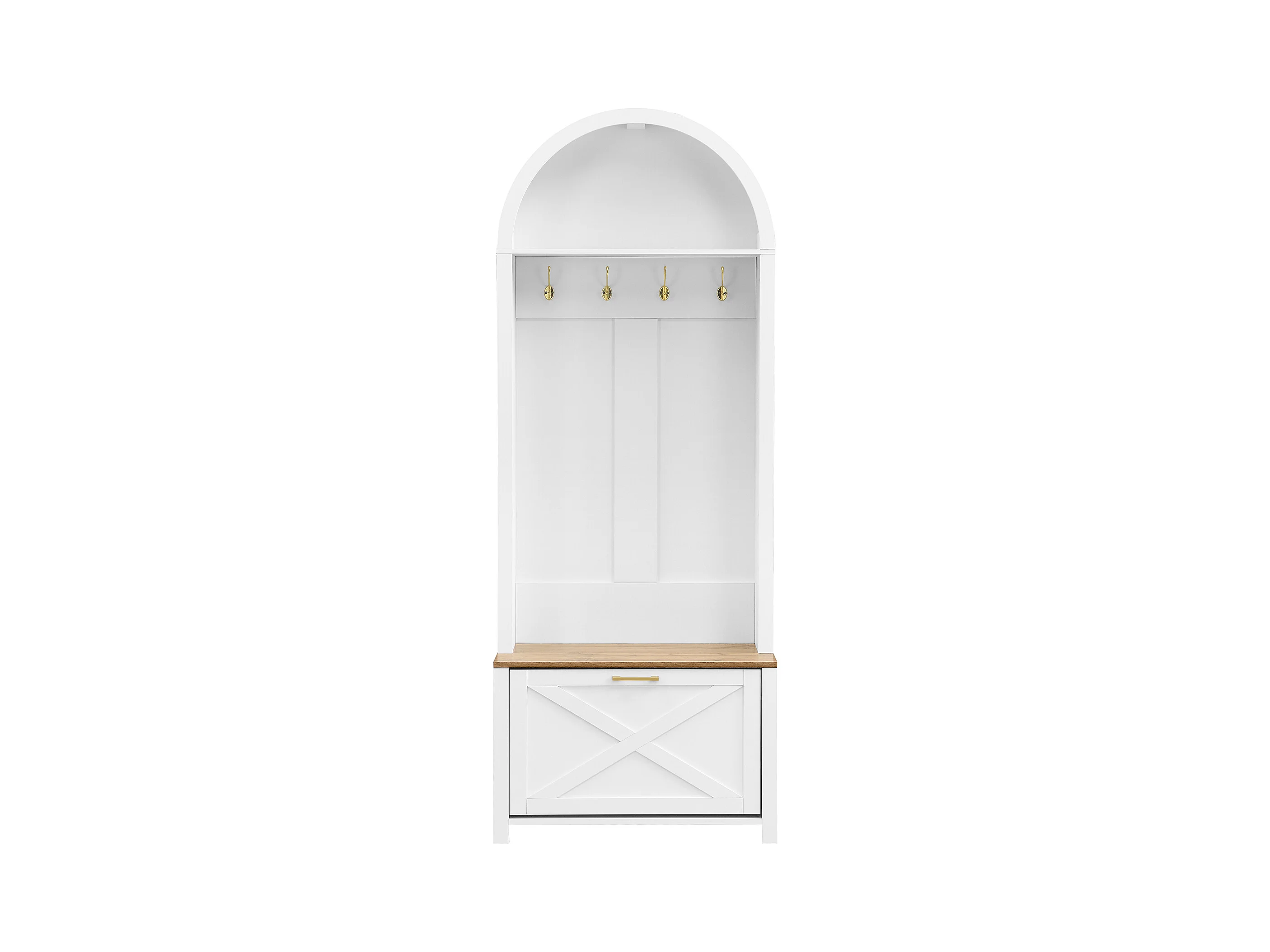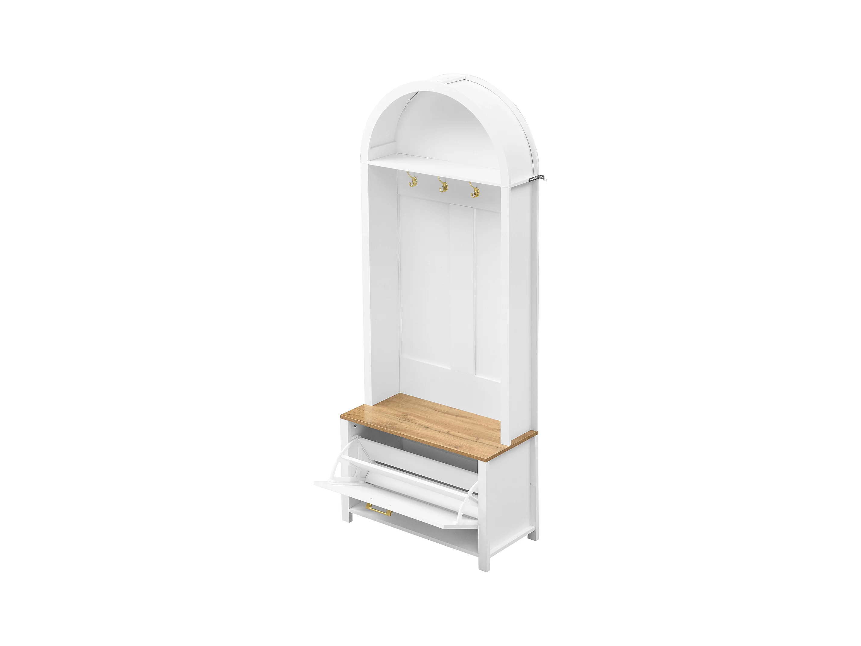 Vestiaire blanc et naturel avec porte et crochets dorés, design arche 75x35x195cm