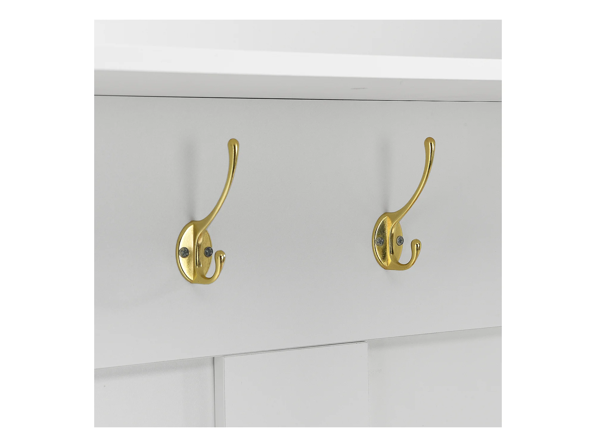Vestiaire blanc - Porte manteau avec 6 crochets dorés et 3 portes - banc de rangement et 3 compartiments ouverts