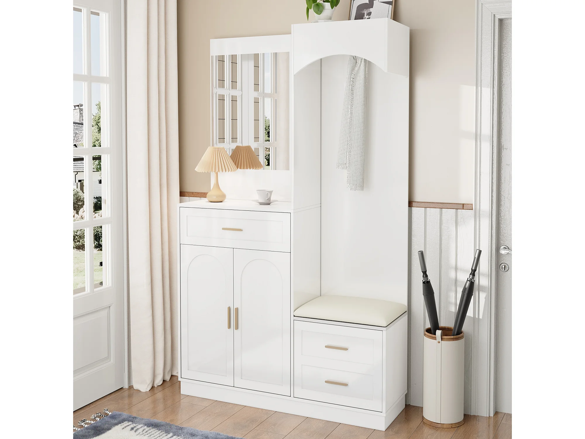 Vestiaire/combinaison armoire et meuble à chaussures avec miroir + 1 tiroir + 3 portes - 110 x 33 x 185.5 - MDF - blanc