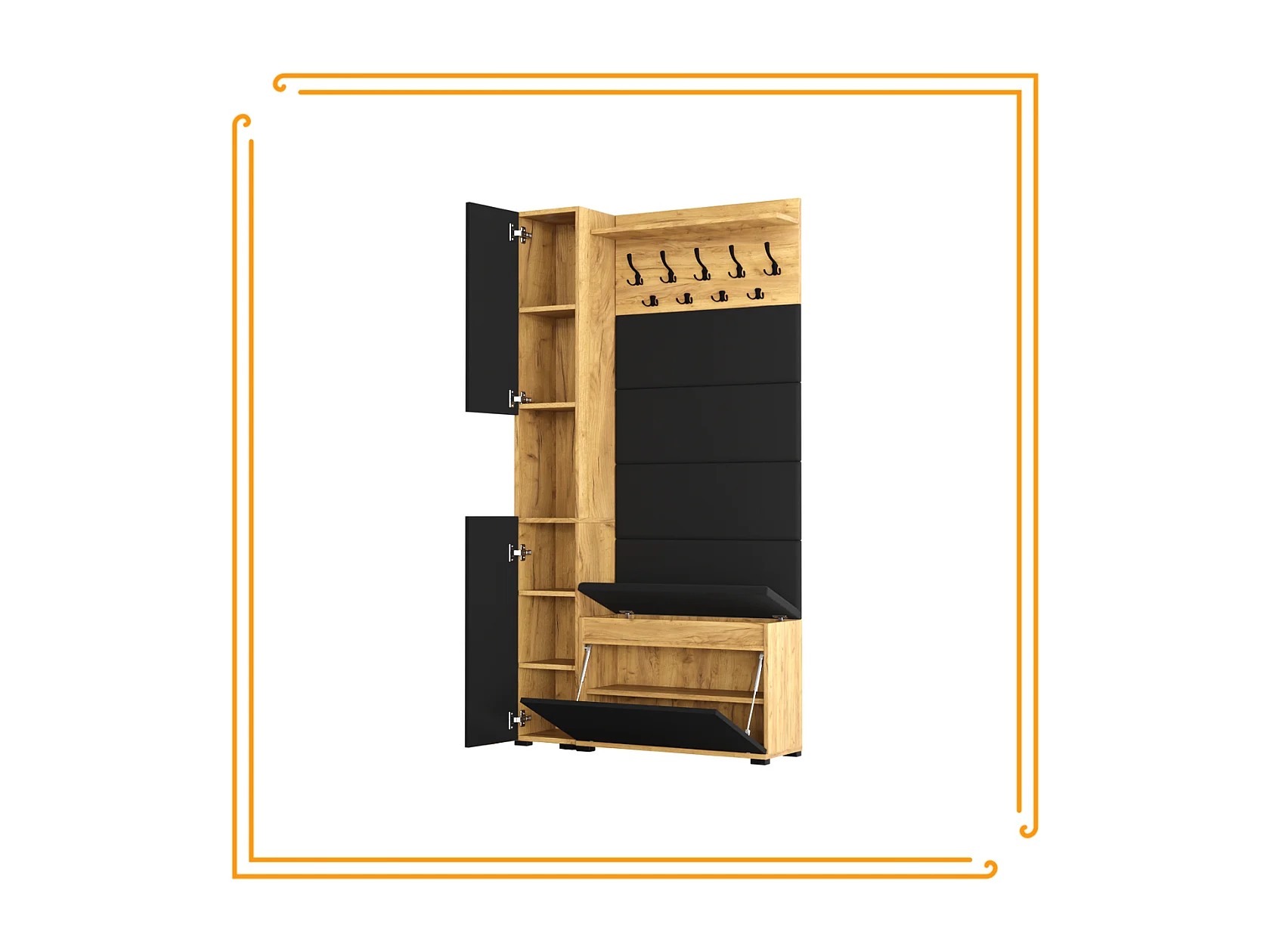 Vestiaire d'entrée avec assise, patère, panneau rembourré – Chêne doré et noir