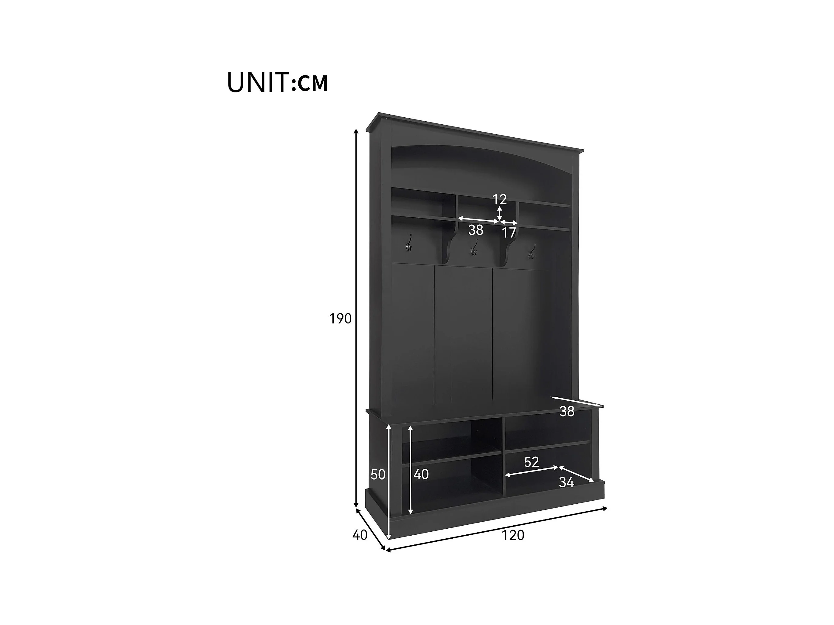 Vestiaire d'entrée avec porte-manteau et banc de rangement à chaussures - 120x40x190 cm - Noir