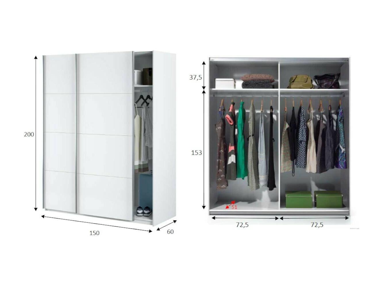Armoire Ponce, Armoire de chambre avec 2 portes coulissantes, Armoire avec tringle à vêtements et 2 étagères, 150x60h200 cm, Blanc brillant