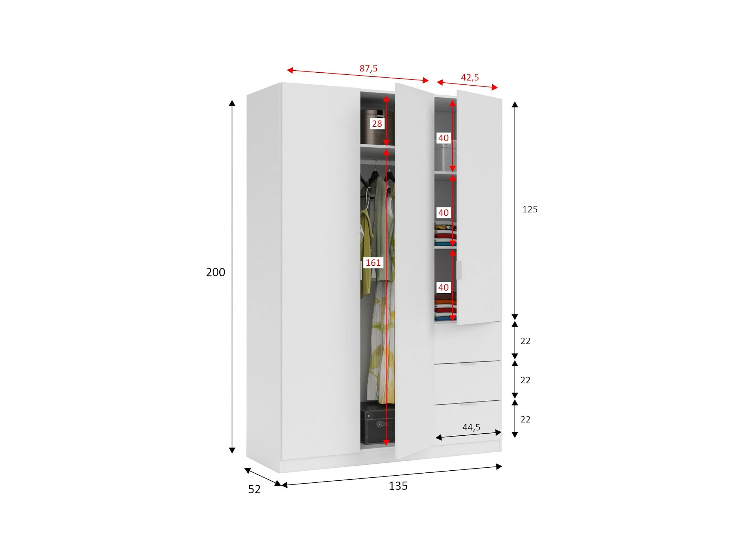 Armoire Ddermak, armoire de chambre à coucher avec 3 portes et 3 tiroirs, armoire avec 3 étagères et barre de suspension, 135x52h200 cm, blanc