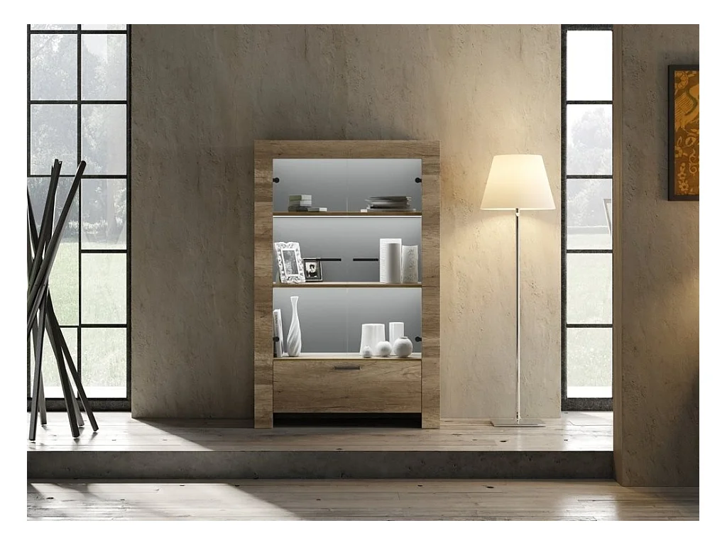 Vitrine 1 porte 1 tiroir en bois marron et anthracite avec des pieds acier noir Kalieto 120cm