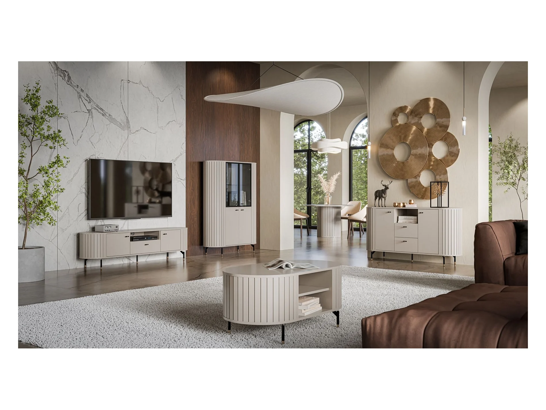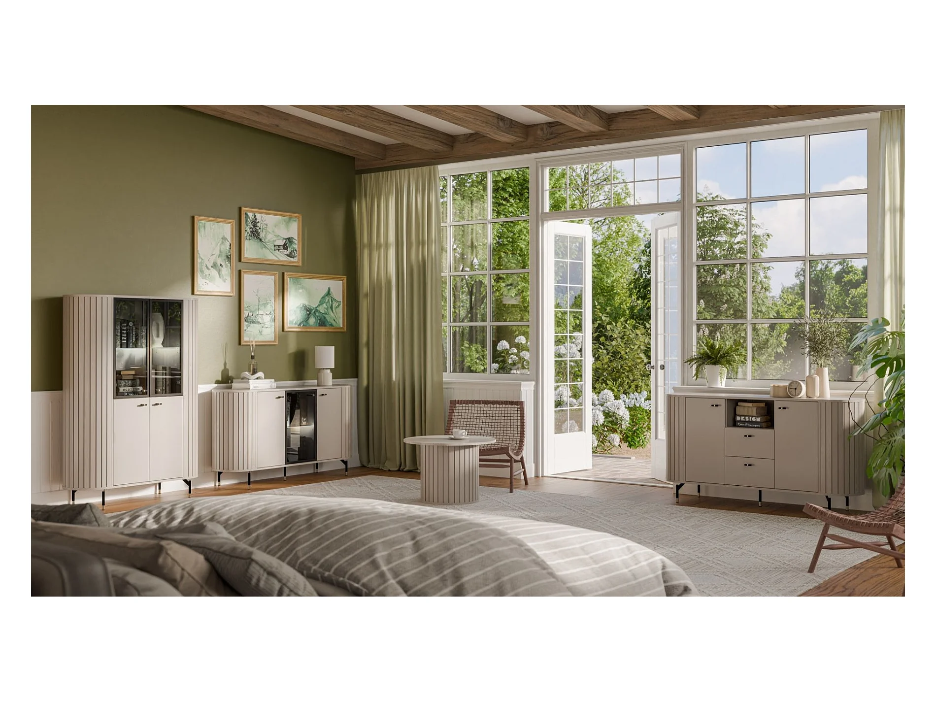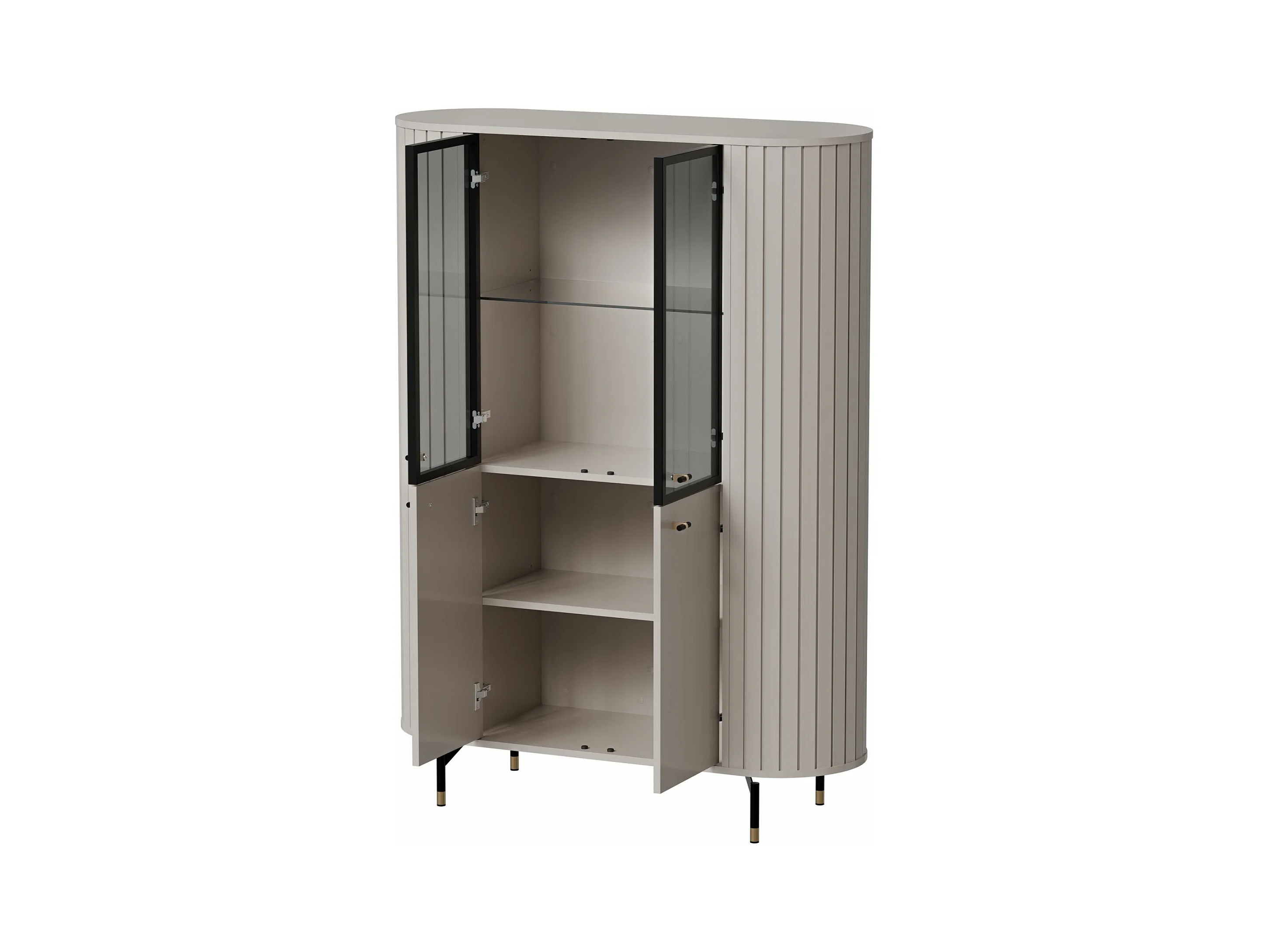 Vitrine 4 portes avec porte vitrée - 112cm - Grège avec façades rainurées - ZANTE