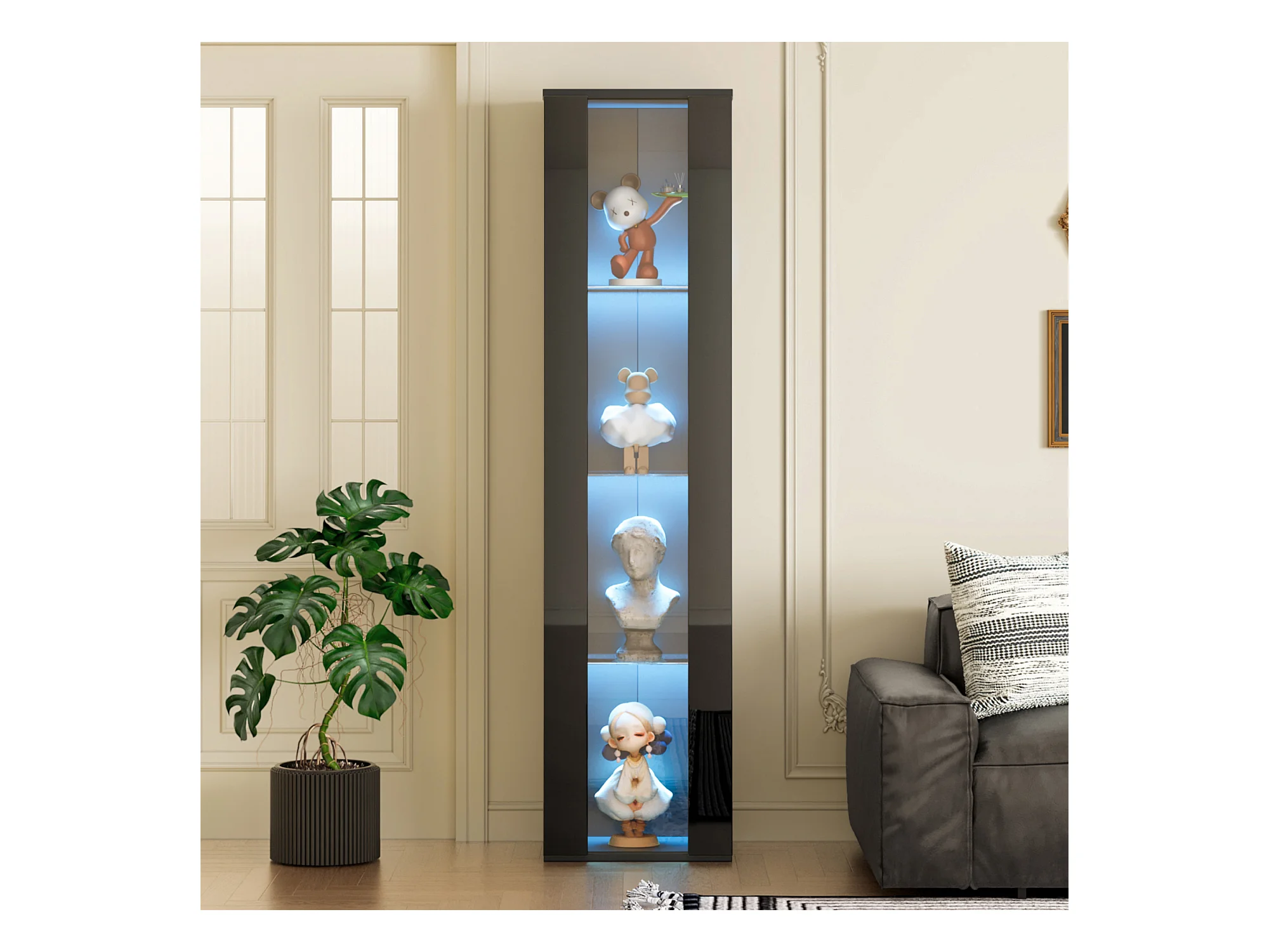 Vitrine LED avec 1 tiroir de rangement et 4 portes, étagères en verre - noir