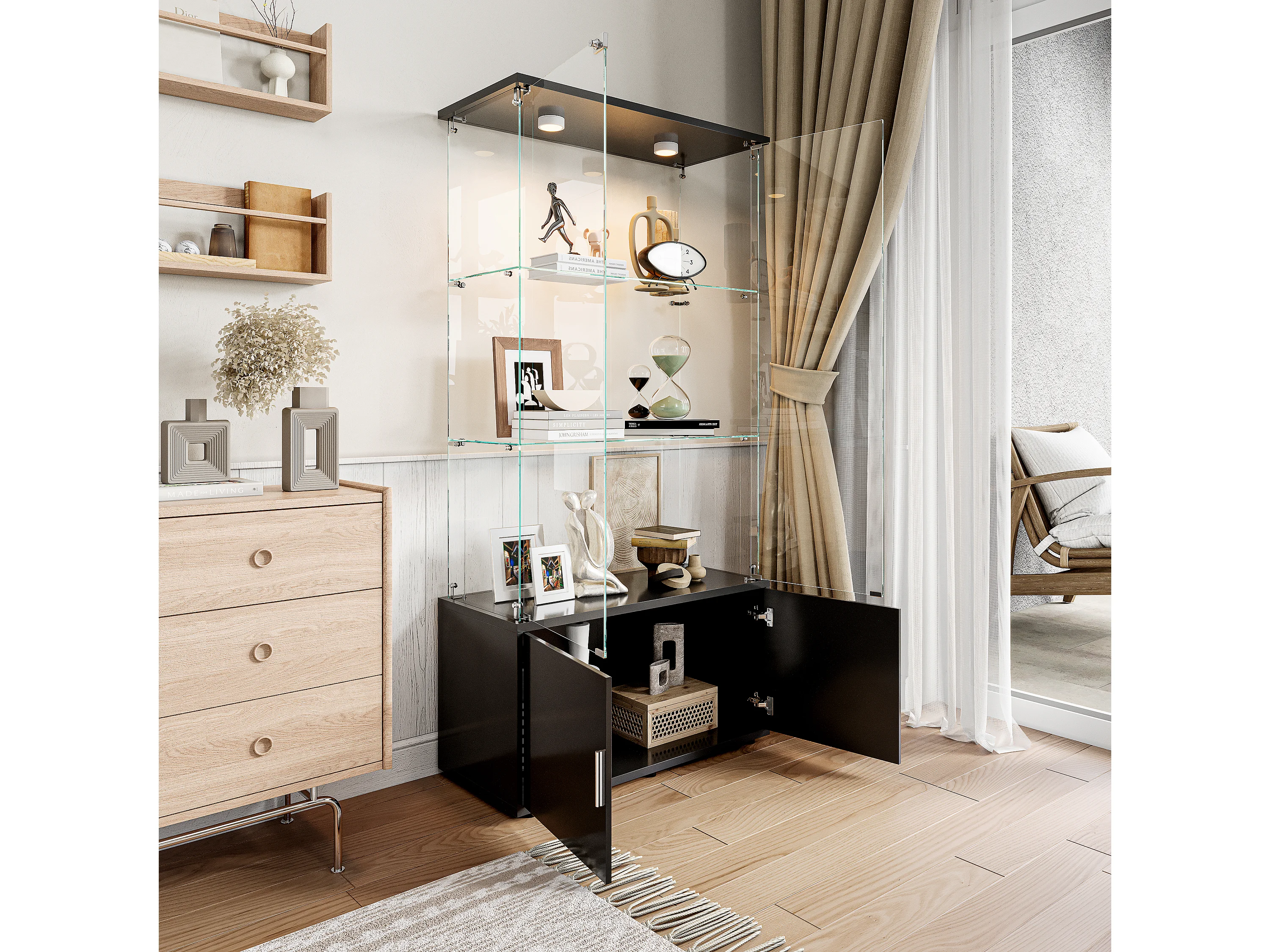 Vitrine à 3 étagères avec LED et rangement, design moderne noir/blanc, verre trempé et métal – Idéale salon, chambre, bureau