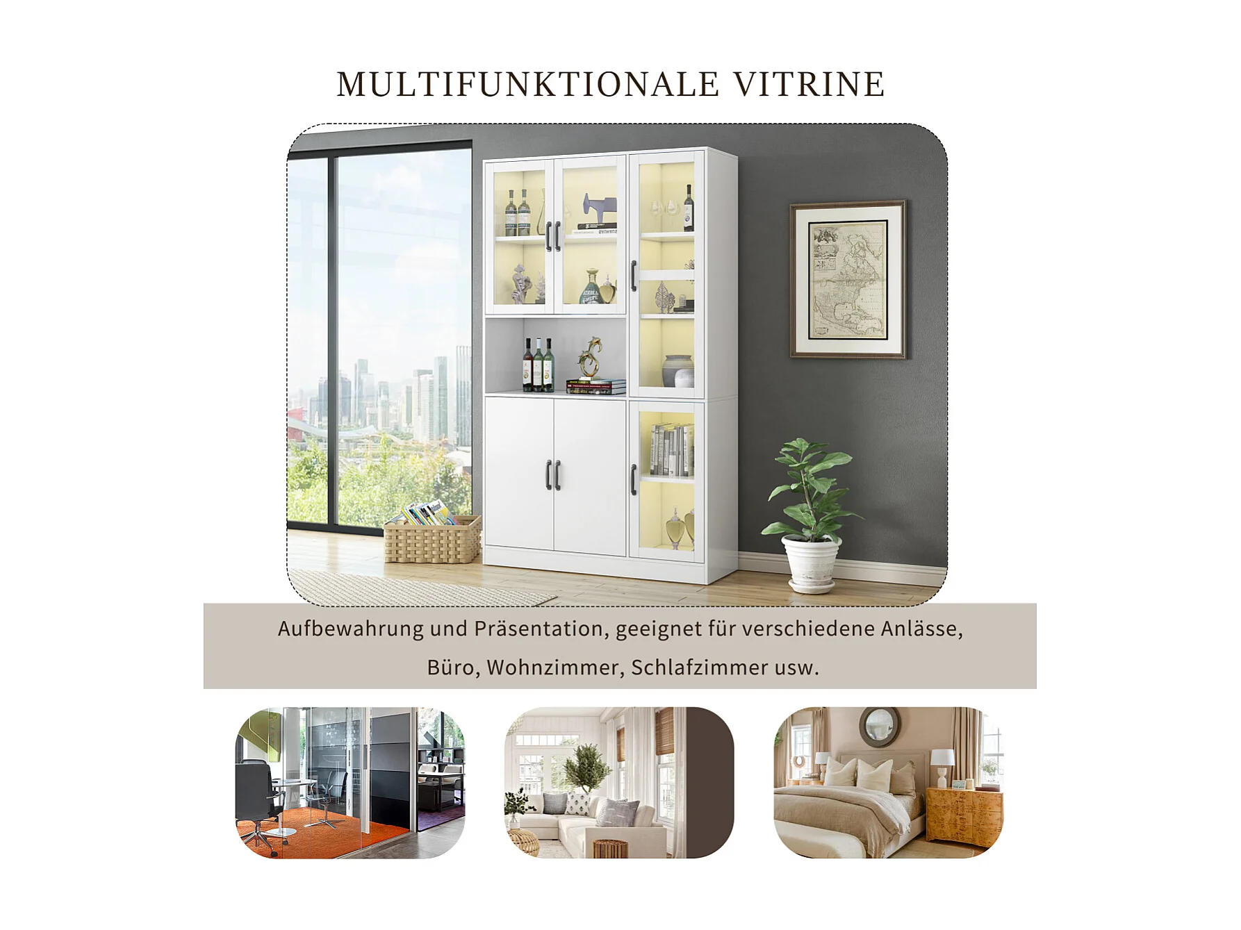Vitrine blanche avec éclairage LED et portes pour le rangement dans le salon/la chambre.