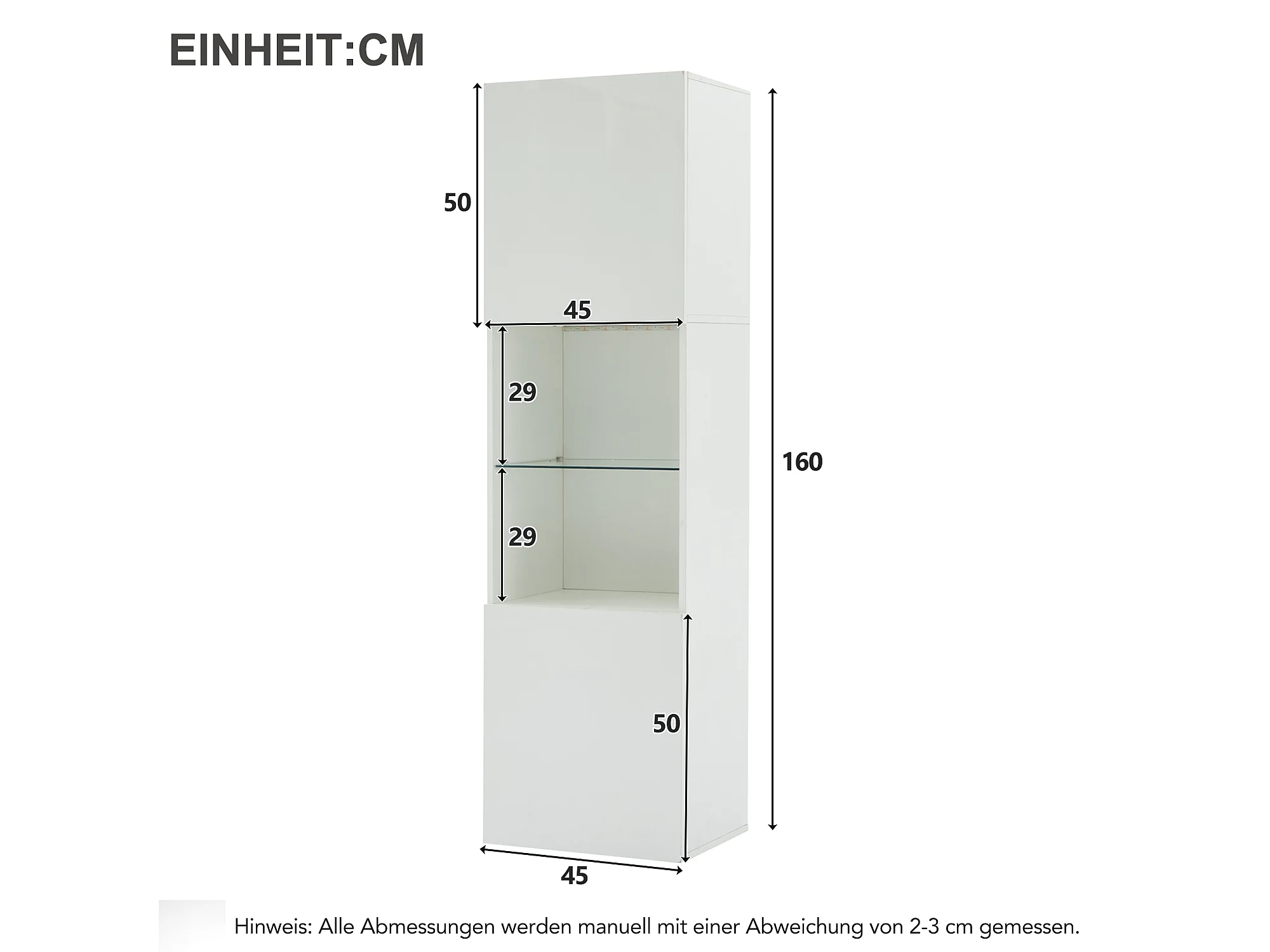 Vitrine blanche brillante avec éclairage LED, étagère en verre, MDF, (45x35x160 cm)