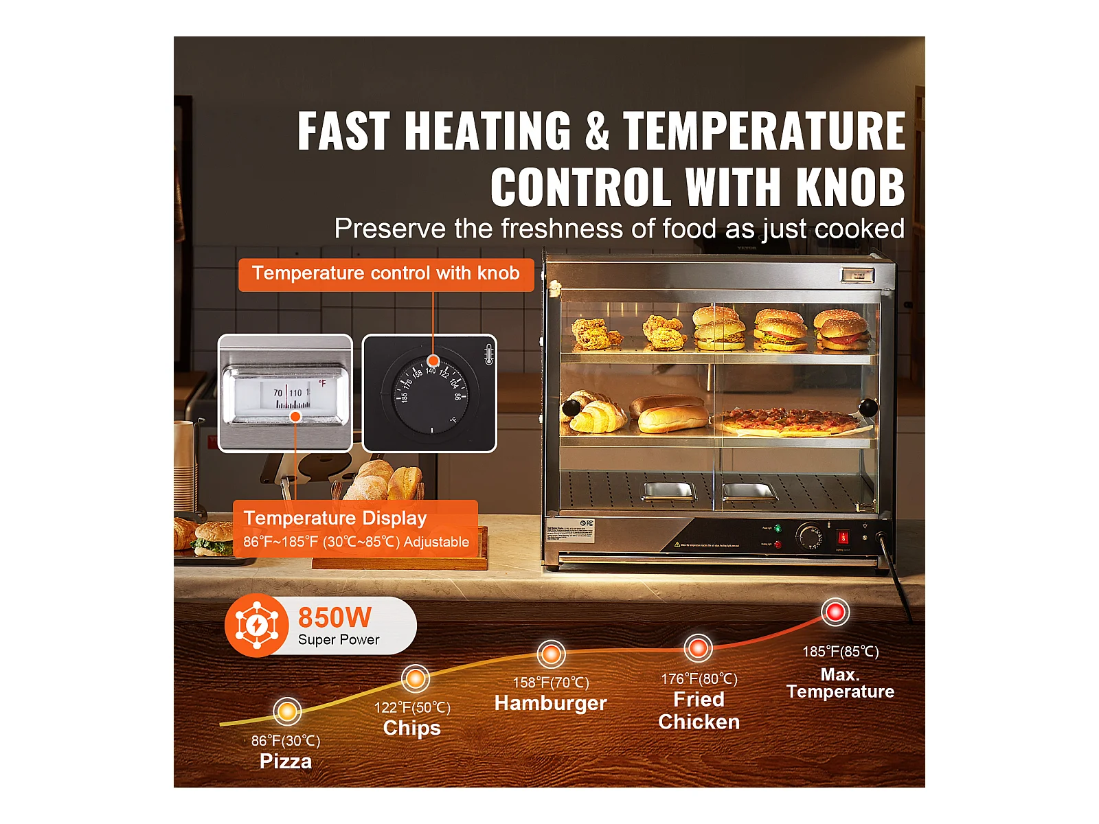 Vitrine Chauffante SucceBuy, Présentoir de Comptoir Chauffant Commercial à 2 Niveaux avec Pince pour Pizza, Contrôle de la Température de 30 ℃ à 85 ℃
