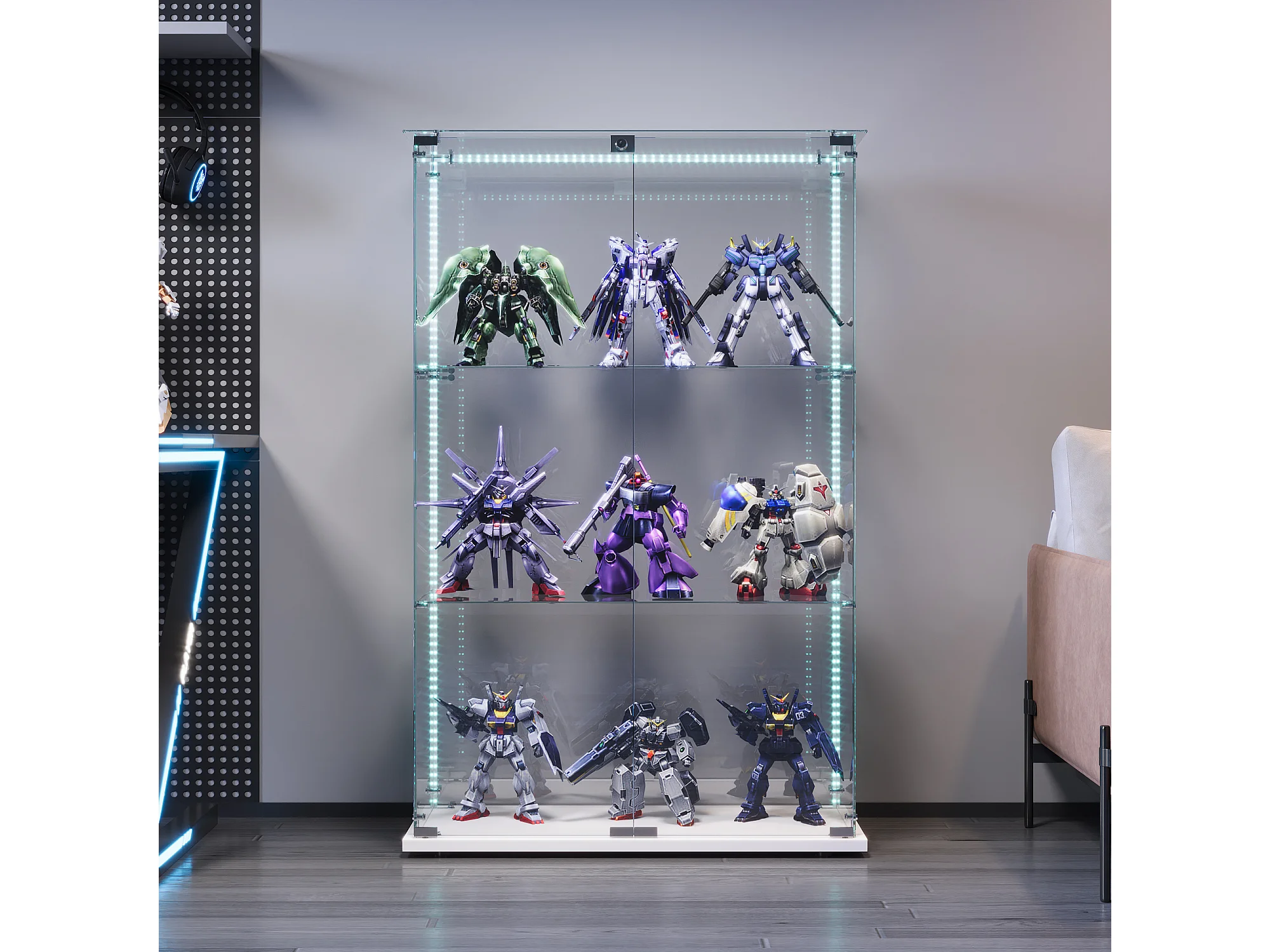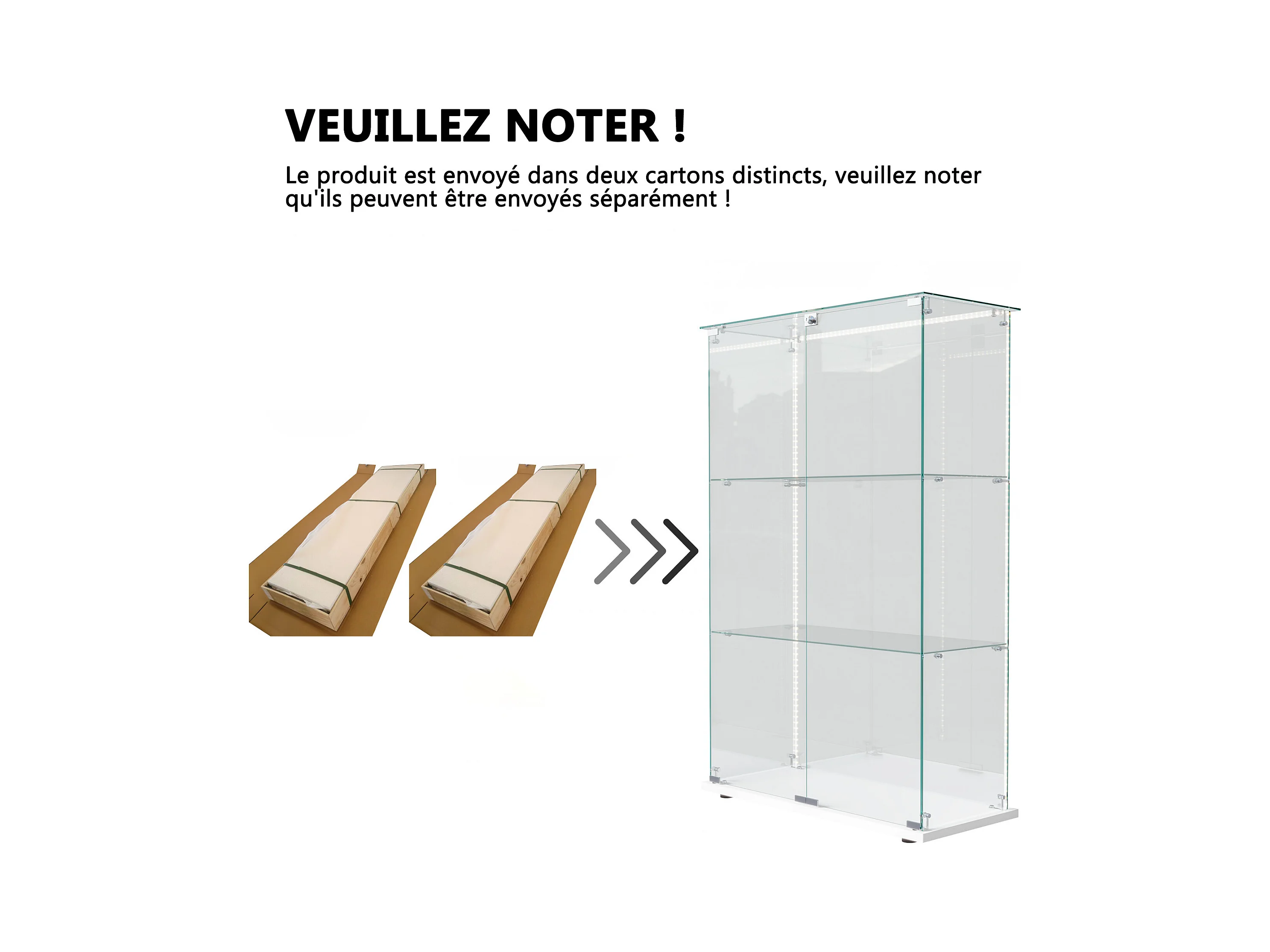 Vitrine en verre sur pied, LED, 2 portes avec serrure, 4 compartiments, pour collections et déco