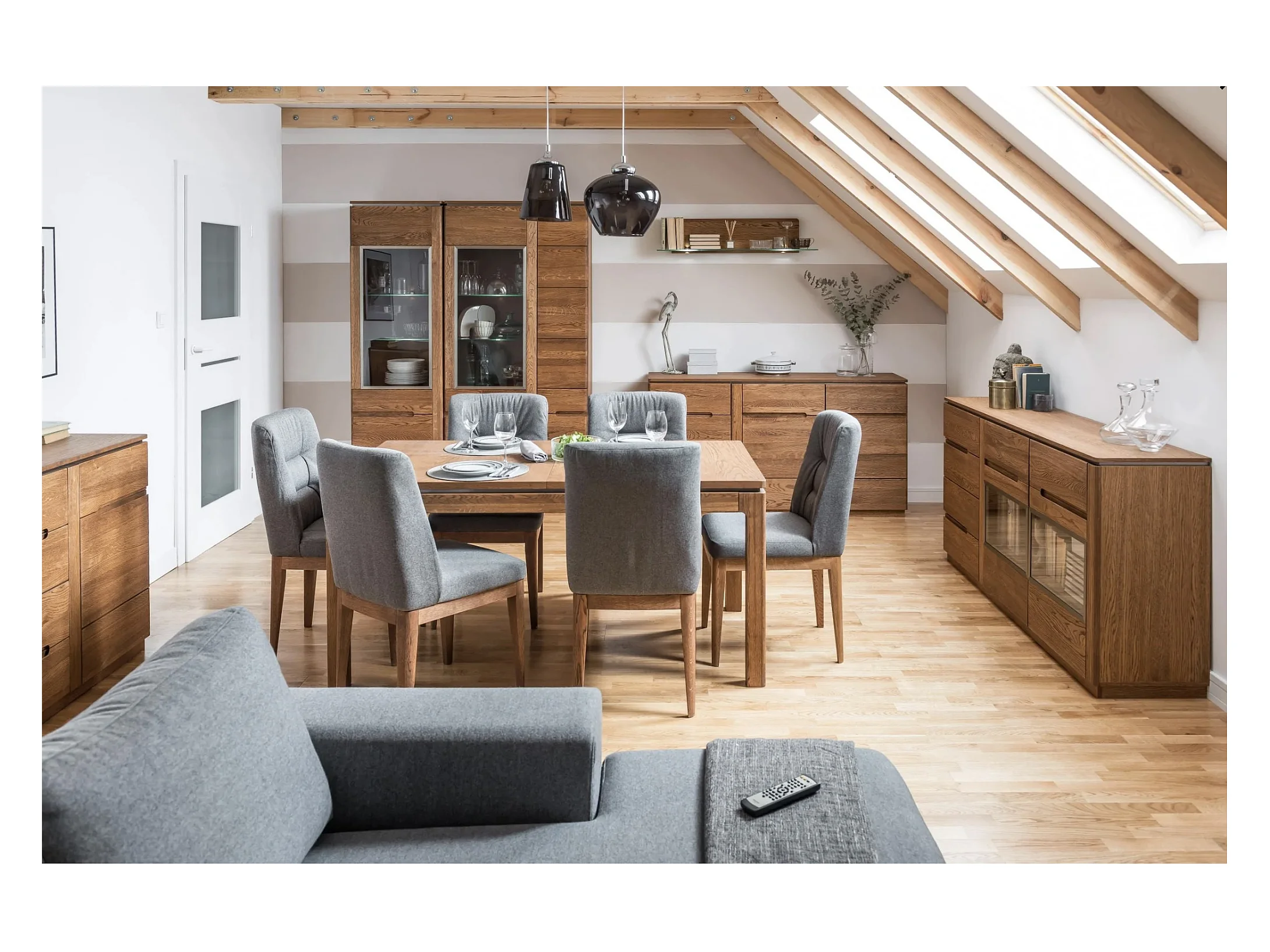 Toswa Vitrine 3 portes, 2 portes vitrées, 3 tiroirs, 2 espaces ouverts, naturel.