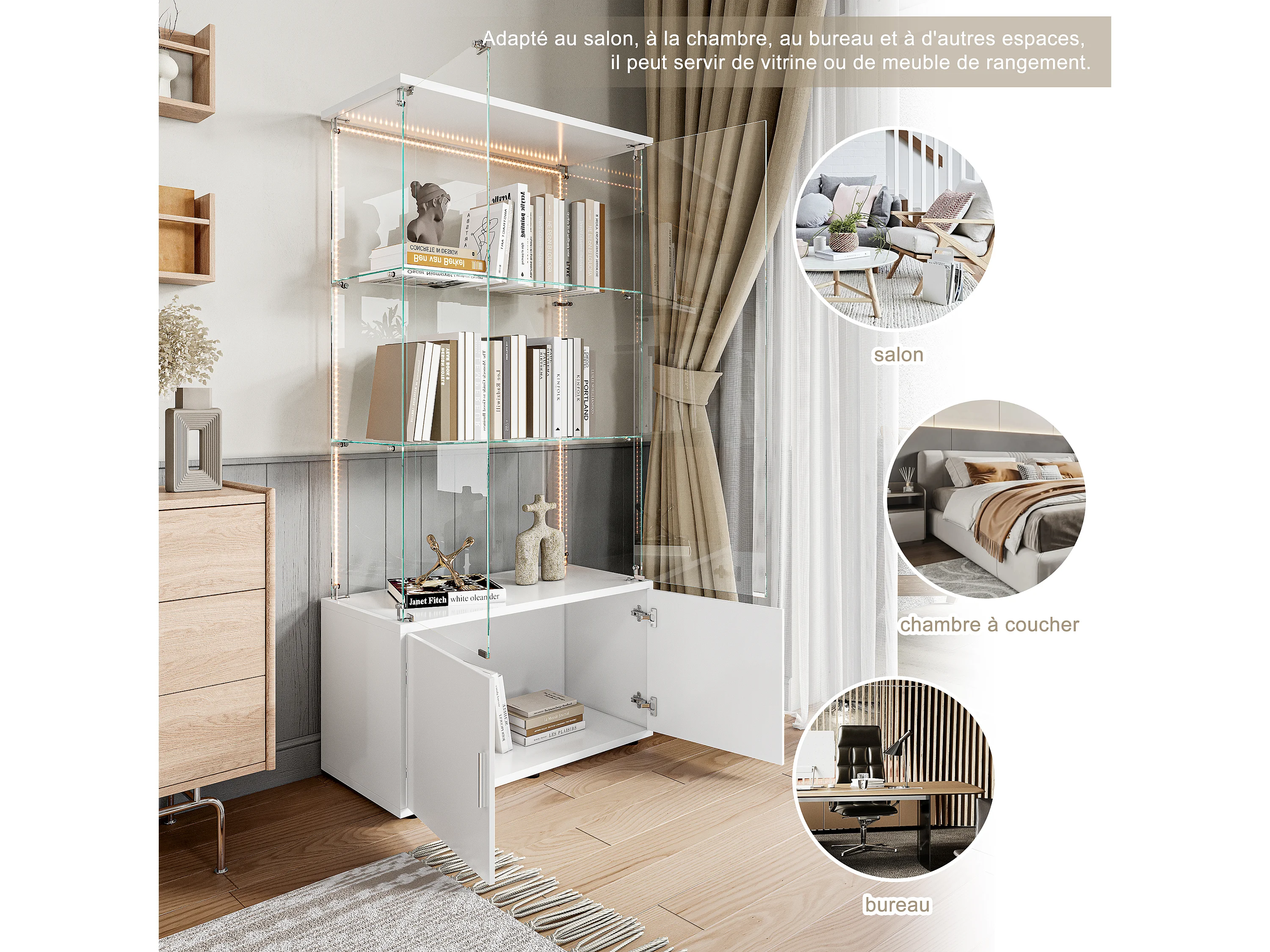 Vitrine en Verre avec LED, 4 Étagères et 4 Portes, 2 Étagères Adjustables, 164x78.51x35cm, Blanc
