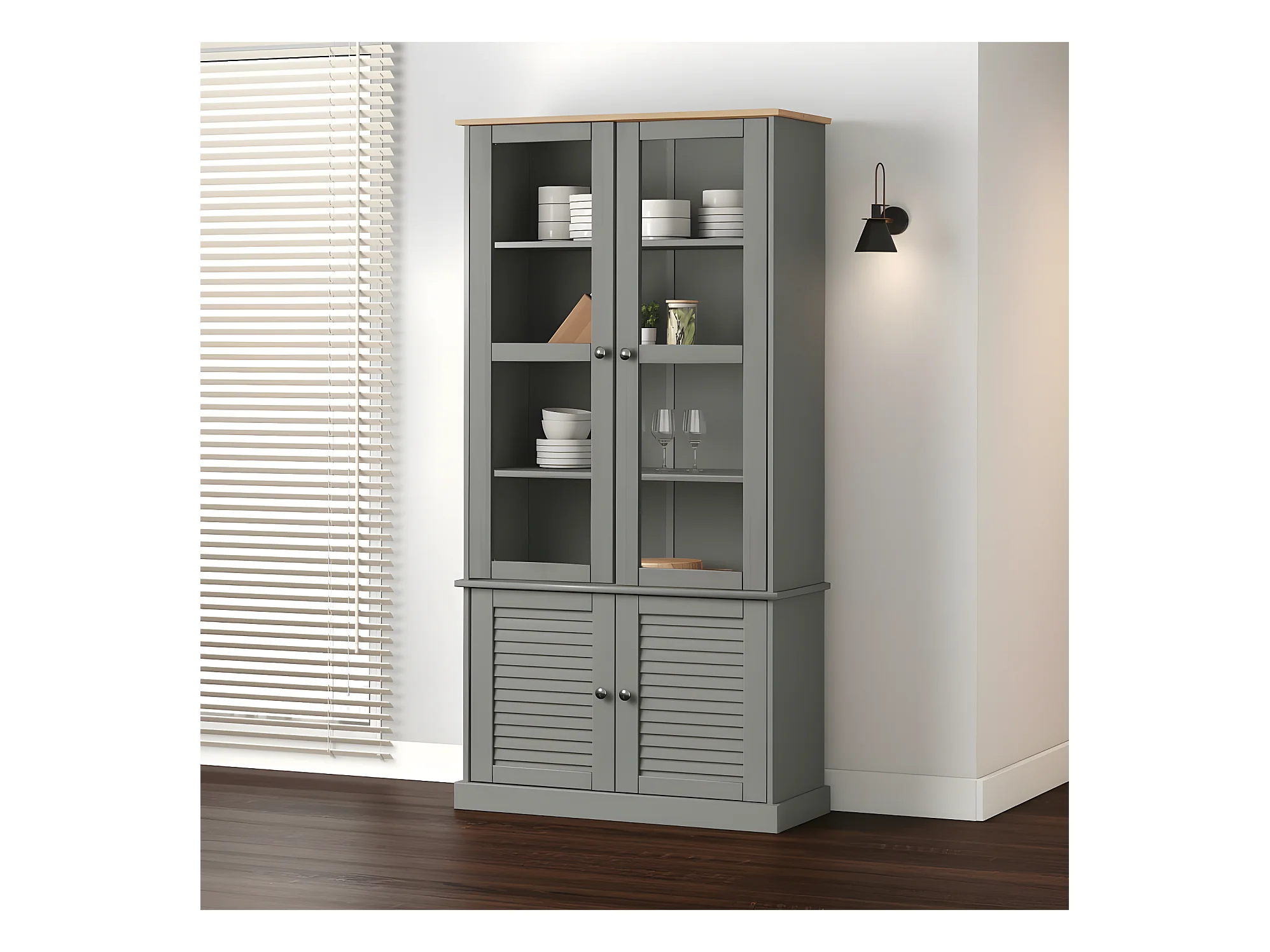 Vitrine 2 portes laqué gris et pieds chêne massif clair Pecas 79cm