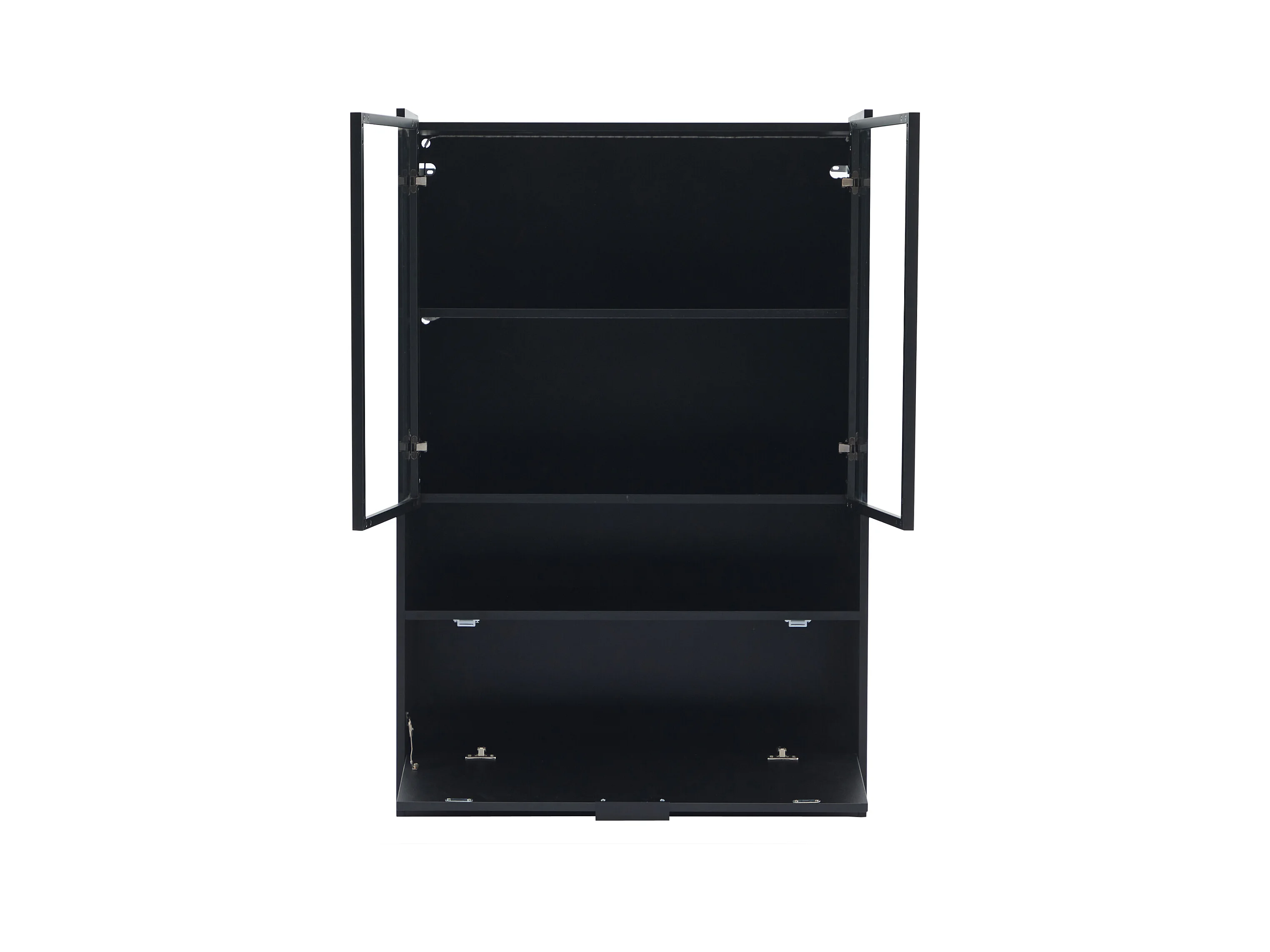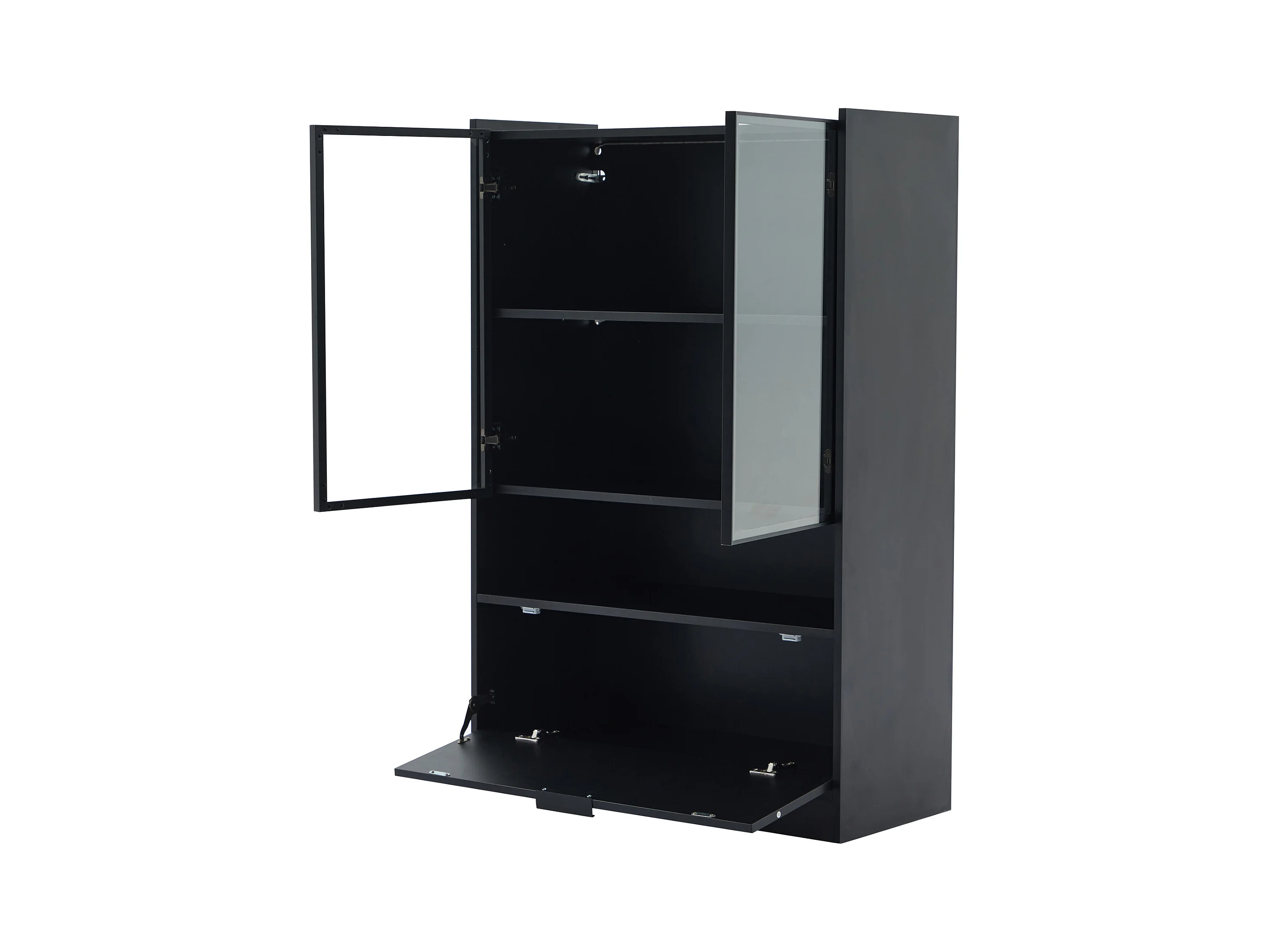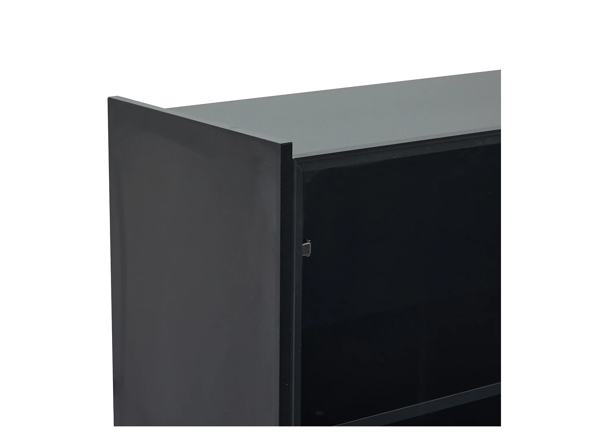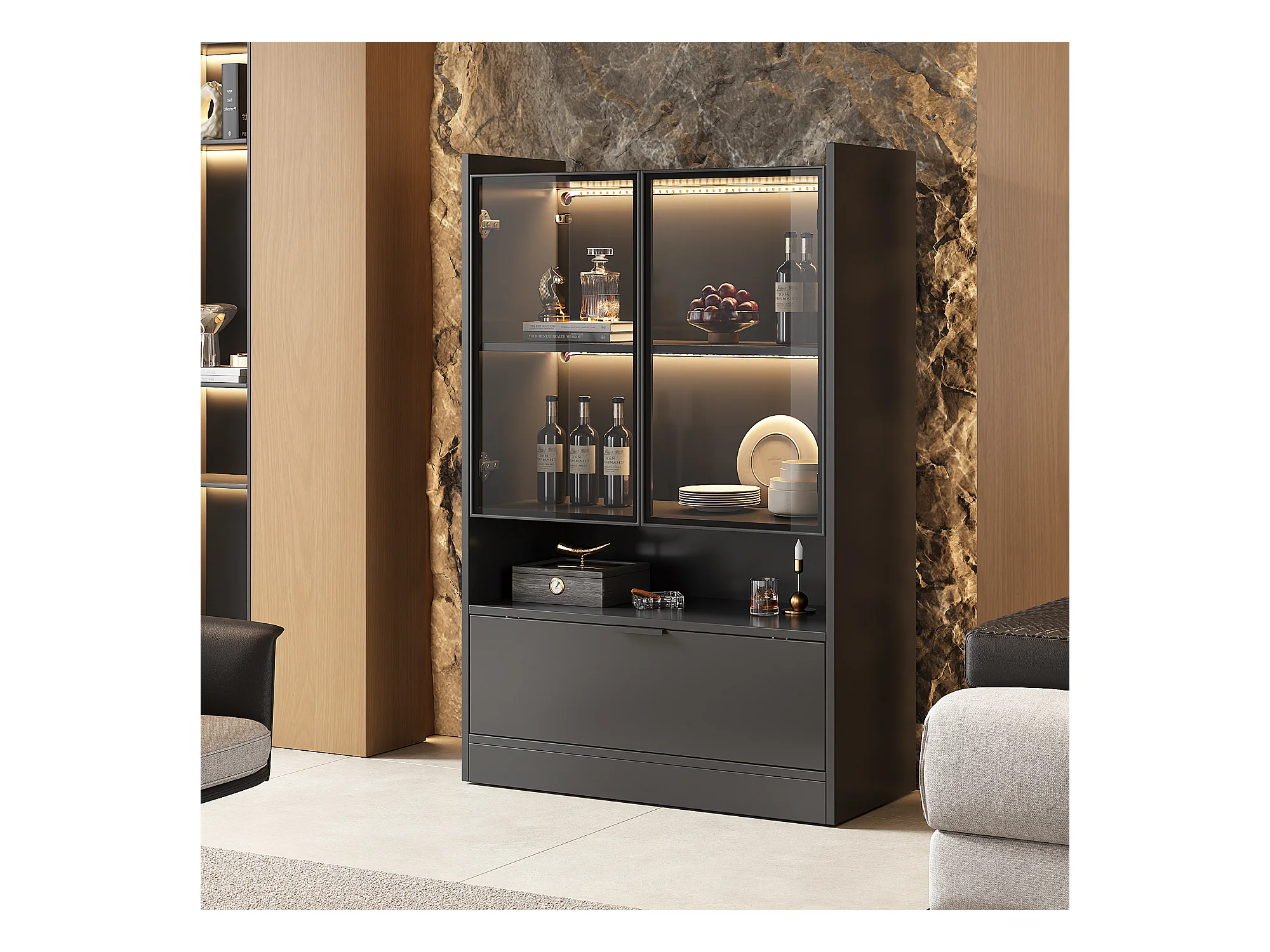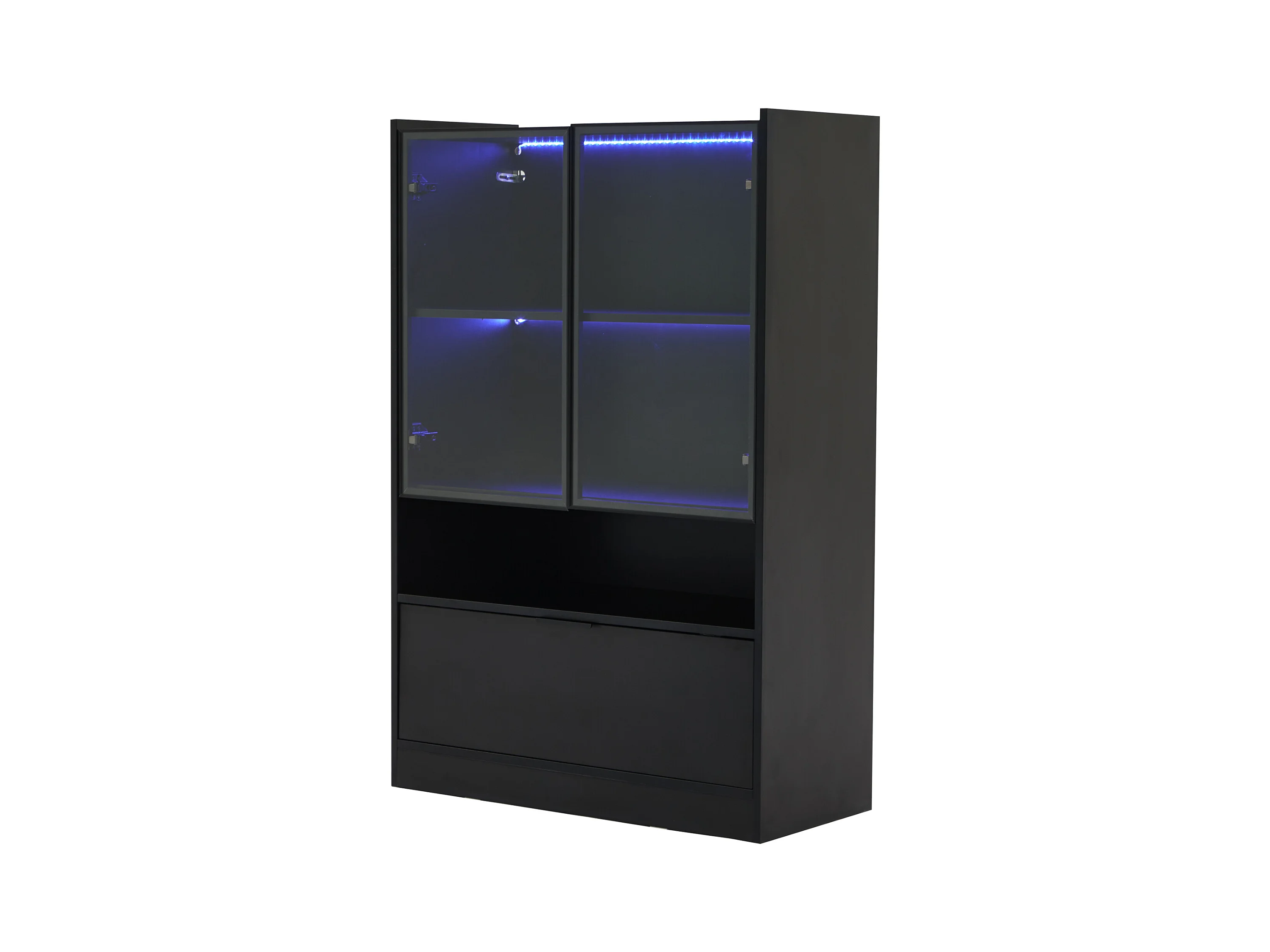 Vitrine LED avec 1 tiroir de rangement et 4 portes, étagères en verre - noir