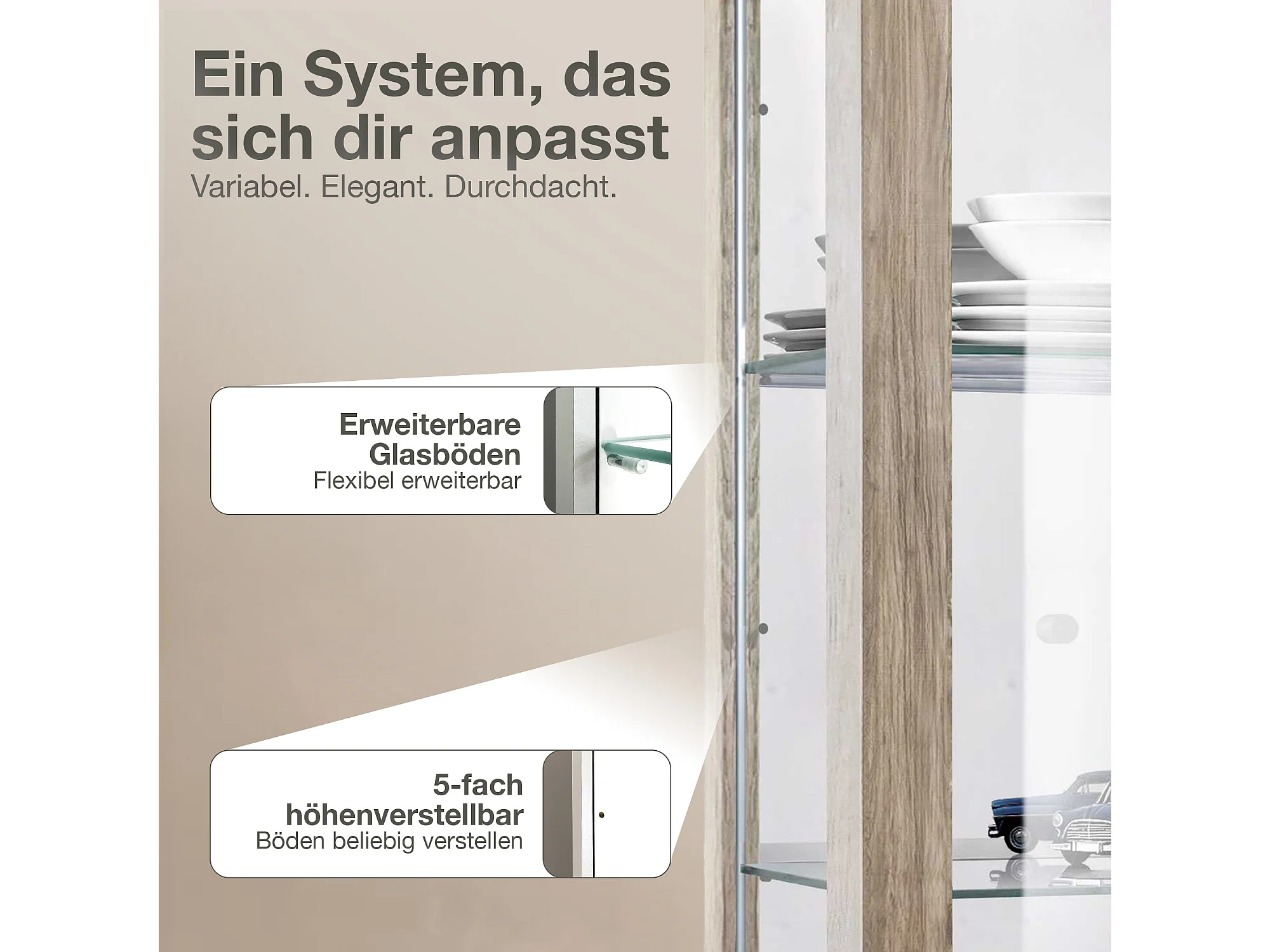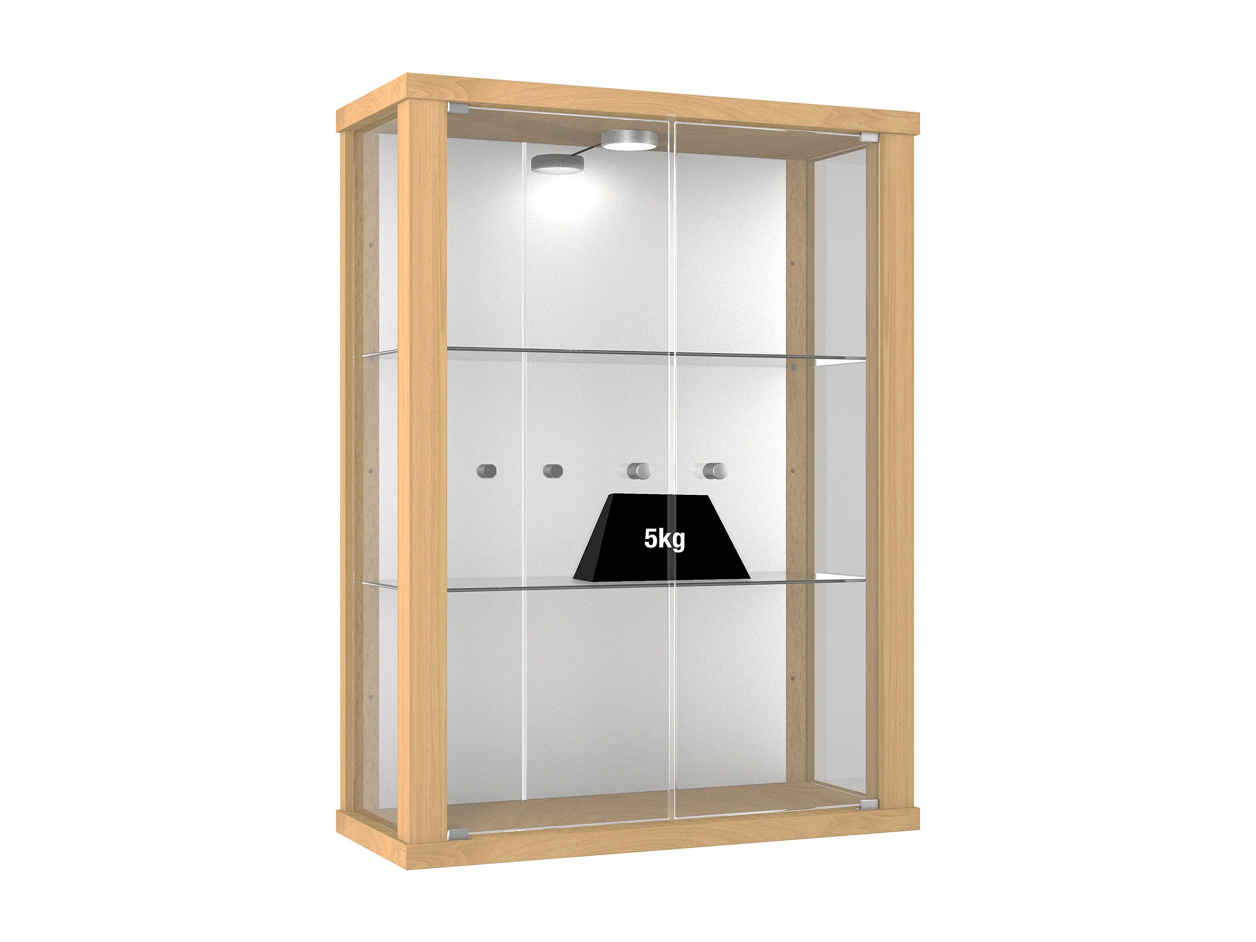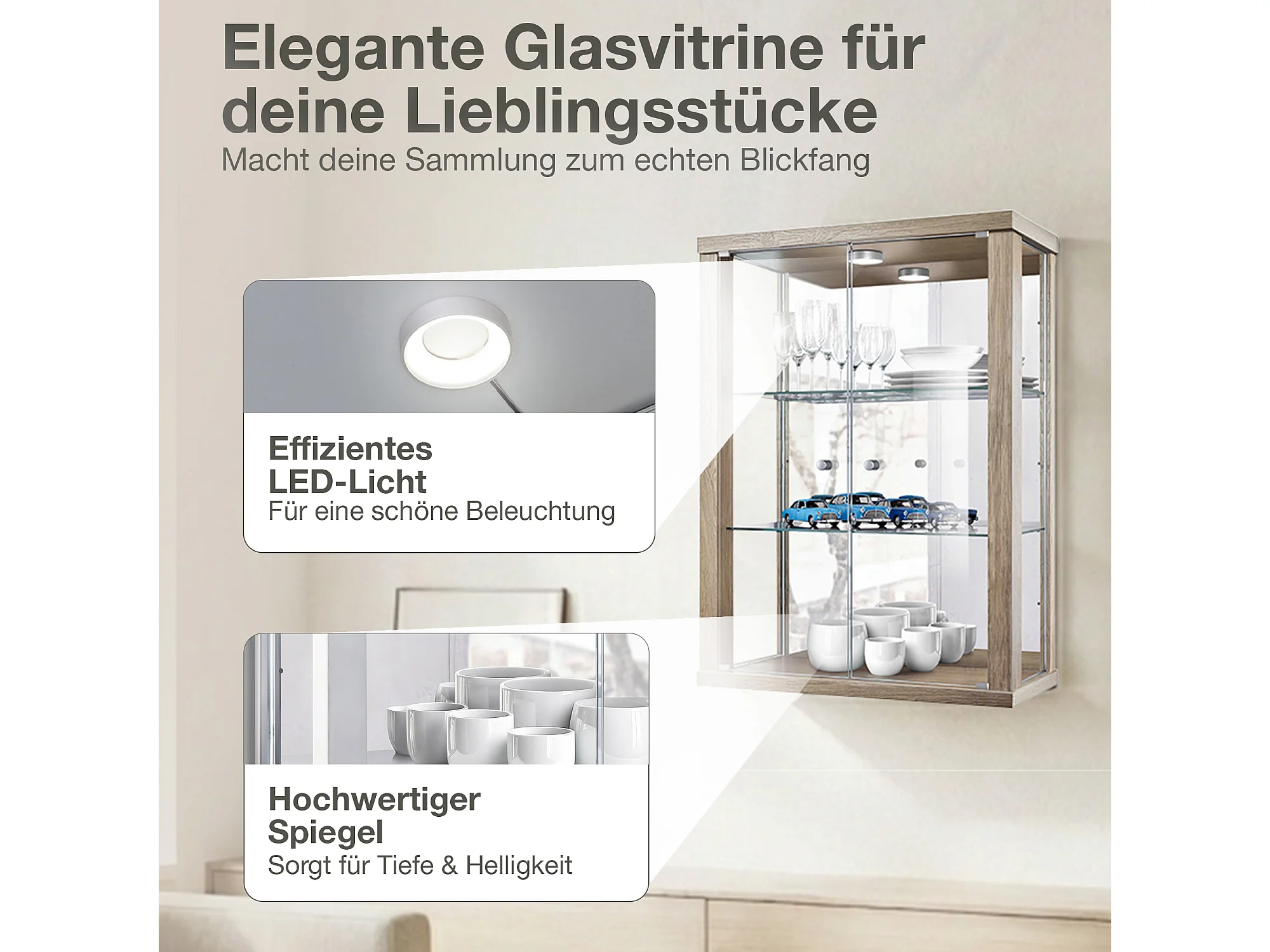 Vitrine murale avec 2 portes, 2 étagères en verre réglables en hauteur & miroir - Avec éclairage LED - 80x60x25 cm - Chêne Sonoma