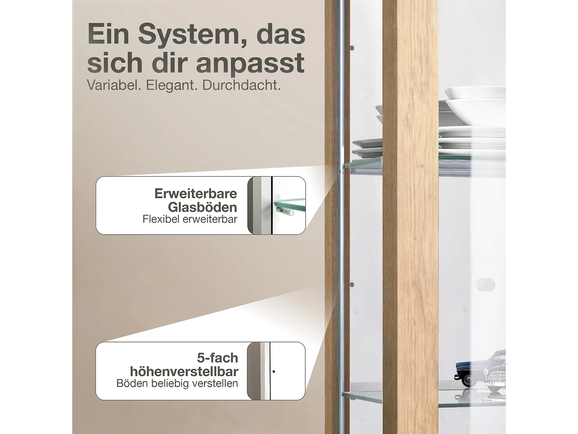 Vitrine murale avec 2 portes, 2 étagères en verre réglables en hauteur & miroir - Avec éclairage LED - 80x60x25 cm - Couleur hêtre