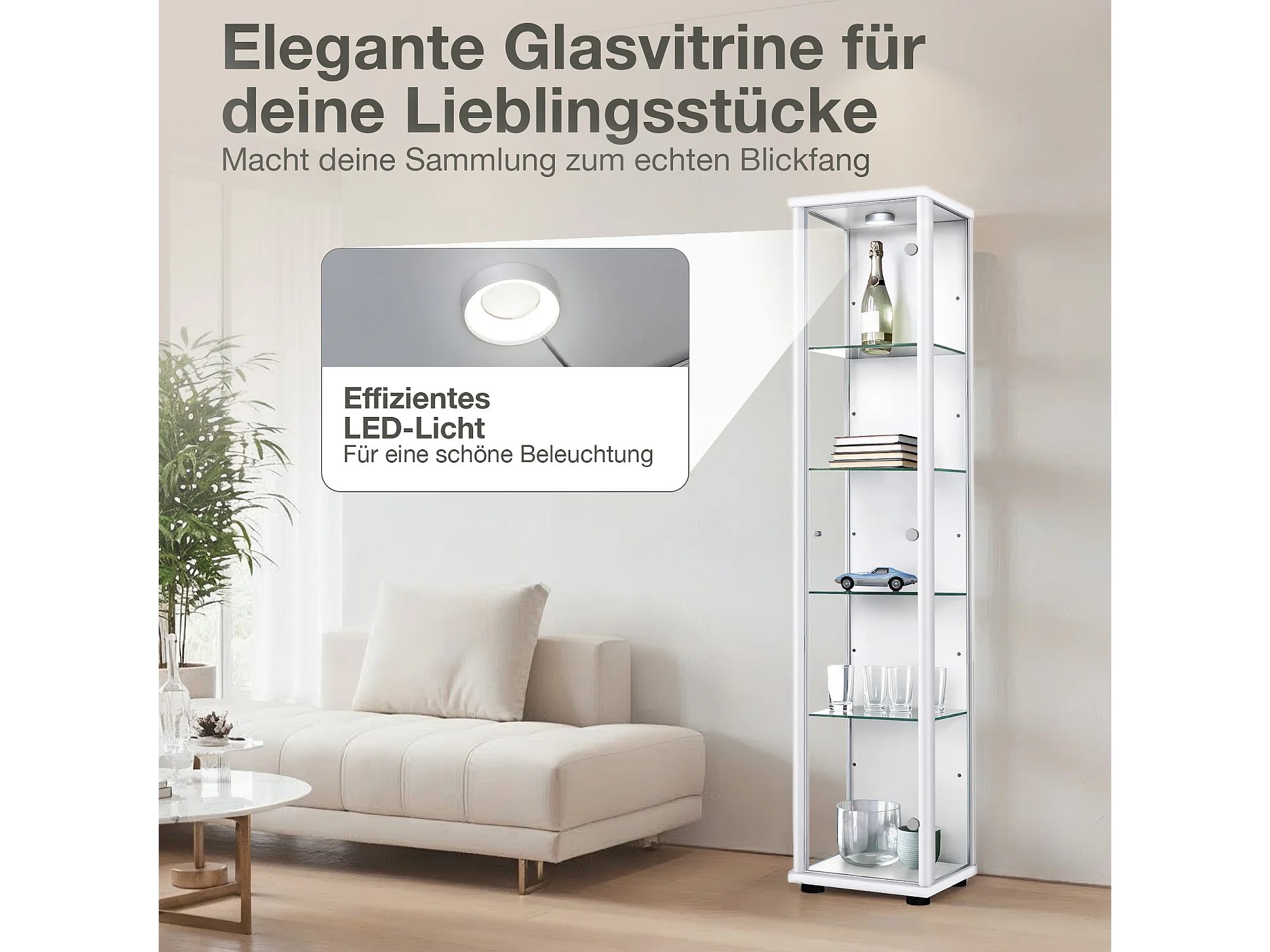 Vitrine sur pied avec 1 porte, 4 étagères en verre réglables en hauteur - Avec éclairage LED - 176x37x33 cm - Blanc