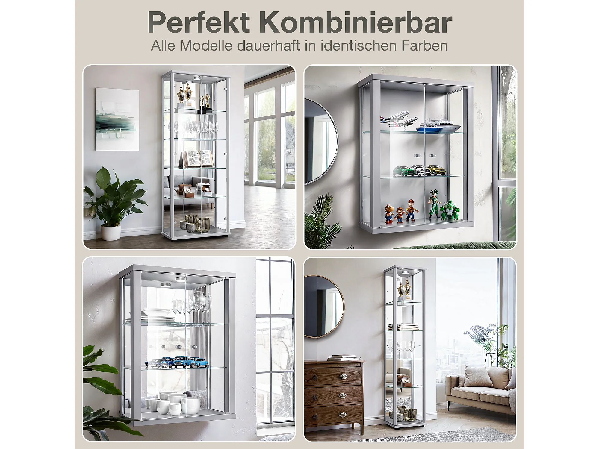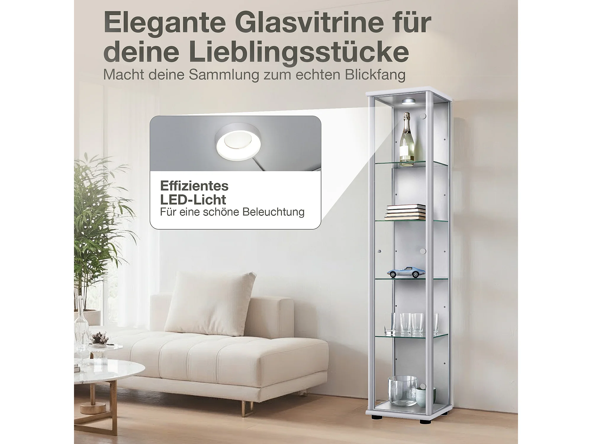 Vitrine sur pied avec 1 porte, 4 étagères en verre réglables en hauteur - Avec éclairage LED - 176x37x33 cm - Couleur argentée
