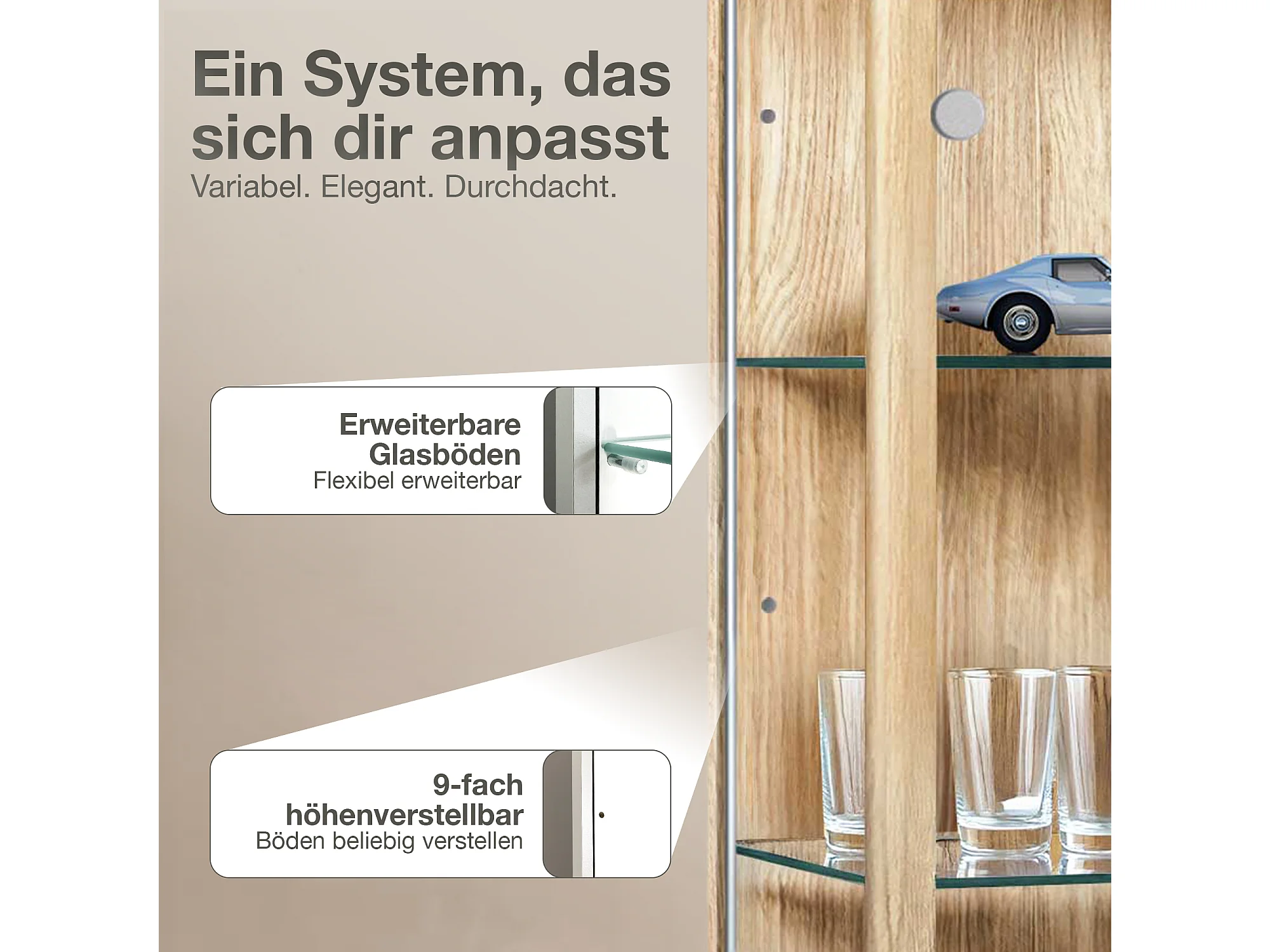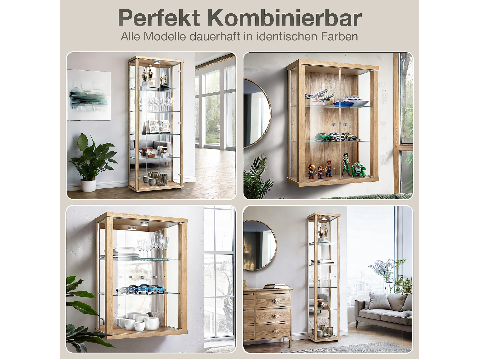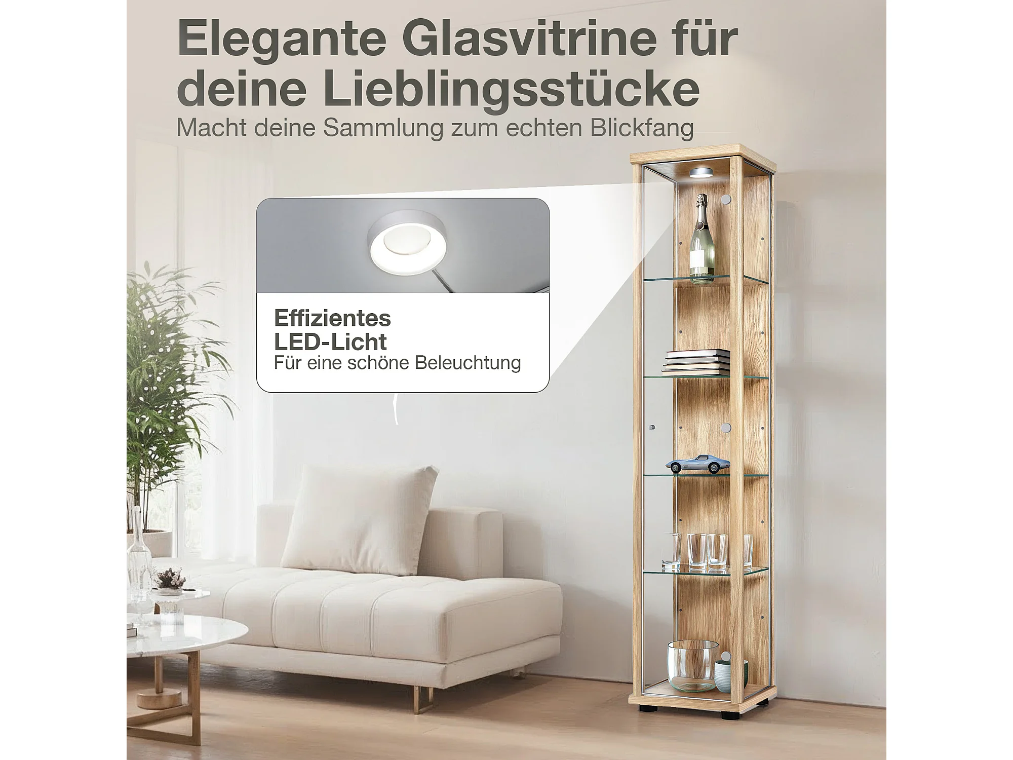 Vitrine sur pied avec 1 porte, 4 étagères en verre réglables en hauteur - Avec éclairage LED - 176x37x33 cm - Couleur hêtre