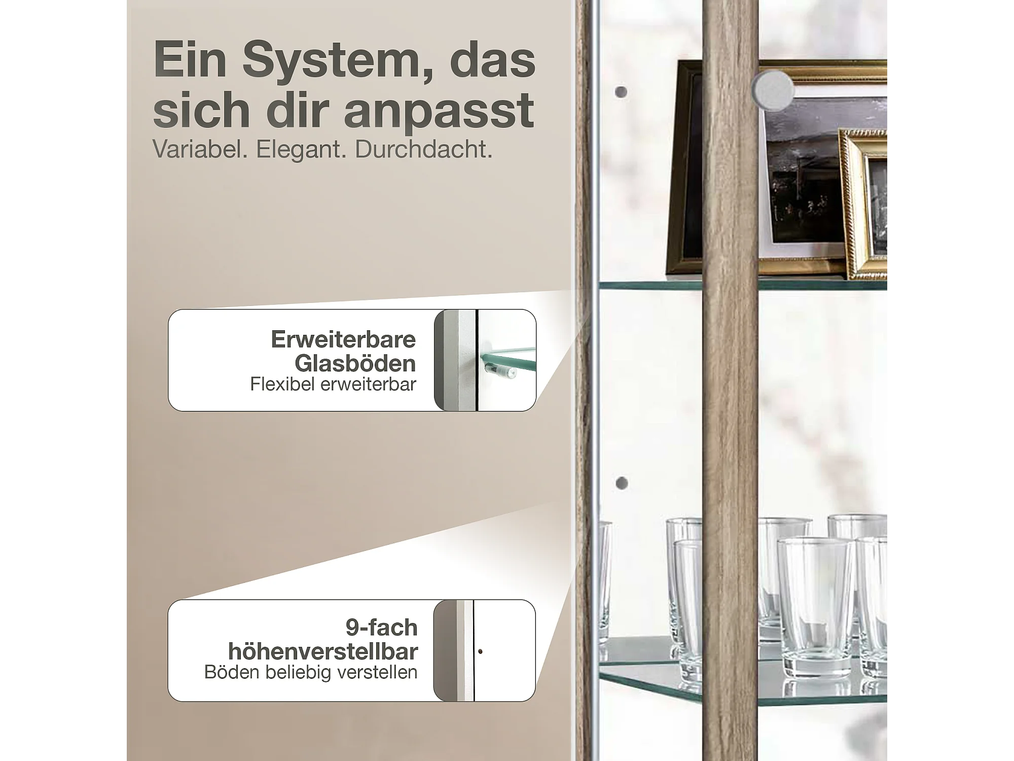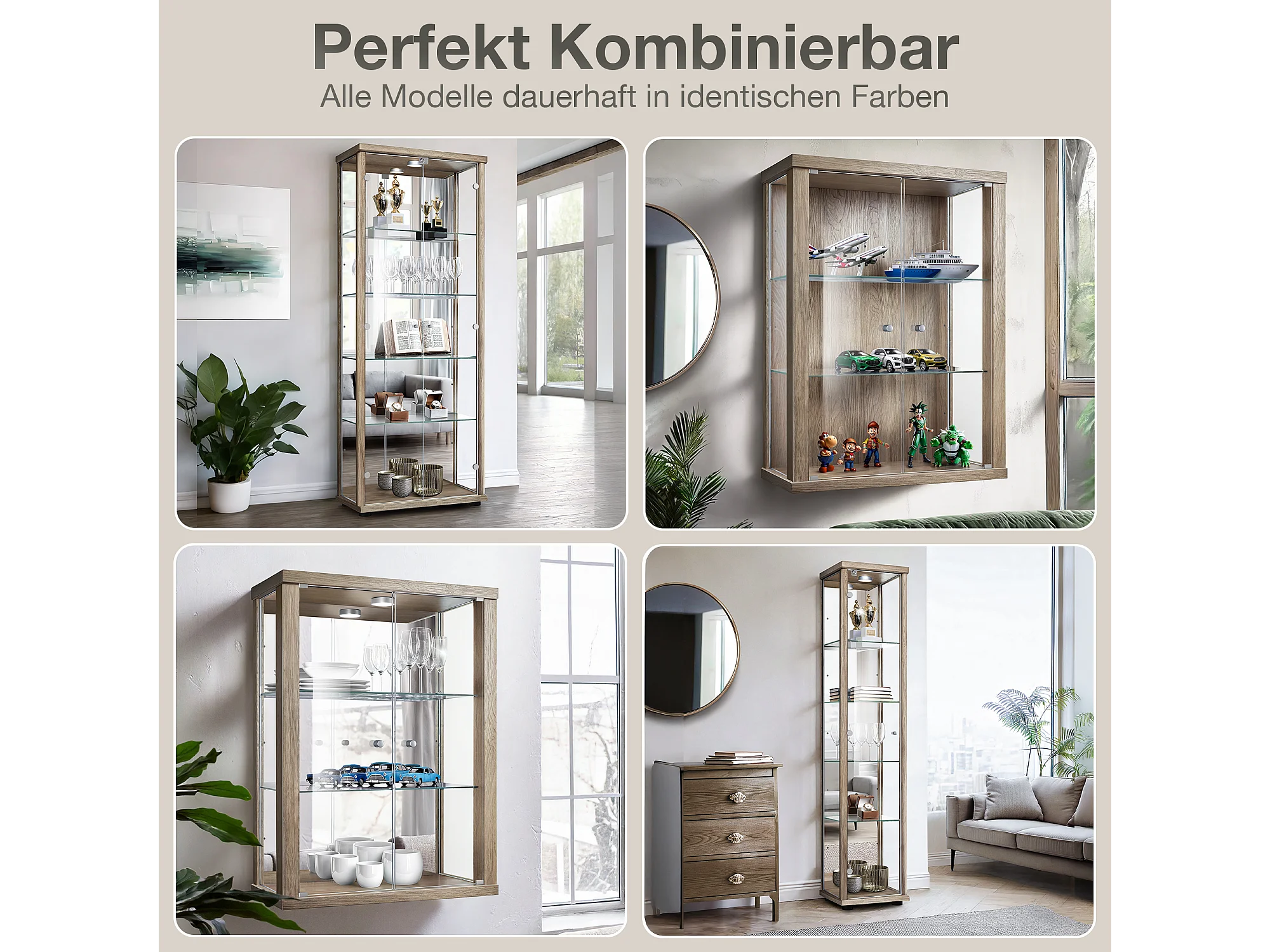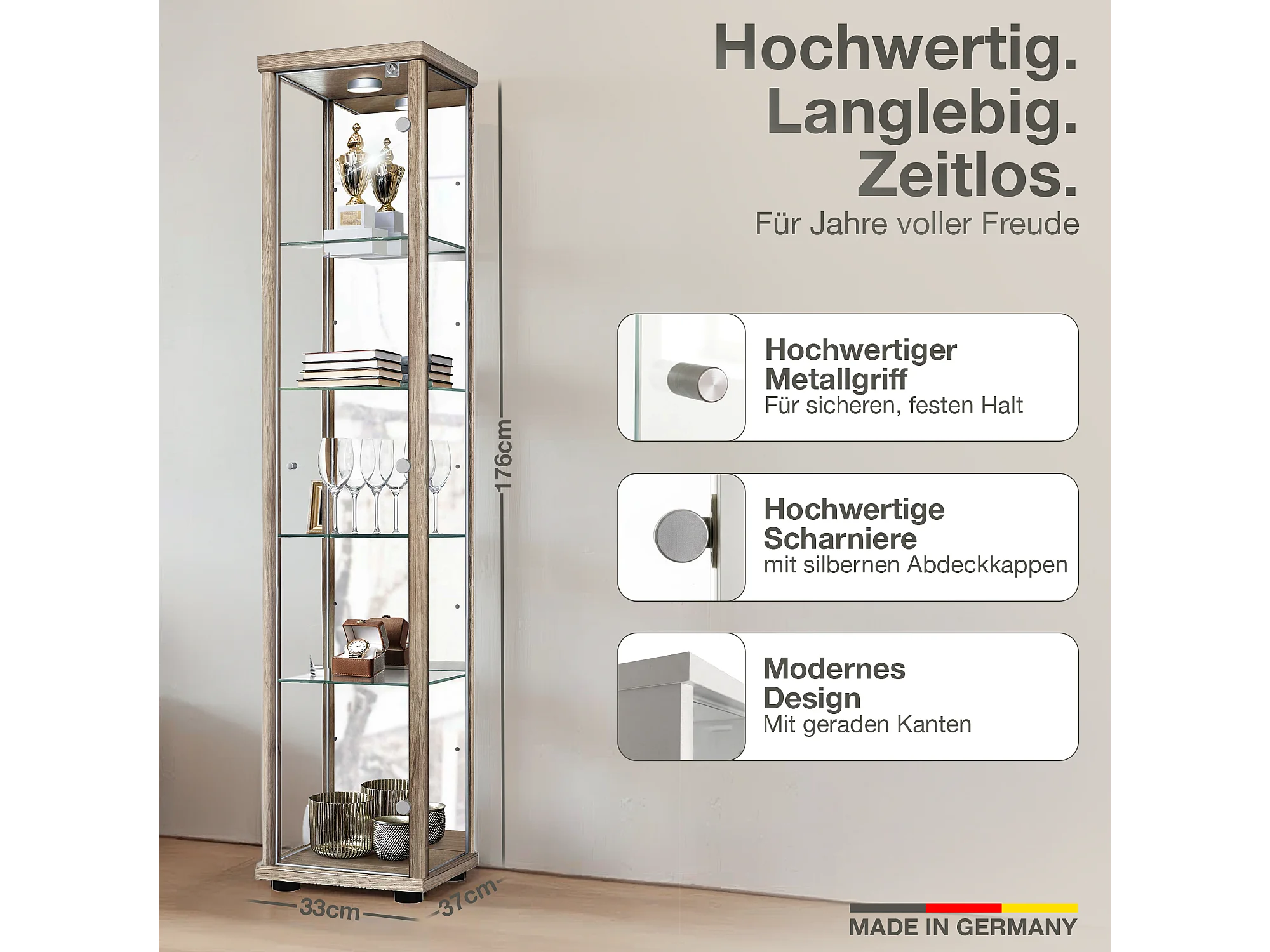 Vitrine sur pied avec 1 porte, 4 étagères en verre réglables en hauteur, miroir & serrure - Avec éclairage LED - 176x37x33 cm - Chêne Sonoma