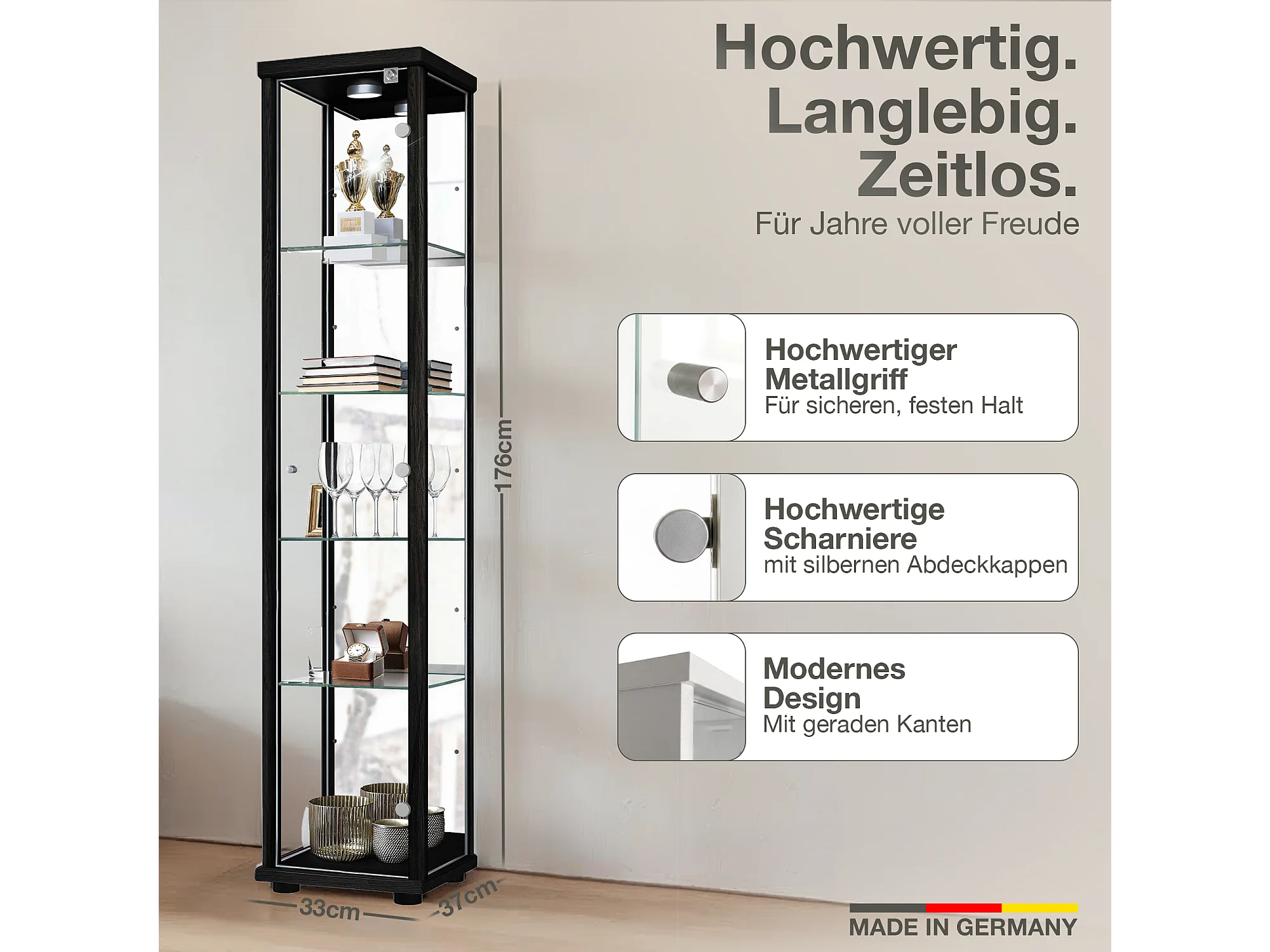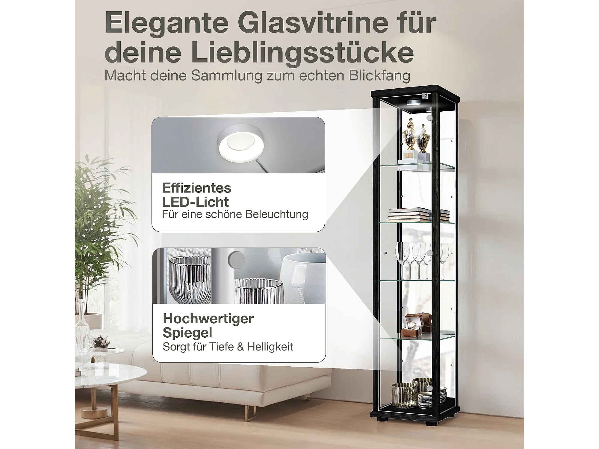 Vitrine sur pied avec 1 porte, 4 étagères en verre réglables en hauteur, miroir & serrure - Avec éclairage LED - 176x37x33 cm - Noir