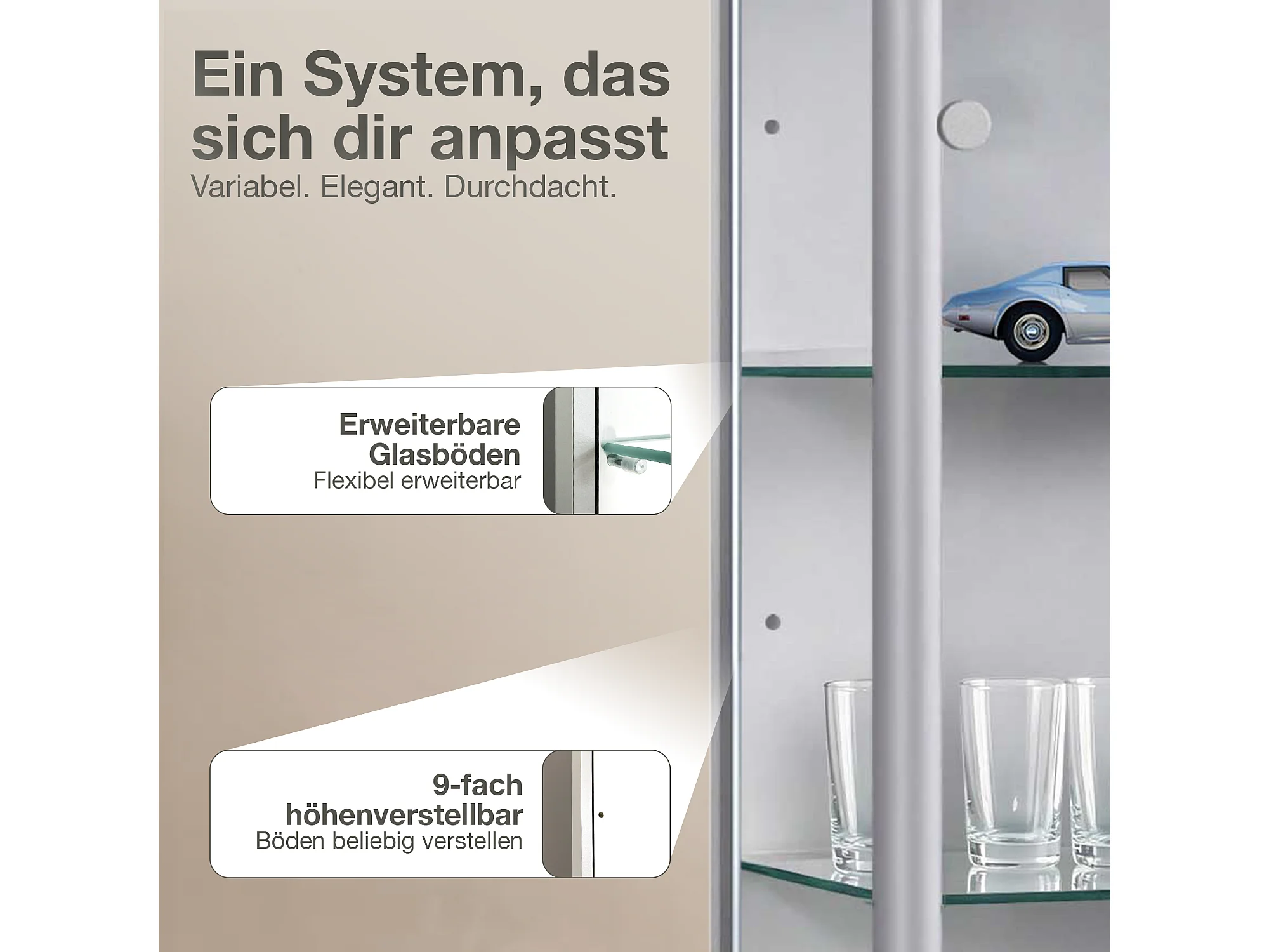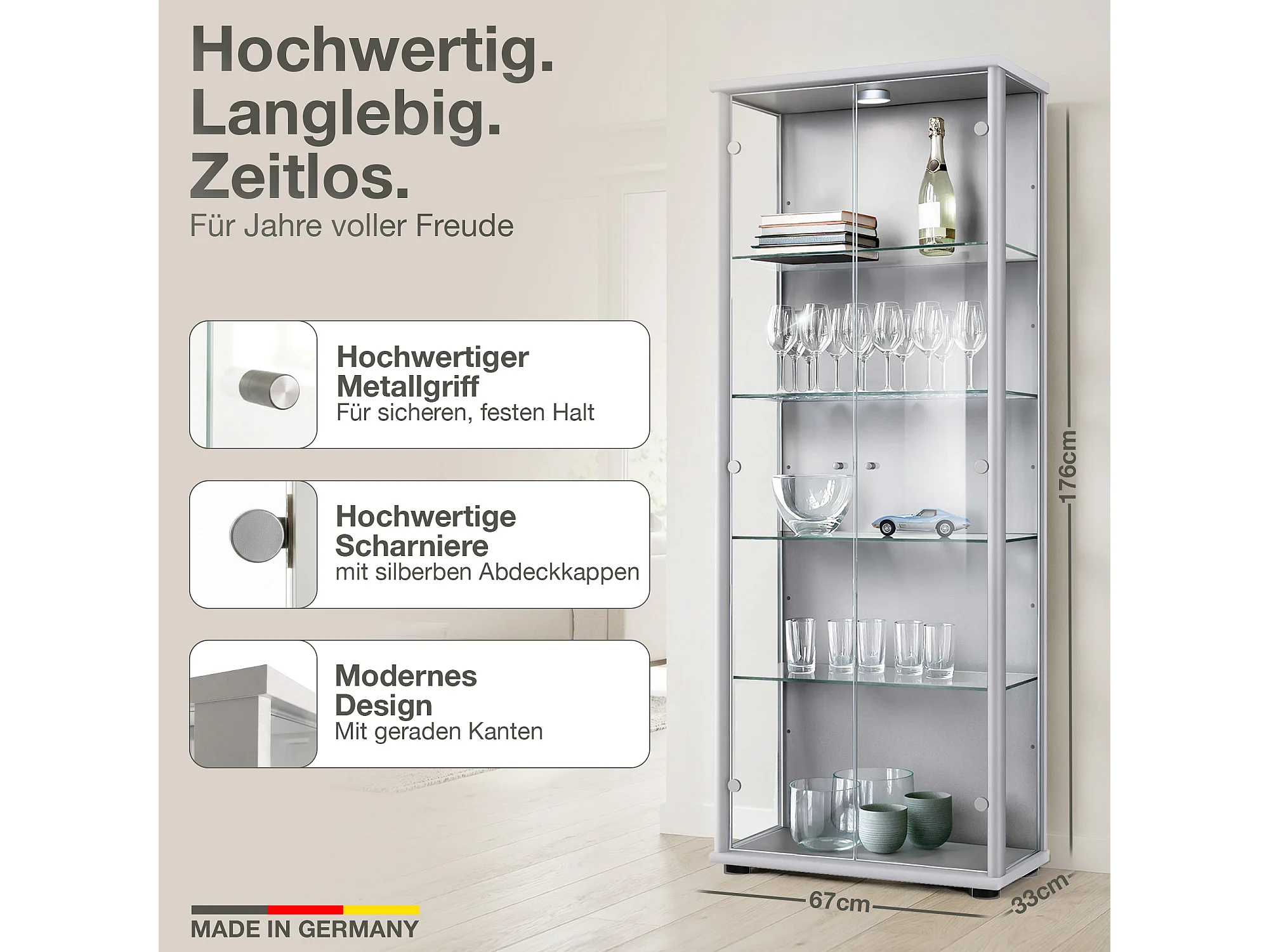 Vitrine sur pied avec 2 portes, 4 étagères en verre réglables en hauteur - Avec éclairage LED - 176x67x33 cm - Couleur argentée