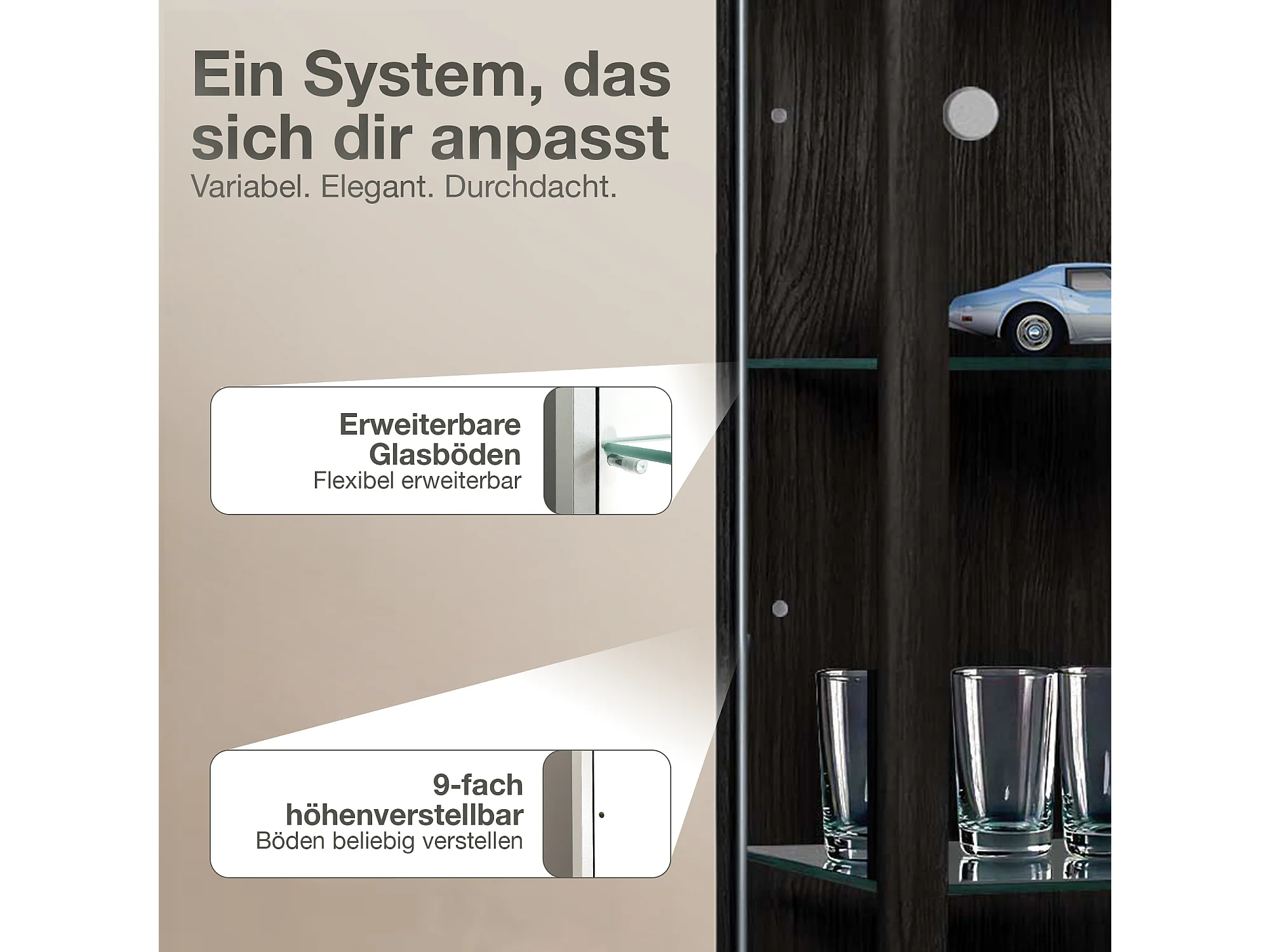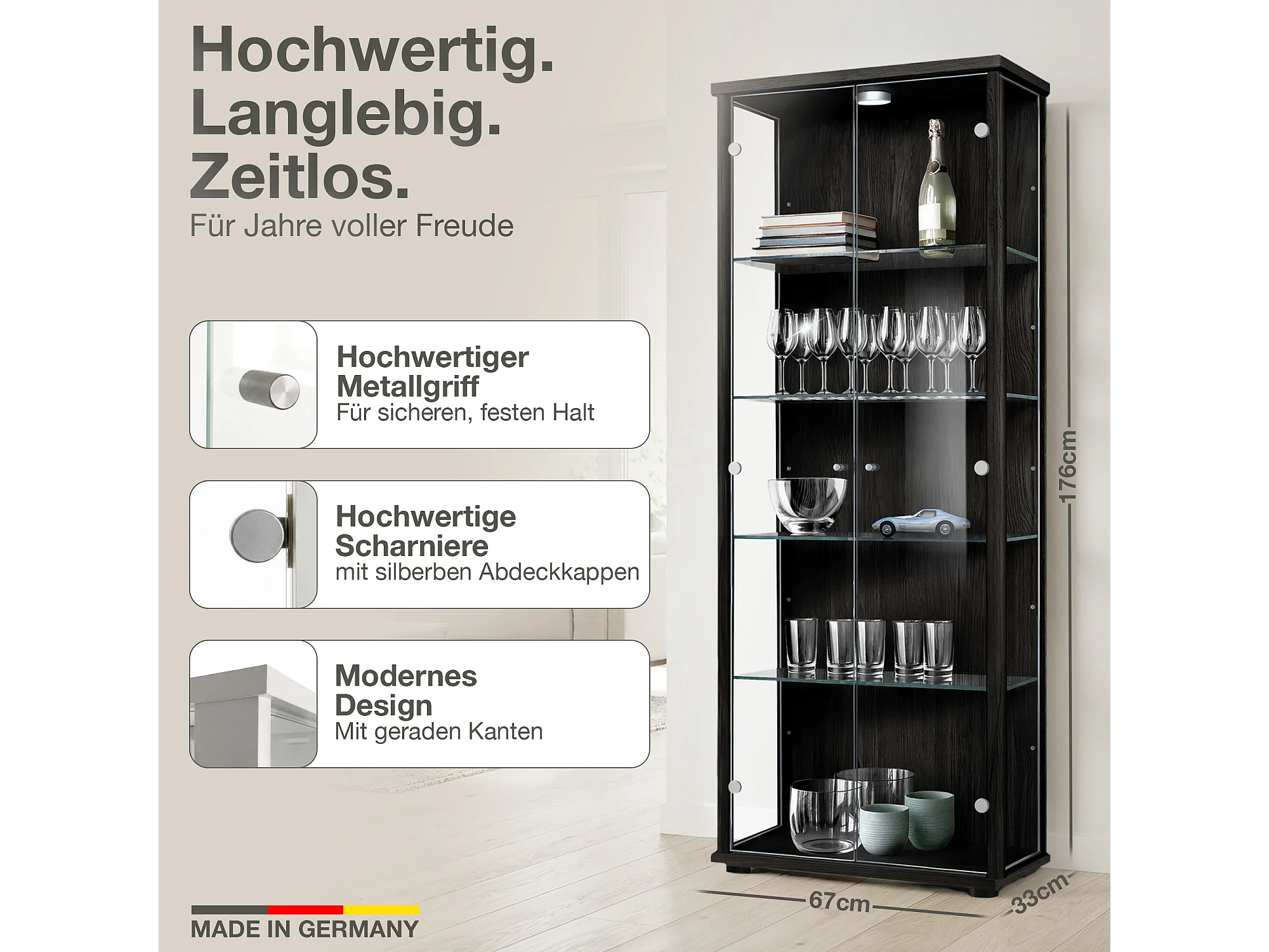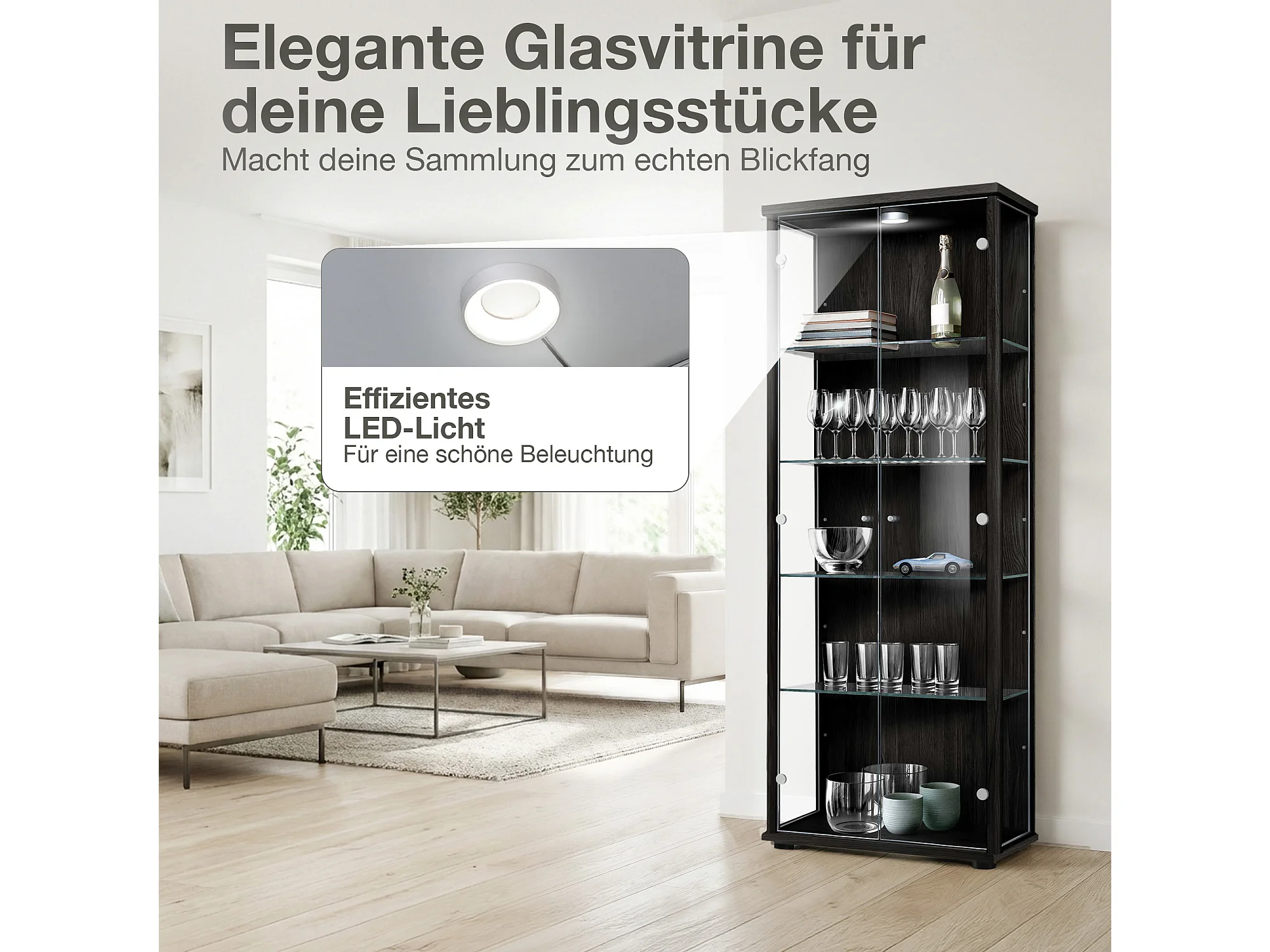 Vitrine sur pied avec 2 portes, 4 étagères en verre réglables en hauteur - Avec éclairage LED - 176x67x33 cm - Noir