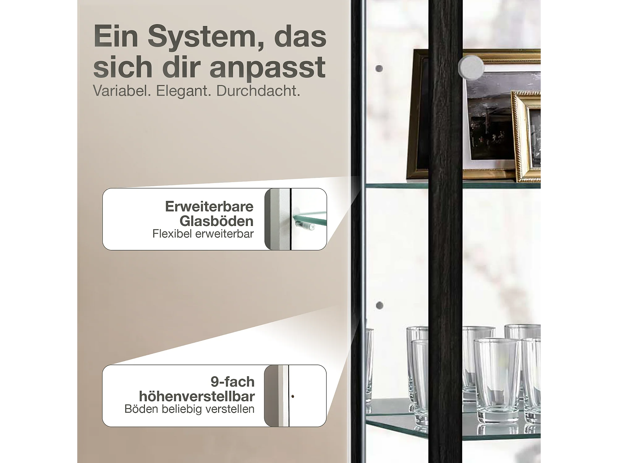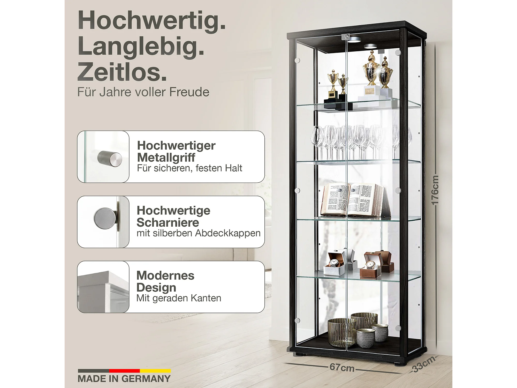 Vitrine sur pied avec 2 portes, 4 étagères en verre réglables en hauteur, miroir & serrure - Avec éclairage LED - 176x67x33 cm - Noir